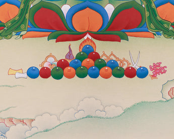 Encounter the timeless calm of the hand-painted Buddha Amitayus Thangka, a luminous piece made with devotion in our Enlightenment Studio. Created from fine cotton using natural Lhasa stone pigments and 24K gold, this thangka radiates with spiritual light and divine energy. The stone pigments ensure lasting vibrancy and depth, while the gold accents accentuate sacred details, vividly capturing the presence of Buddha Amitayus. Made in the traditional Karma Gadri style, known for its peaceful composition, detailed linework, and harmony, this thangka blends artistry with spiritual significance, blessing any sacred space.
