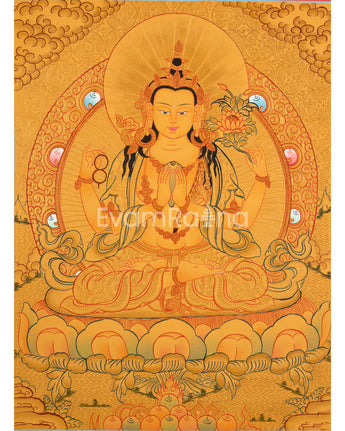 Chenrezig, a bodhisattva in Tibetan Buddhism, appears in gold-encrusted thangka paintings. This thangka is adorned with intricate gold detailing, which represents Chenrezig's enlightened qualities and brightness. The gold technique elevates Chenrezig's portrayal, emphasizing his transcendent nature and spiritual power. It also emphasizes the importance of Chenrezig's teachings and the desire for spiritual transformation. Chenrezig's compassionate gaze, serene expression, and graceful posture are highlighted, creating an attractive and awe-inspiring representation.