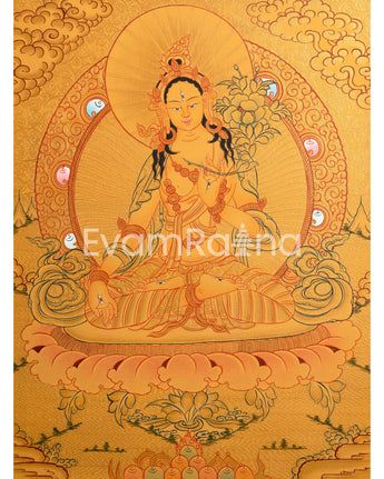 This exquisite White Tara thangka in gold is a traditional Tibetan painting depicting the Buddhist deity Tara, also known as the Goddess of Compassion and Longevity. The painting depicts a figure resting on a lotus throne, representing meditative stability and grace. White Tara has seven eyes, with additional eyes on her forehead, hands, and soles, representing her ability to observe and relieve pain. The Full Gold Style thangka of White Tara really highlights the specific parts, providing richness and luminosity. The thangka's rich details and brilliant colors make it a visually appealing work of art with spiritual significance, evoking contemplation and dedication from practitioners and viewers.