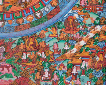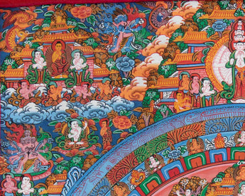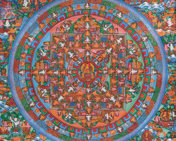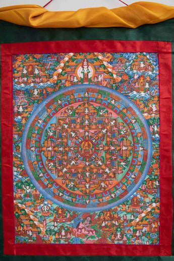 Introducing our Hand-Painted Original Buddha Mandala Thangka, a colorful masterpiece with a classic and simple brocade frame. The Buddha Mandala represents unity and spiritual completeness through its intricate details and vibrant colors. At the center, Buddha radiates unity and spiritual completeness, surrounded by intricate details and vibrant colors. Avalokiteshvara graces the top, and as you gaze deeper, you discover numerous other deities intricately woven into the mandala. Encased in its refined brocade frame, it goes beyond being just art, it's a reminder of interconnectedness and a gateway for self-reflection and spiritual awakening. Embrace its spiritual essence, letting the mandala bring a sense of calm and mindfulness to your space. Feel the calm and mindfulness it brings to your space, making it a cozy spot for reflecting on things.