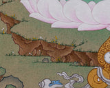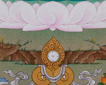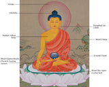 The Peaceful Deity Shakyamuni Buddha Thangka is a sacred artwork that depicts Siddhartha Gautama, the historical Buddha. It is painted on cotton canvas, providing a base for its detailed design. Earthy tones derived from natural stone colors impart a warm, organic appearance to the piece and enhance its spiritual ambiance. Authentic 24K gold accents are meticulously applied, emphasizing key features of the Buddha and imparting a divine radiance that boosts its sacredness.