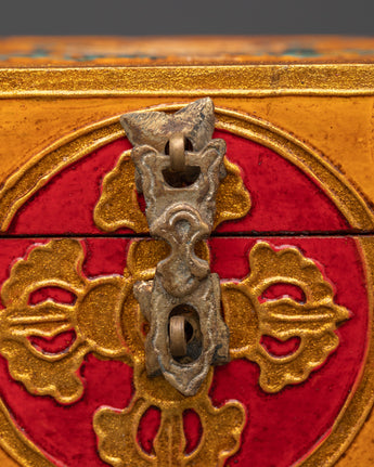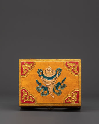 This hand-painted Tibetan treasure box demonstrates a harmonious blend of spiritual symbolism and Himalayan artistry. Made from solid wood and meticulously hand-painted with vivid acrylic colors, it showcases a striking red and golden-yellow color scheme adorned with traditional Tibetan designs. The focal point of the design is the sacred conch shell, one of the Eight Auspicious Symbols in Tibetan Buddhism, symbolizing the resonant voice of Dharma and spiritual enlightenment.