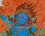 Wrathful Vajrapani Thangka, a hand-painted depiction of the Tibetan Protector Deity. Vajrapani, the embodiment of enlightened power, can be observed here in his wrathful form, radiating fierce compassion and determination to remove obstacles from the path of spiritual seekers.