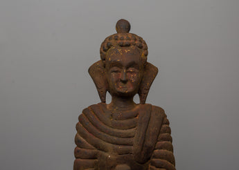 The statue's distinctive hand-carved features set it apart from more traditional representations. The Buddha's face and hands have fine detailing, which emphasizes the craftsmanship. The natural aging of the wood with a crack at the front gives the figure an air of authenticity and history, elevating it beyond a work of art to a spiritual artifact. The large statue is supported by a minimalist base, which gives it a grounded presence while keeping the focus on the figure itself. This wooden Amitabha Buddha is not only a stunning work of art, but also a potent spiritual symbol, ideal for those seeking a timeless reminder of wisdom, peace, and enlightenment.