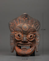 This hand-carved mask features a powerful and expressive face, often used for ceremonial or protective purposes. It is 27 cm high and 20.5 cm wide and crafted from wood, showcasing intricate detailing. The figure's large, bulging eyes give it a fierce, intense look, exuding wrathful energy. The crown at the top signifies authority or divine power, while the urna at the forehead adds a symbolic element. In Buddhist iconography, the urna is often associated with wisdom and enlightenment.