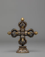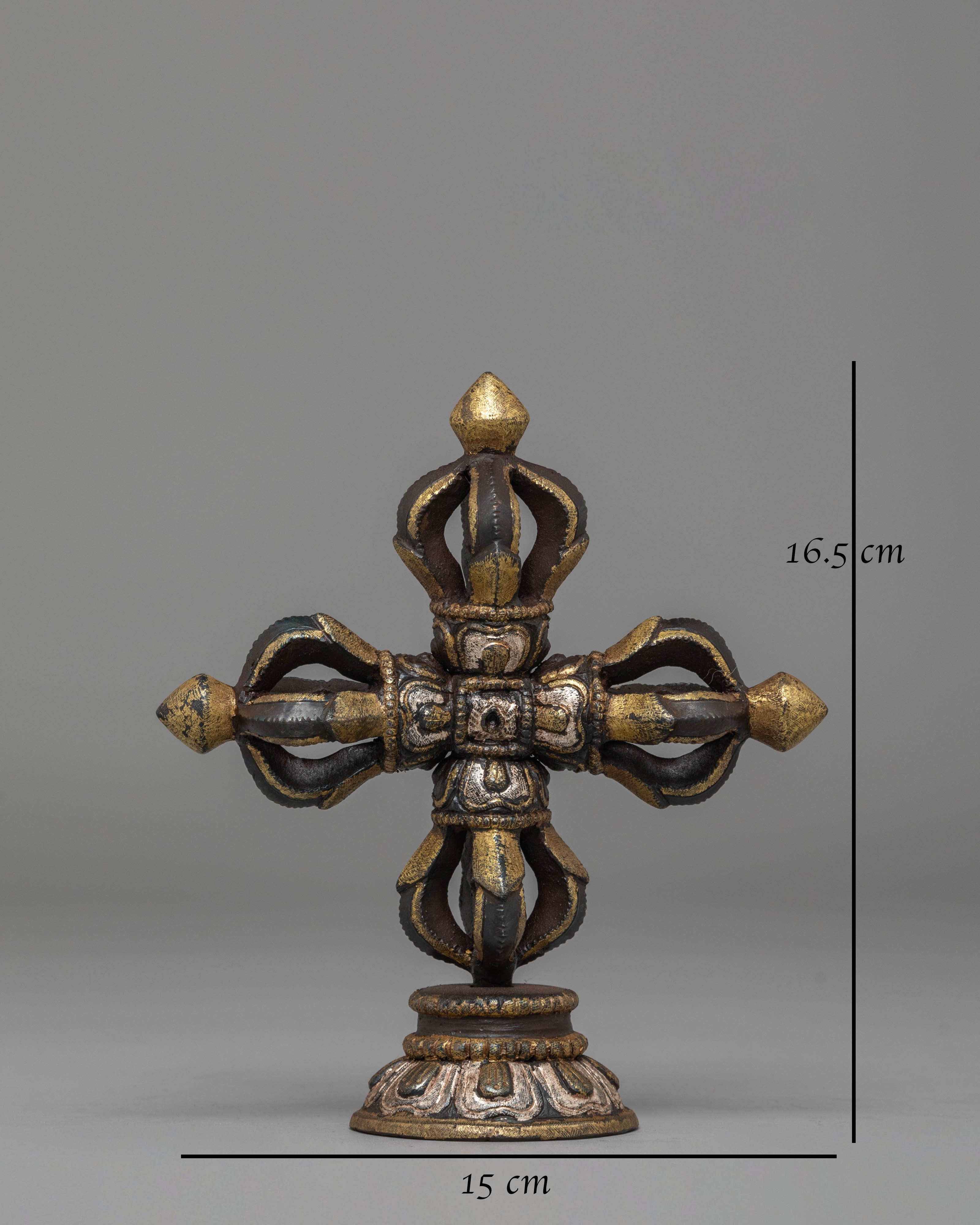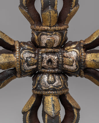 This handcrafted Bishow Vajra artifact is a striking representation of traditional Tibetan Buddhist symbolism, created from iron with refined silver-plated and brass accents. Its fourfold Vajra structure radiates outward in balanced symmetry, symbolizing the unity of wisdom and compassion. The darkened iron tones contrast beautifully with the warm brass highlights, creating an aged, powerful aesthetic that reflects authentic ritual craftsmanship.
