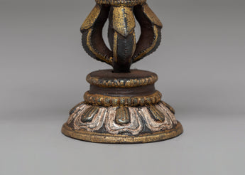 Each prong is carefully detailed, showcasing traditional motifs that echo ancient Himalayan artistry. The central sphere and intricate carvings represent the indestructible nature of enlightened awareness, while the flared base features layered patterns inspired by lotus symbolism. These motifs collectively convey spiritual grounding, transformation, and inner clarity—core themes within Vajrayana Buddhist practice.