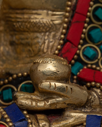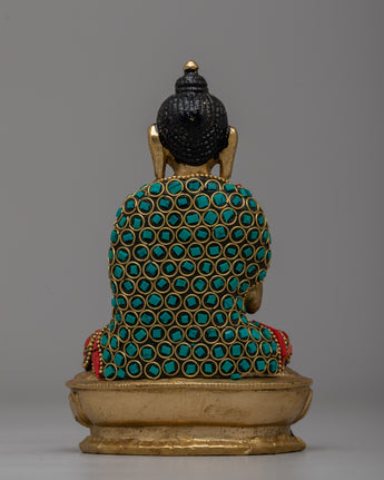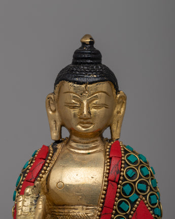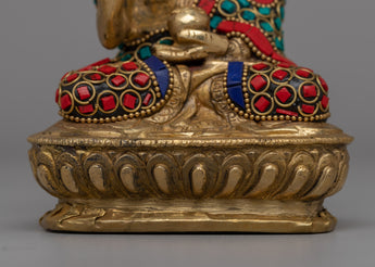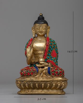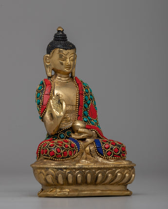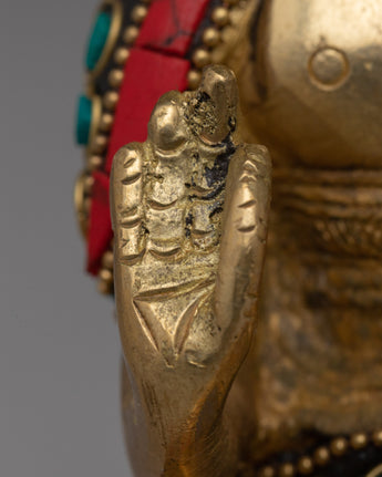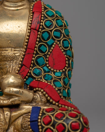 Embrace the peace and protection symbolized by this Handcrafted Brass Amoghasiddhi Buddha Statue, which is skillfully handcrafted from brass and decorated with imitation coral and turquoise stones. This magnificent 14.5cm tall and 9.5cm broad statue depicts the Buddha in a meditative stance, carrying a sign of fearlessness (abhaya mudra), which represents spiritual confidence and the absence of fear.
