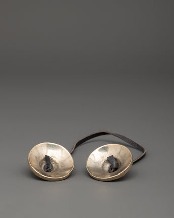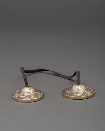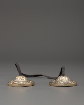 Enhance your meditation or healing practice with these Handcrafted Brass Tingsha Cymbals. These classic Tibetan chimes are known for their clear, powerful sound. These little yet powerful cymbals, measuring 4.5cm in diameter, are secured by an enduring leather strap and engraved with holy motifs—ideal for sound healing, chakra alignment, and religious ceremonies.