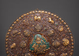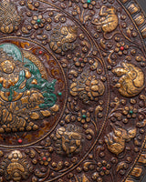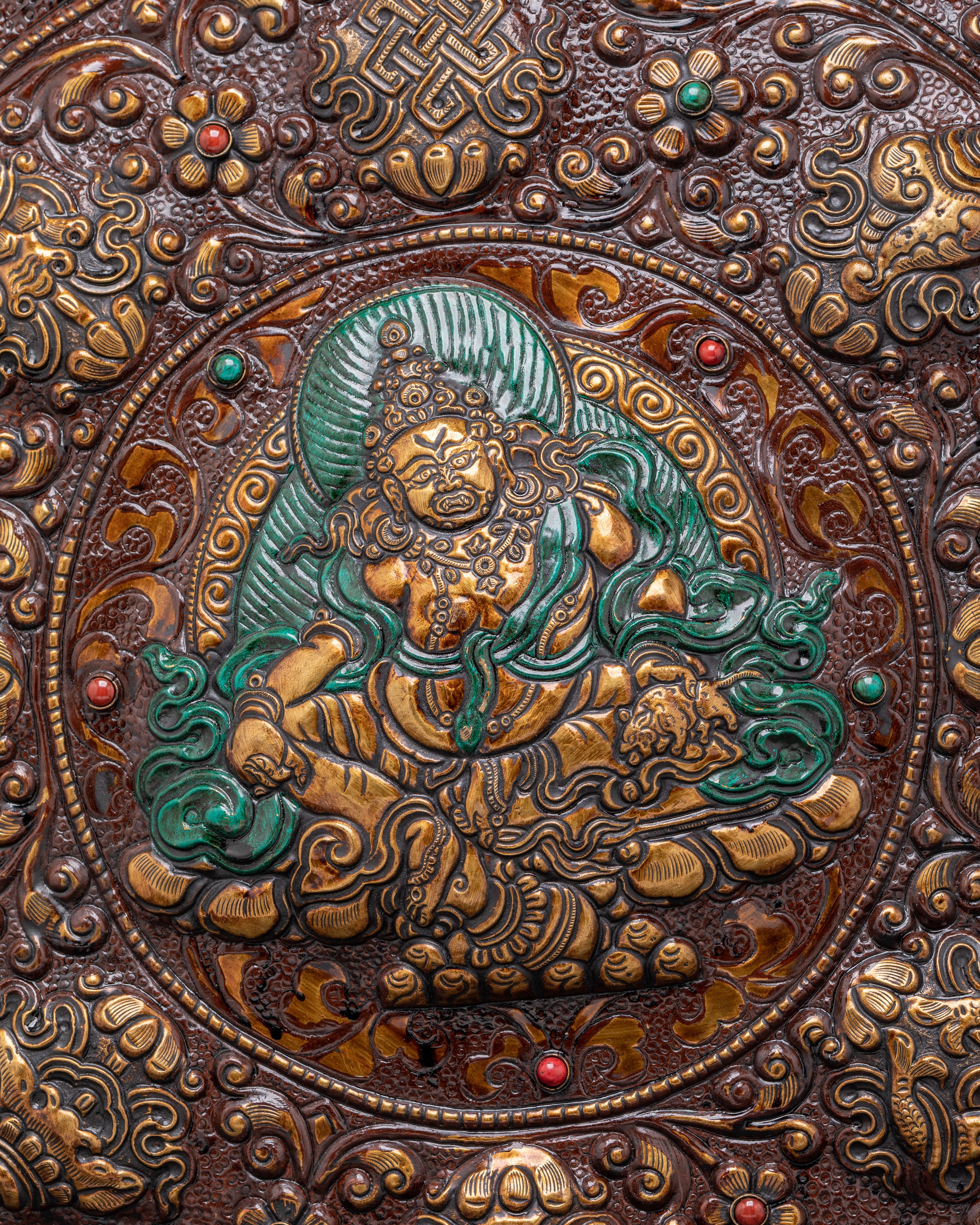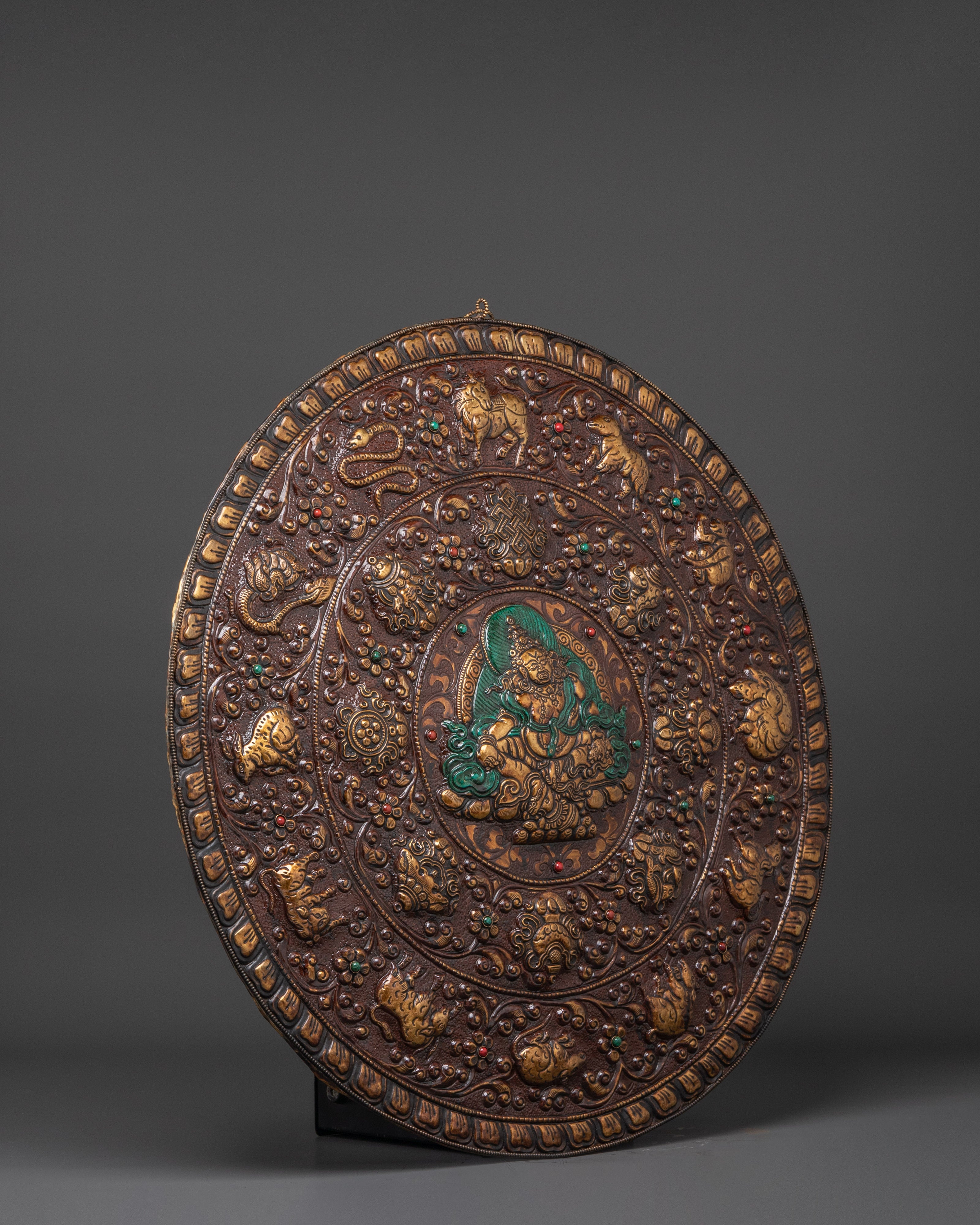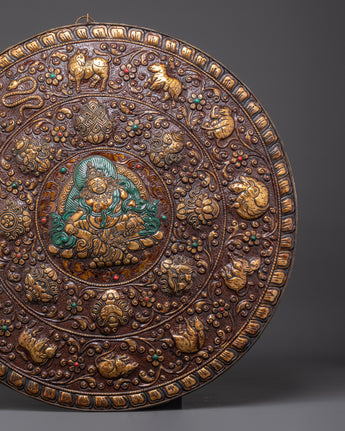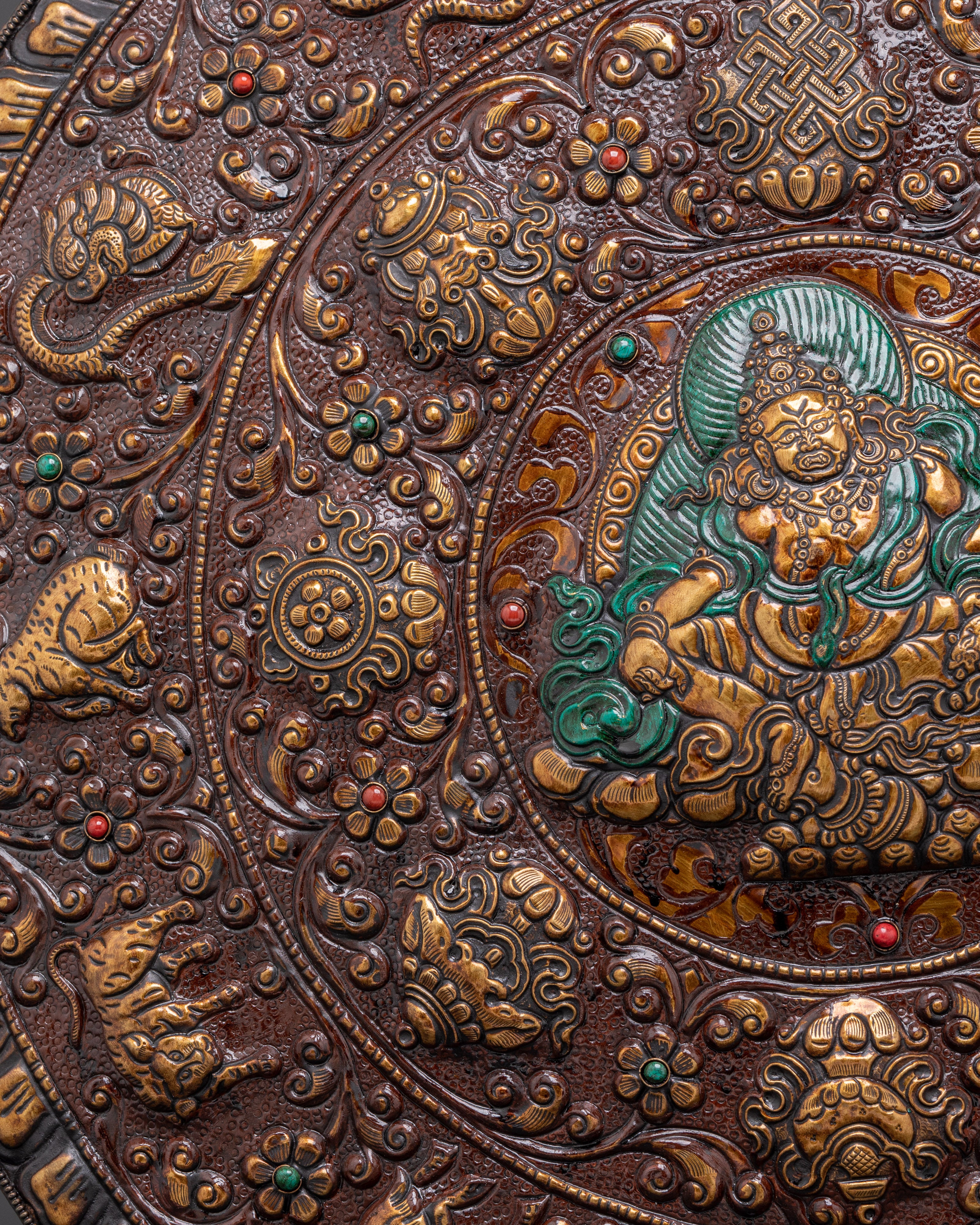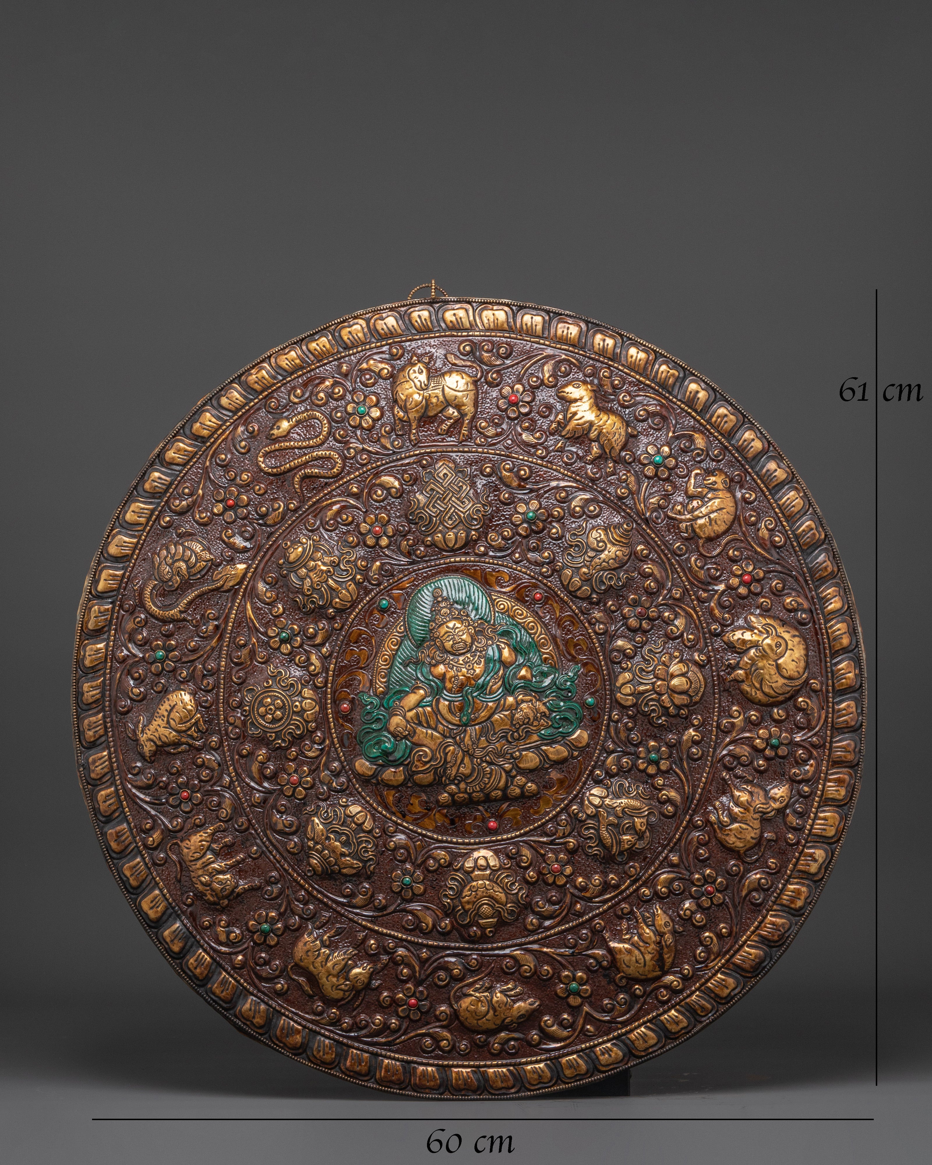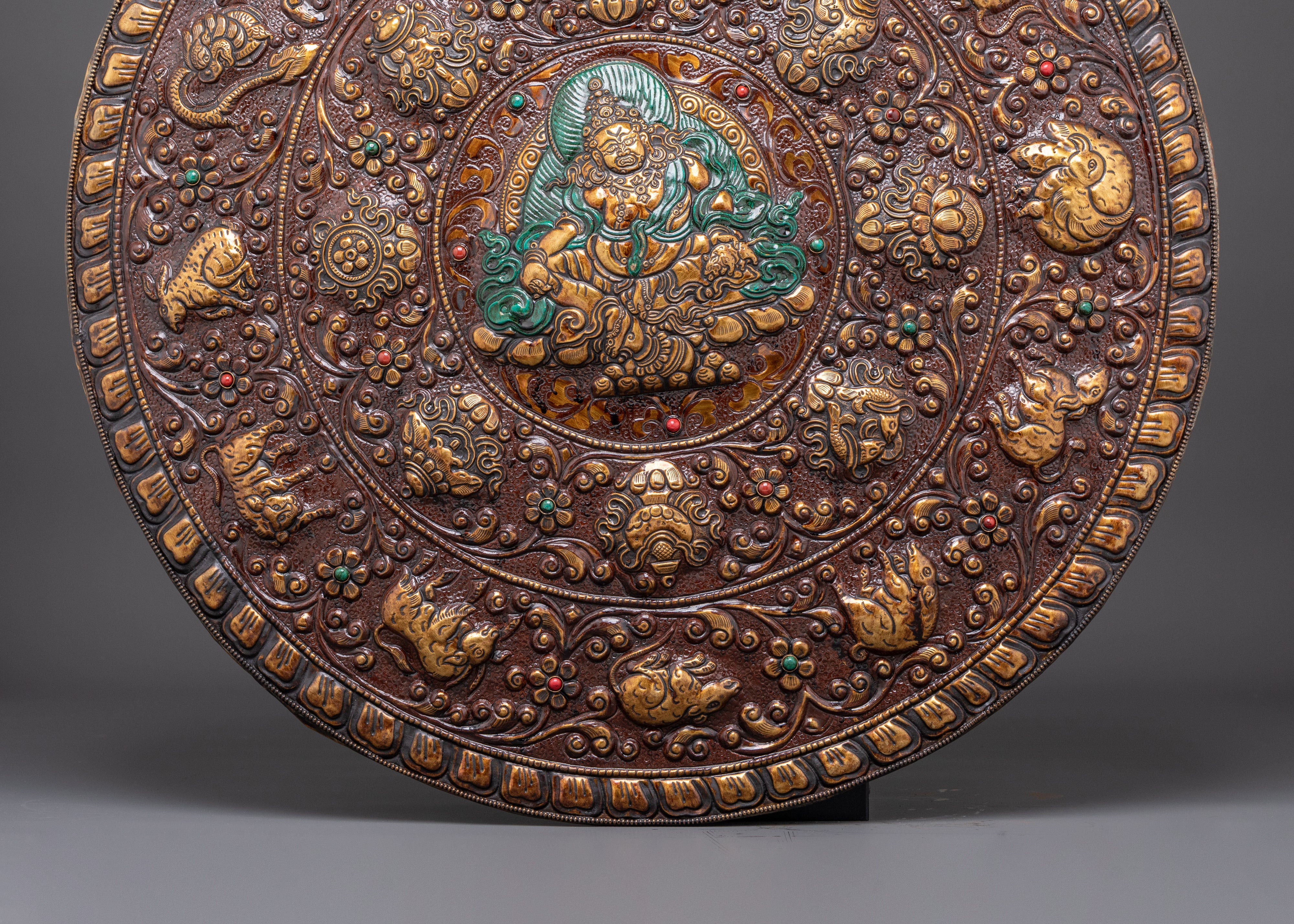 The wall hanging, crafted from brass Body, serves as both a statement piece and a symbol of eternal spiritual art. The meticulous decoration around the central figure depicts numerous aspects of Tibetan culture and mythology, resulting in a harmonic balance of color and design. With a weight of 3.41kg, the strong construction ensures that this colorful art piece will be a center point for many years to come.