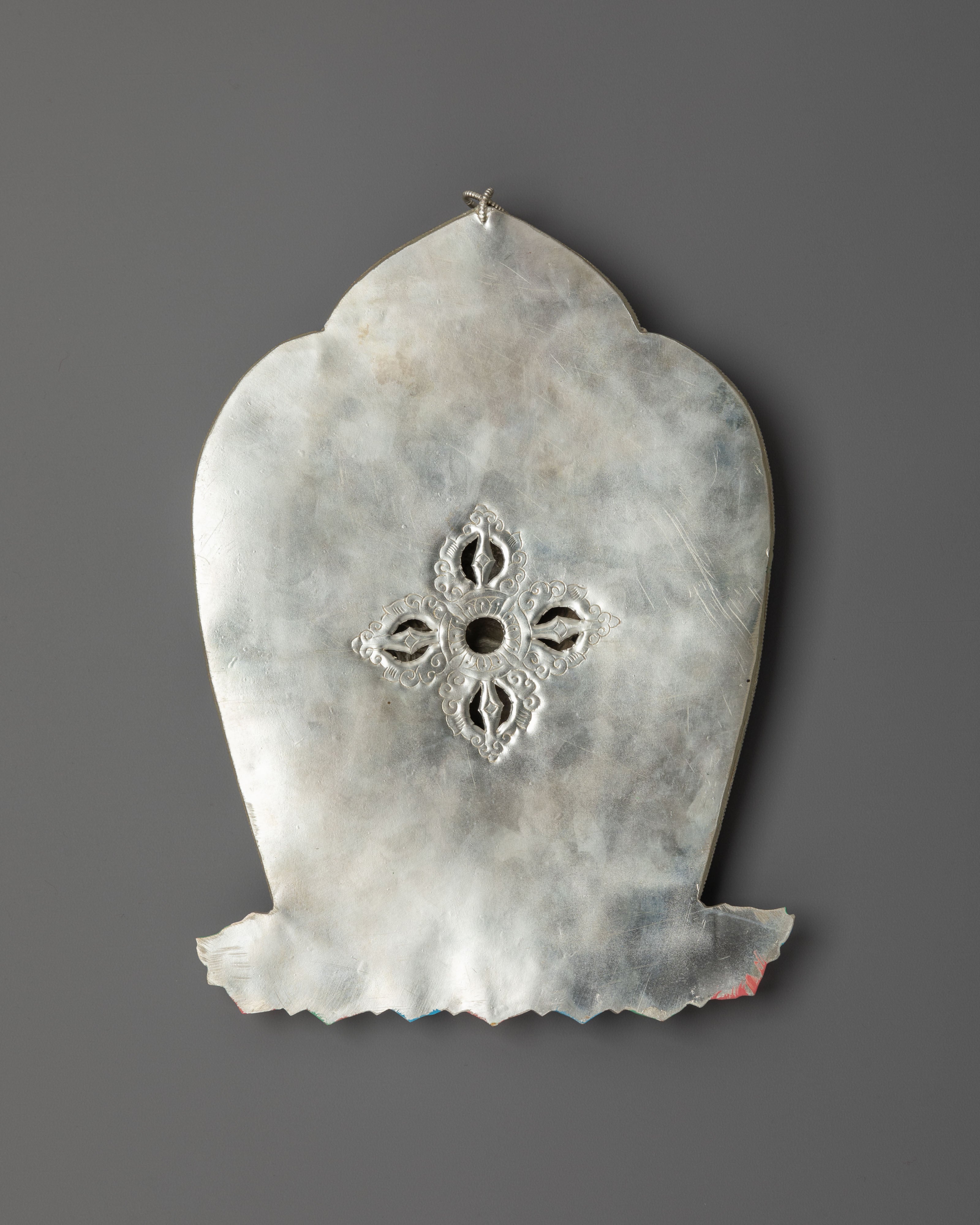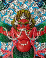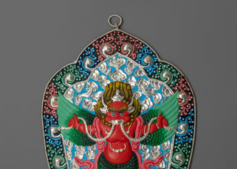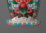 Garuda’s commanding stance—with wings outspread and gaze unwavering—symbolizes liberation from ignorance and the victory of awareness over illusion. Each intricate feature, from the expressive face to the finely rendered feathers and crown, evokes ancient Himalayan artistry. The vivid hues and sacred symbols merge harmoniously, creating a visual and spiritual reminder of wisdom and protection, crafted through generations of Tibetan craftsmanship.