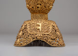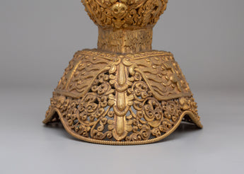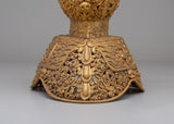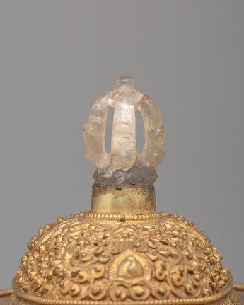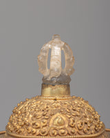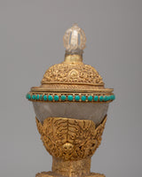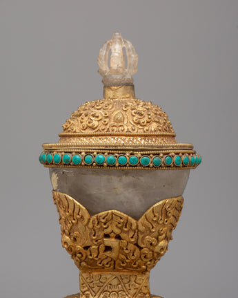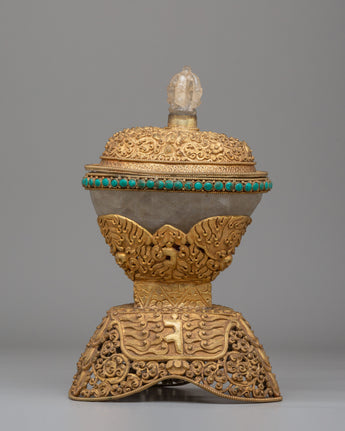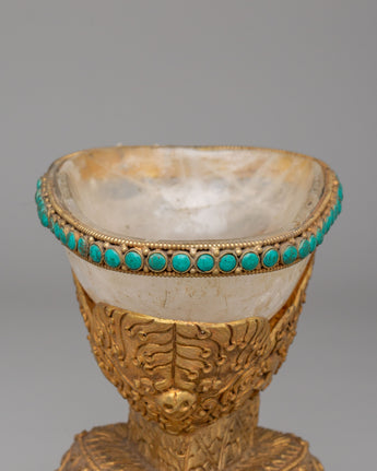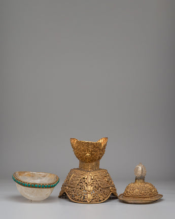 The Kapala features delicate gemstones, such as turquoise, carefully set throughout the structure to enhance its spiritual power and aesthetic appeal. The upper part of the Kapala is adorned with a crystal lid, symbolizing the clarity of wisdom and the purity of enlightenment. Its gold plating represents the sacred energy of the Buddha’s teachings, infusing the object with divine energy. The copper body offers strength and grounding, while the intricate design patterns provide a spiritual representation of Tibetan motifs used in meditative and ritualistic practices.