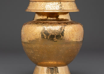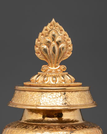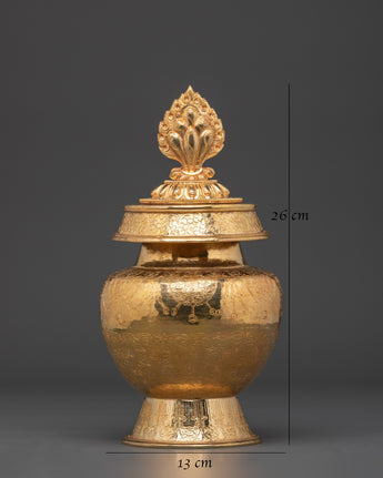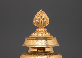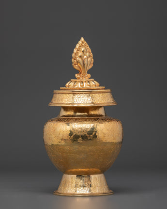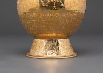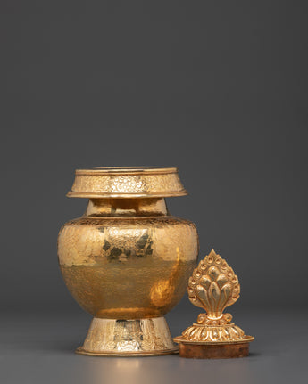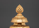 This Dhupur rice pot showcases traditional Tibetan aesthetics through its detailed etched motifs and ornate lotus finial. Its substantial weight and radiant finish make it both a powerful spiritual tool and a museum-quality centerpiece. Ideal for Buddhist altars, monastery shrines, or meditation spaces, the lustrous gold surface symbolizes enlightenment, generosity, and sacred intention, enhancing your spiritual practice with authentic Himalayan craftsmanship.