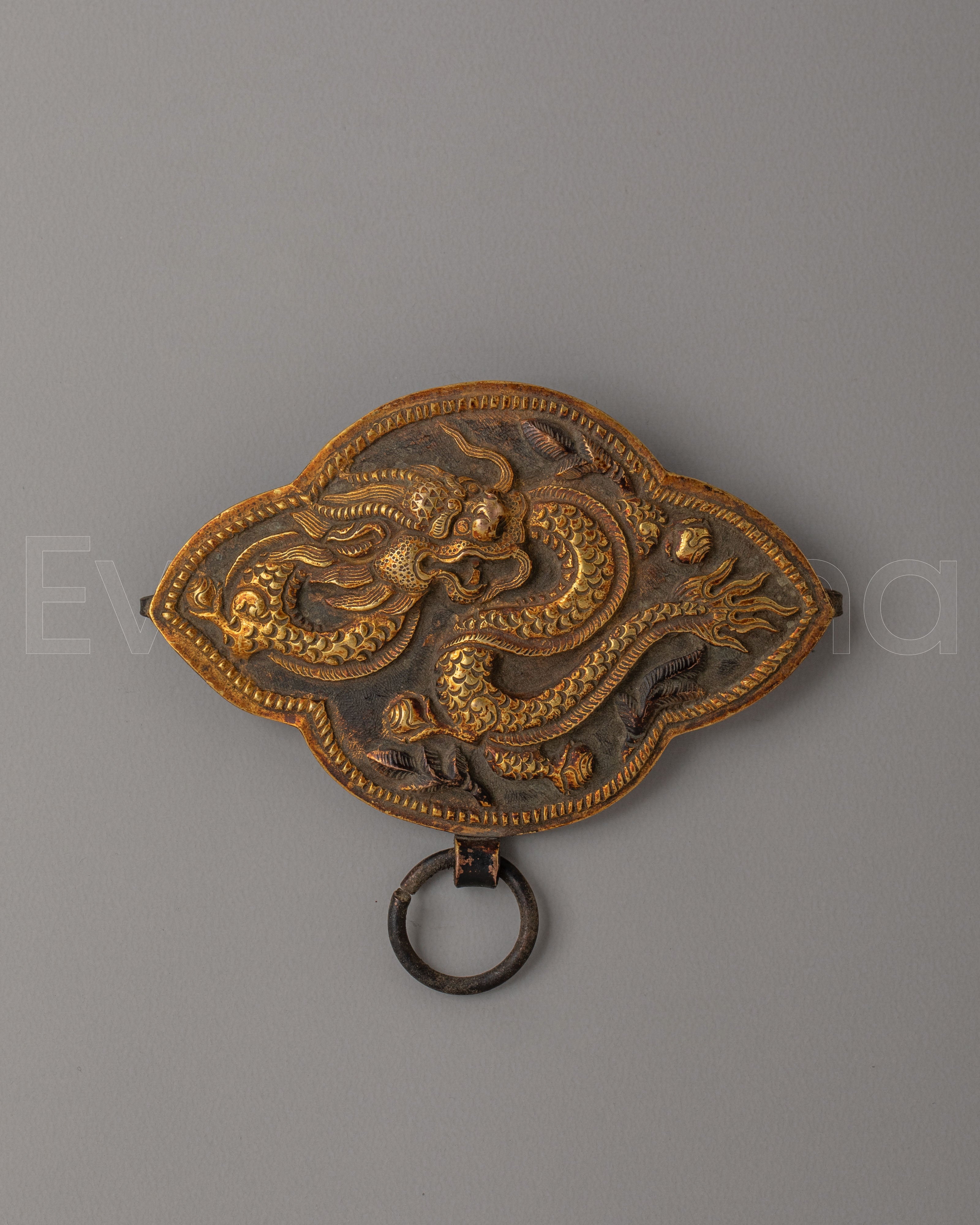 The Handcrafted Dragon Belt Buckle is a bold and artistic accessory crafted from copper with gold plating, featuring a striking dragon carving at its center. The dragon is depicted in a dynamic, flowing form, symbolizing strength, power, and protection across many cultures. The detailed relief work brings depth and character to the piece, making it a standout addition to any belt or accessory collection.