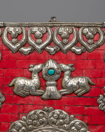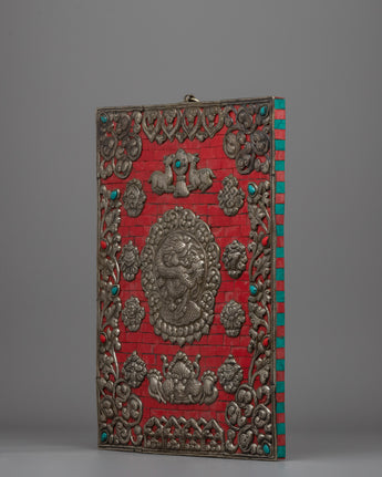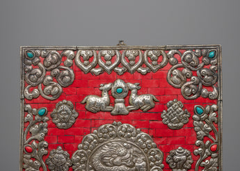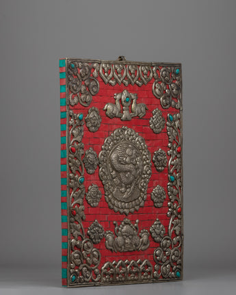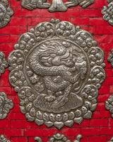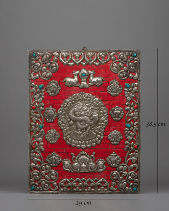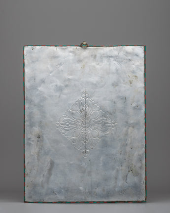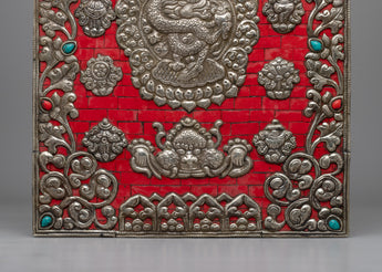 This handcrafted Dragon Metal Thangka, measuring 38.5 cm in height and 29 cm in width, and weighing 2.30 kg, is a remarkable work of art. It is made of durable white metal and tastefully embellished with artificial coral and turquoise stones, demonstrating an amazing blend of tradition and painstaking artistry. These vivid stones add color and symbolic depth to the item, boosting its beauty and spiritual importance.