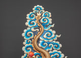 This dragon wall hanging is crafted with remarkable skill and elegance. The sculpture is made of repousse copper and hand-hammered to perfection, guaranteeing that each scale and curve is precise and graceful. The dragon's body is adorned with gold-plated details, which lend a touch of radiance and elegance. The combination of copper and gold produces a stunning contrast that highlights the dragon's colorful, dynamic motion, which is further enhanced by the clouds and orbs that surround it, resulting in a mesmerizing and magical design.