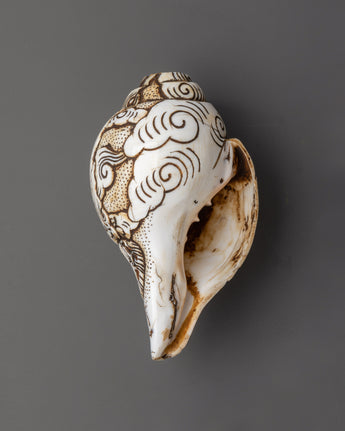 In Buddhist worship, the conch shell is used as a trumpet or offertory receptacle and represents Buddha's spoken voice. It is one of the eight lucky Buddhist symbols, reflecting the victory of Buddha's teachings, which spread omnidirectionally like a conch shell's voice. The conch shell is a sign of power, authority, and sovereignty; its sound is thought to ward off evil spirits, prevent natural disasters, and frighten away dangerous creatures.