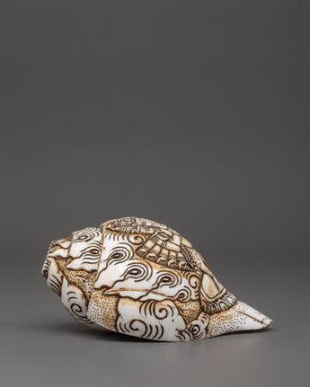 This handcrafted Ganesh Conch Shell is a wonderfully made spiritual item utilized in Hindu rituals, puja ceremonies, and temple altars. It is made of natural conch shell and measures 9 cm in height and 17 cm in width, weighing 0.73 kg. It has a fine carving of Lord Ganesha in a dancing, multi-armed posture. The precise carving technique highlights the religious significance while preserving the shell's original texture and shape.