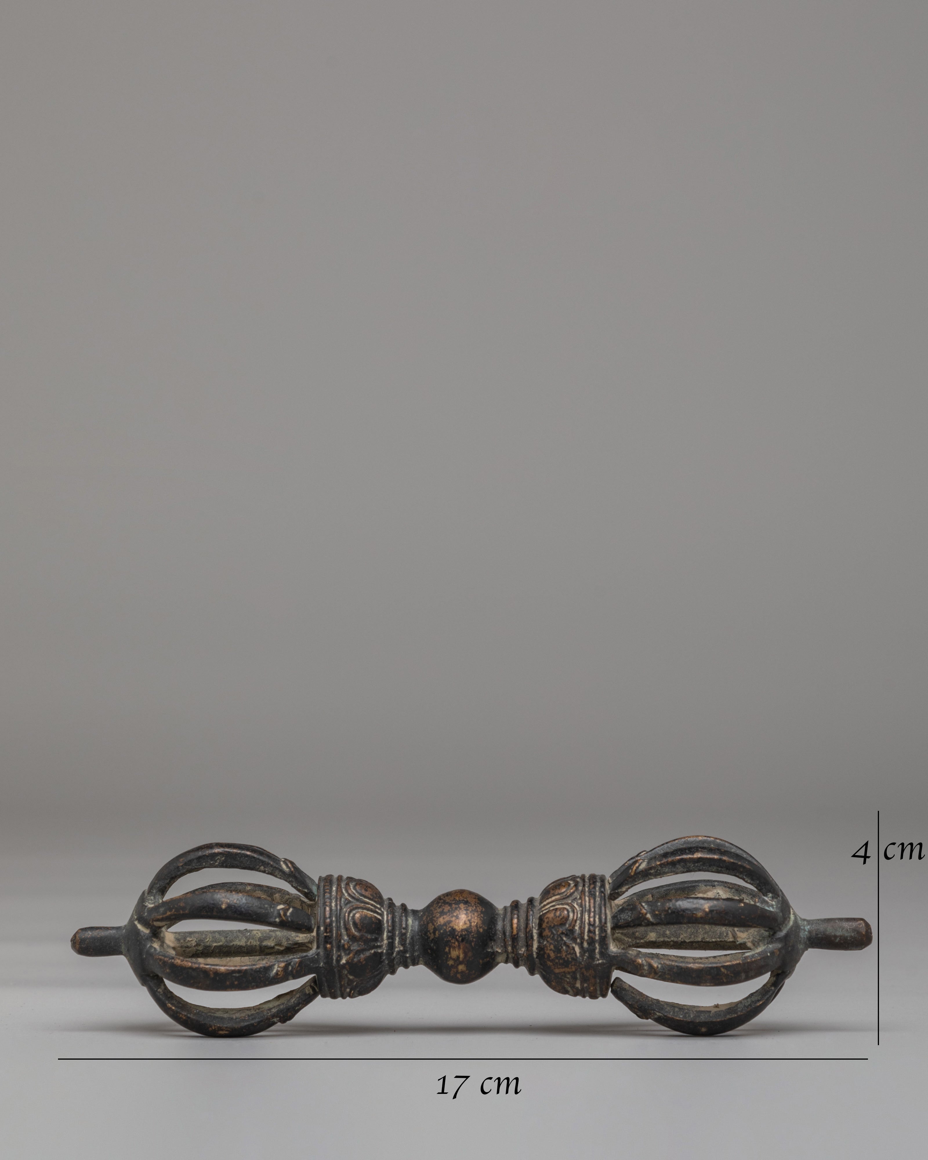 The Handcrafted Himalayan Tibetan Vajra is a symbol of spiritual strength, protection, and enlightenment, deeply rooted in Tibetan Buddhism. This vajra, made from brass and finished with an antique patina, measures 4 cm in height and 17 cm in width, weighing 0.27 kg. Traditionally, the vajra is used as a ritual tool during meditation and prayer ceremonies to symbolize unbreakable truth and spiritual power. Its exquisite craftsmanship and intricate design make it not only a valuable spiritual artifact but also an elegant addition to any sacred space.