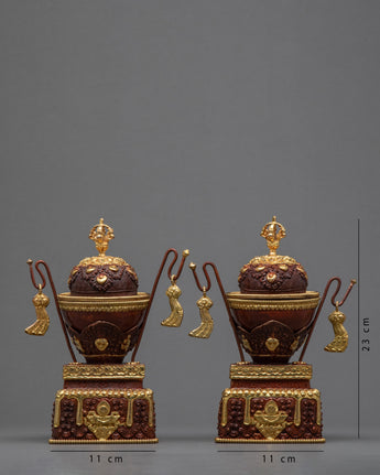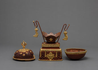 The Kapala set holds the nectar used for performing higher esoteric rituals. It offers liberation to gods and deities to ensure their devotion. It is said that the offerings will be transformed into the Wisdom Nectar, a liquid form of the Enlightened Mind of the Deity.