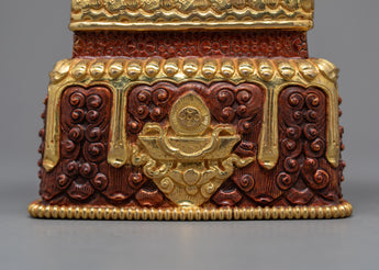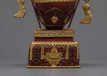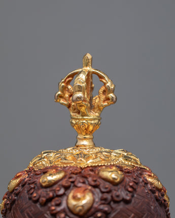The kapala set is beautifully hand carved and plated with gold. The top holds the vajra and beautifully carved, the knot of eternity representing the intertwining of wisdom and compassion, the perfection of knowledge. The middle carved with the skull head as is represented as skull cup. And the bottom carved with elegant patterns.