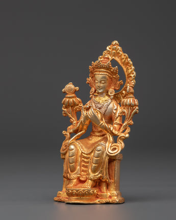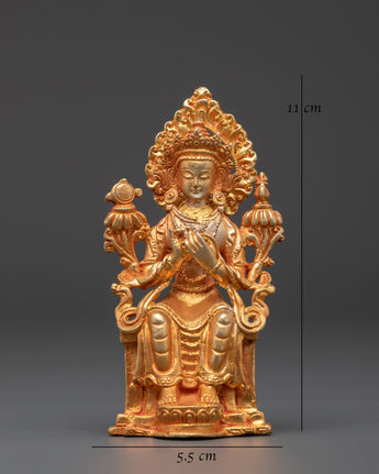 This handcrafted Maitreya Buddha Deity Sculpture depicts Maitreya, the future Buddha, and embodies the qualities of compassion and wisdom. The sculpture, crafted from copper and plated in gold, was designed to enhance any space by bringing calm and positive energy. With an 11cm height, it's ideal for meditation places, altars, or as a peaceful home decor piece.