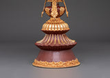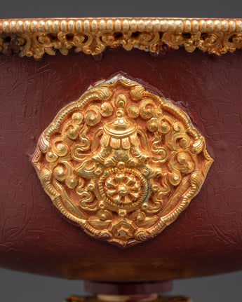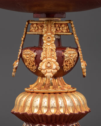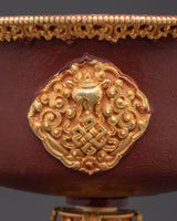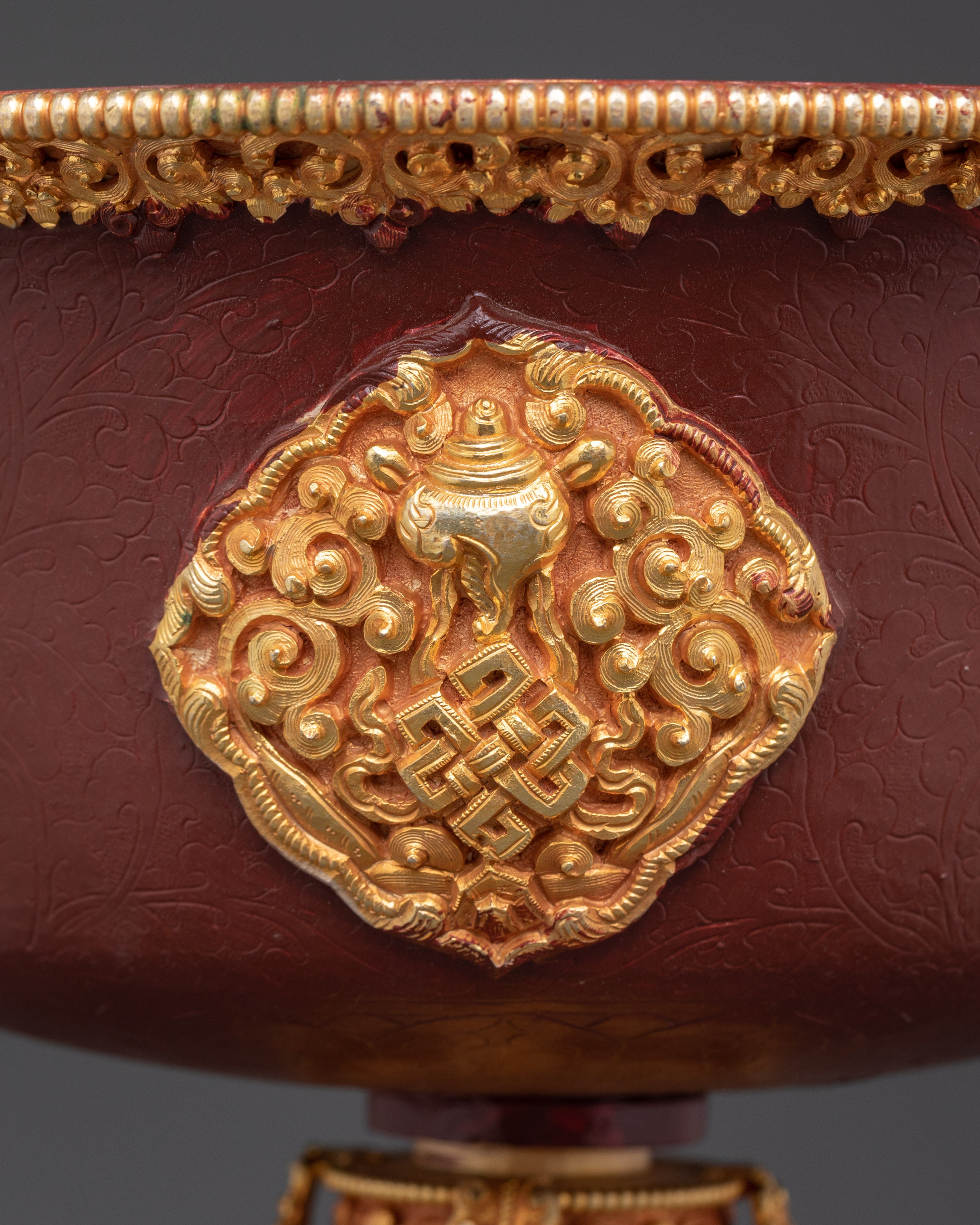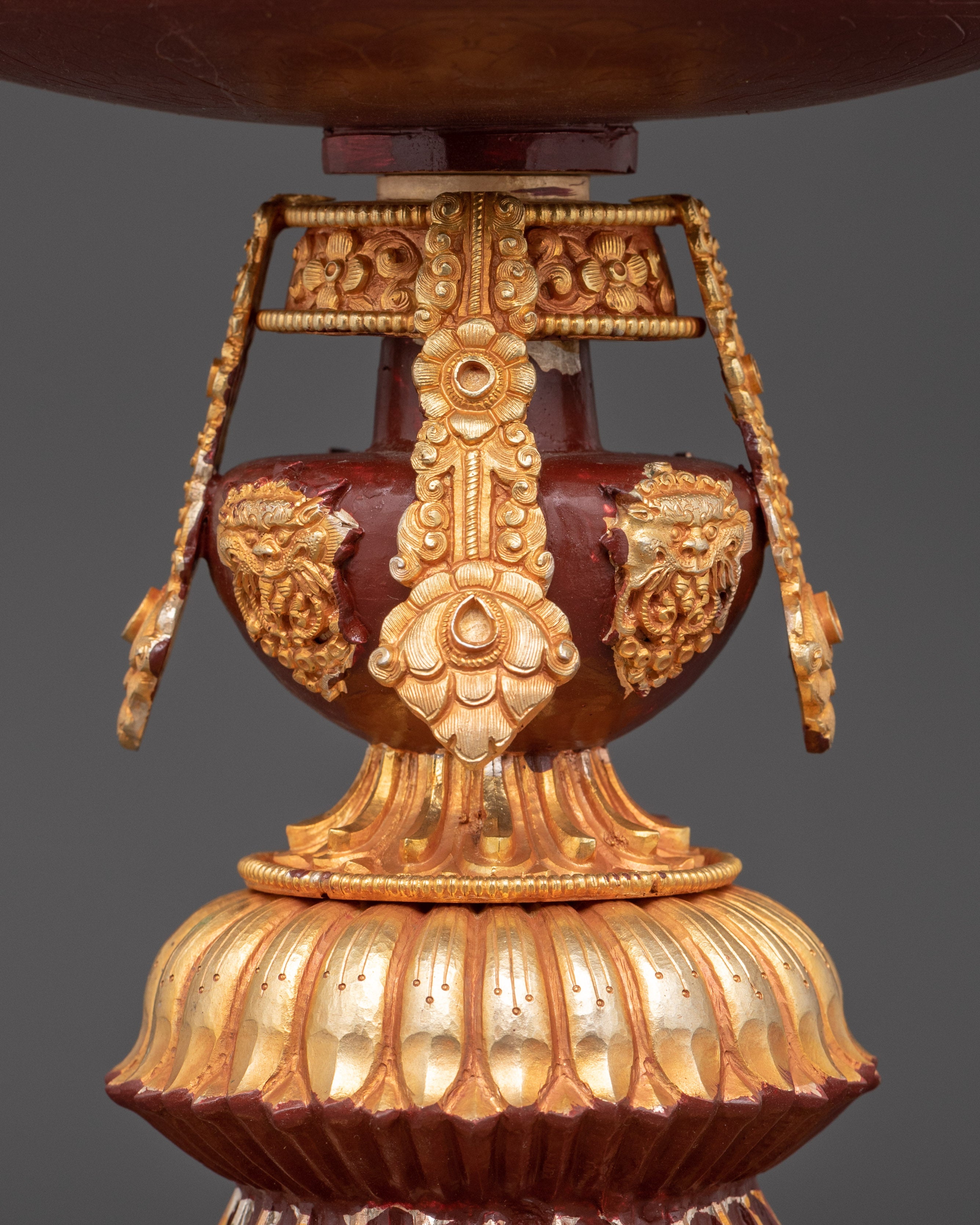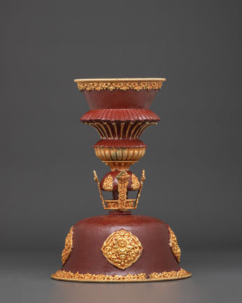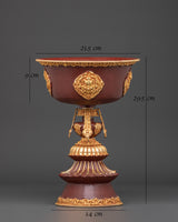 The Handcrafted Meditation Butter Lamp is a stunning example of Tibetan spiritual artistry, meant to provide a warm, inviting glow over your meditation room and sacred ceremonies.  This butter lamp, made of copper and tastefully gold plated, stands 29.5cm tall and 21.5cm in diameter. It has a robust 14cm base and a 9cm inner depth, allowing plenty of place for butter or oil to light the flame.  This lamp, weighing 1.49kg, strikes a balance between durability and manageable size, making it suitable for both home altars and temple settings.