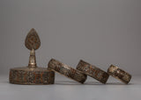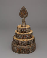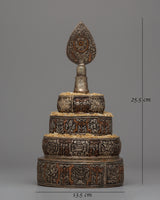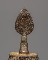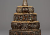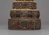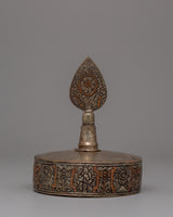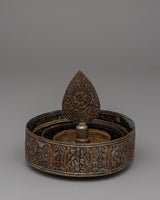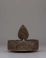 The Handcrafted Sacred Copper Mandala Set is a remarkable example of traditional Tibetan workmanship, with elaborate designs for spiritual and aesthetic purposes. This work of art, measuring 15.5 cm in height and 13.5 cm in width, is made of copper and plated with electro-silver, adding to its elegance and longevity. The intricate carvings on each layer of the mandala reflect ancient Buddhist imagery and symbolism, making it a valuable tool for meditation, ceremonial offerings, or as a beautiful centerpiece that symbolizes spiritual energy.