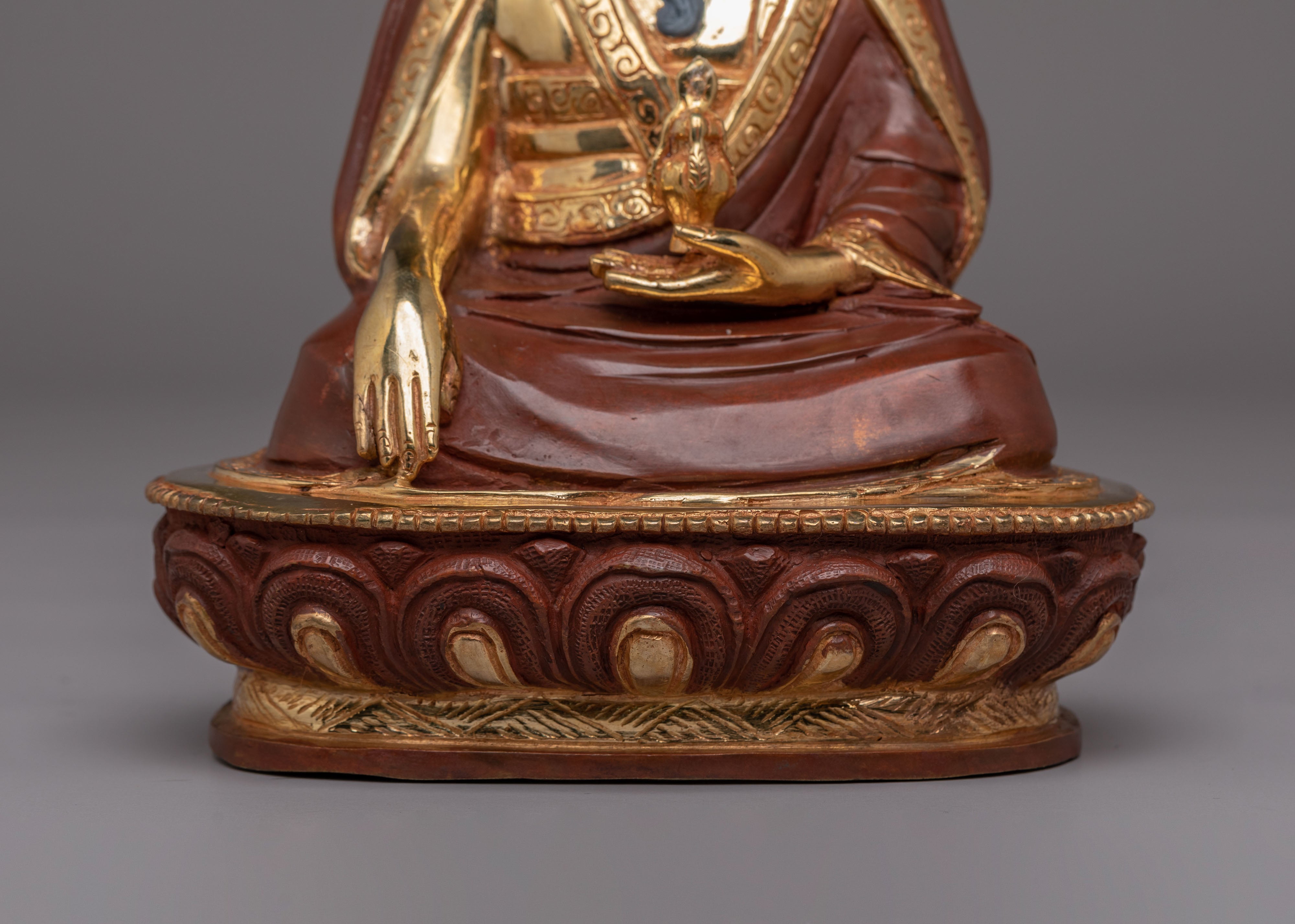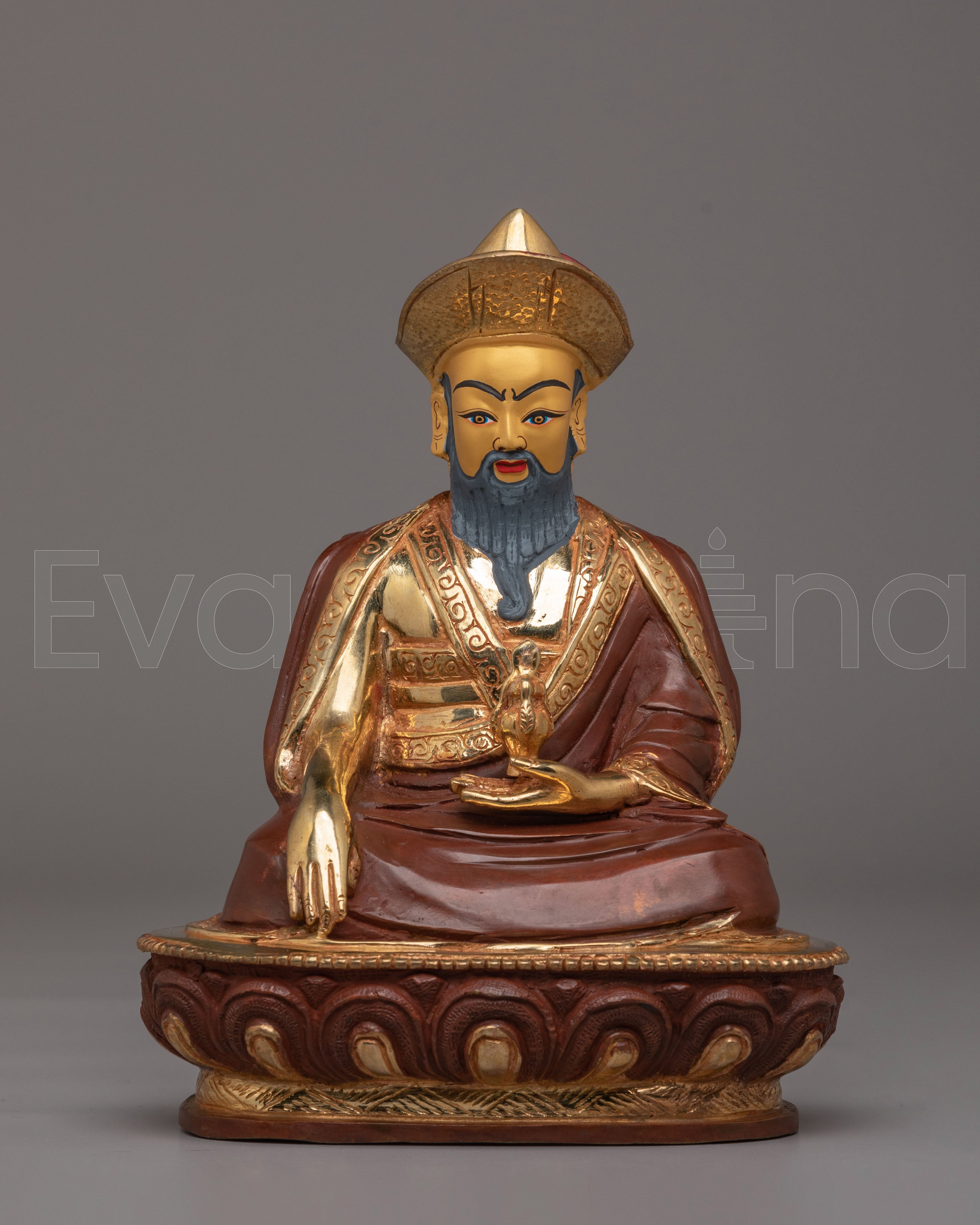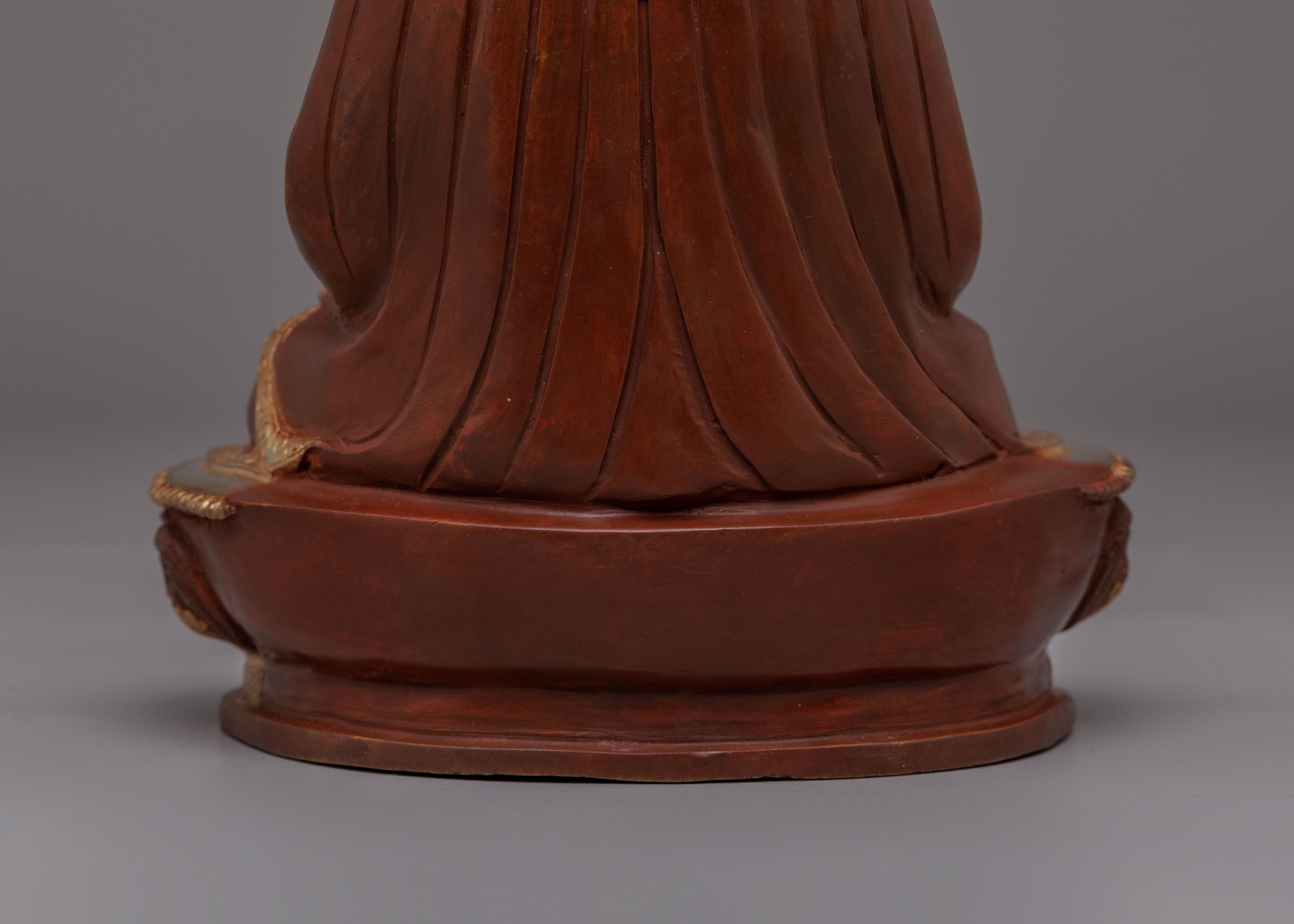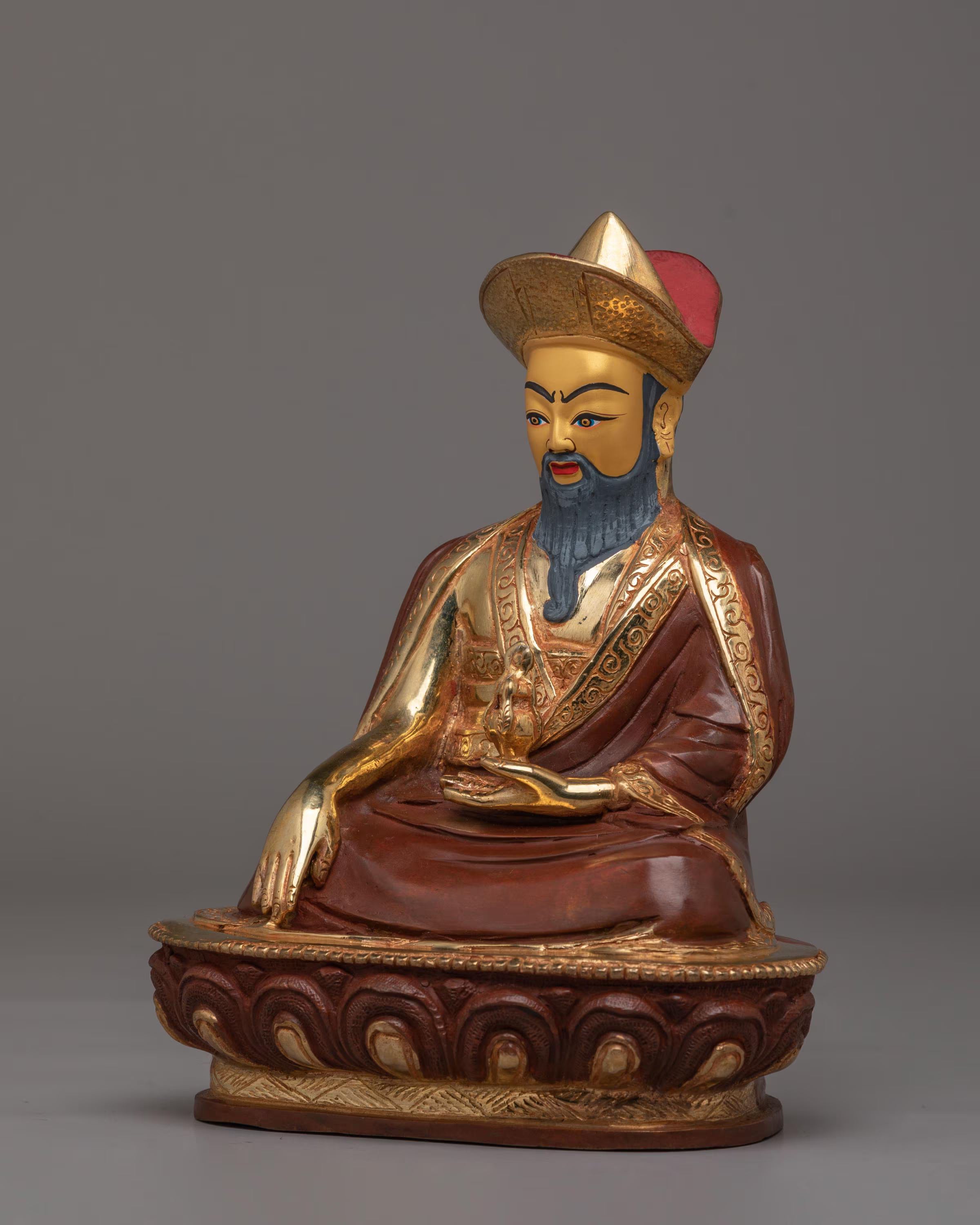 The statue depicts Guru Shapdum, a revered figure in Tibetan Buddhism, known for his role in offering spiritual protection and blessings. His serene expression and intricate robes are highlighted by the gold plating, reflecting the purity and sacredness of his teachings. The acrylic color enhances the statue's details, adding vibrancy and depth to the overall design. The combination of gold plating and a copper body creates a striking appearance that symbolizes the union of wisdom and compassion.