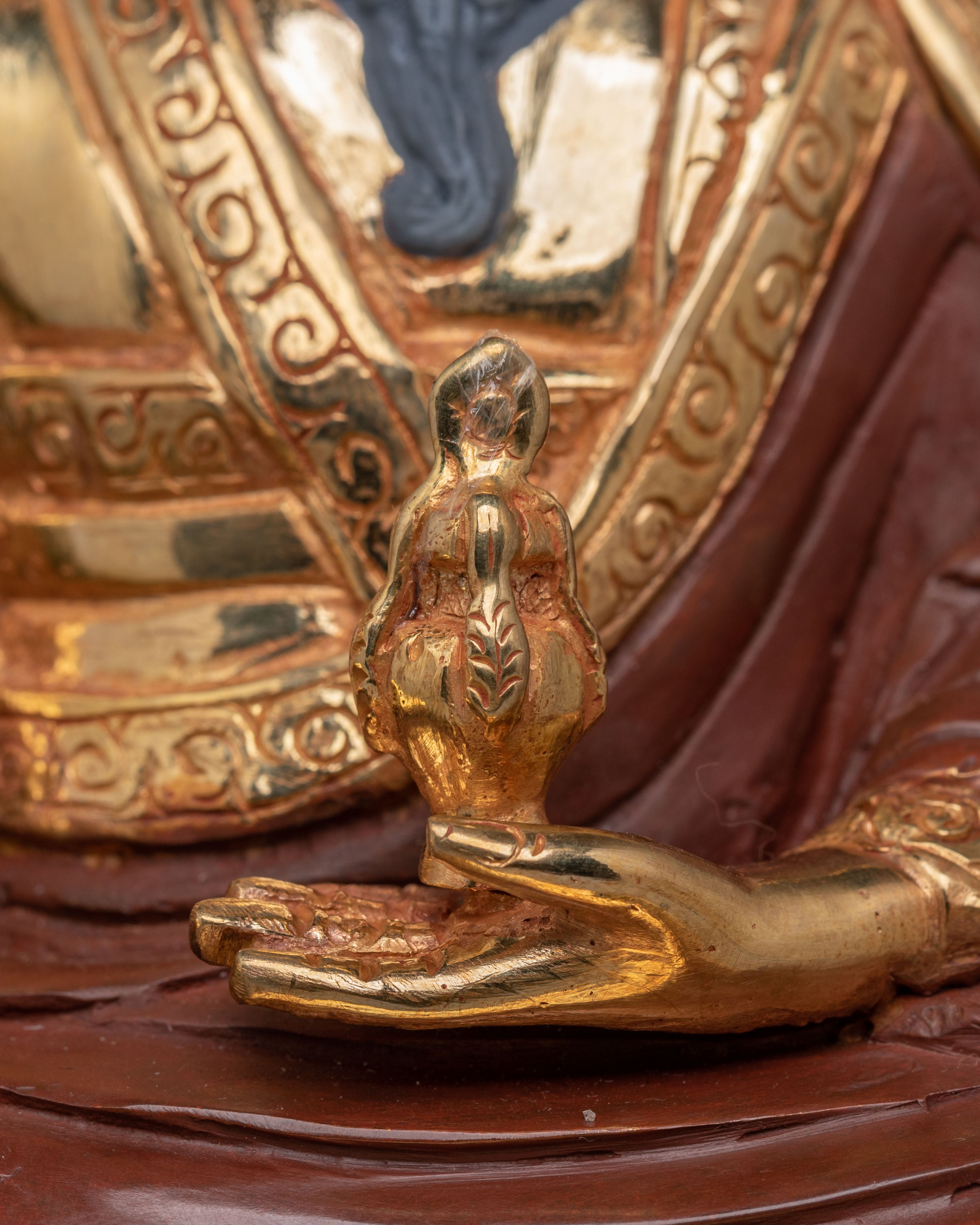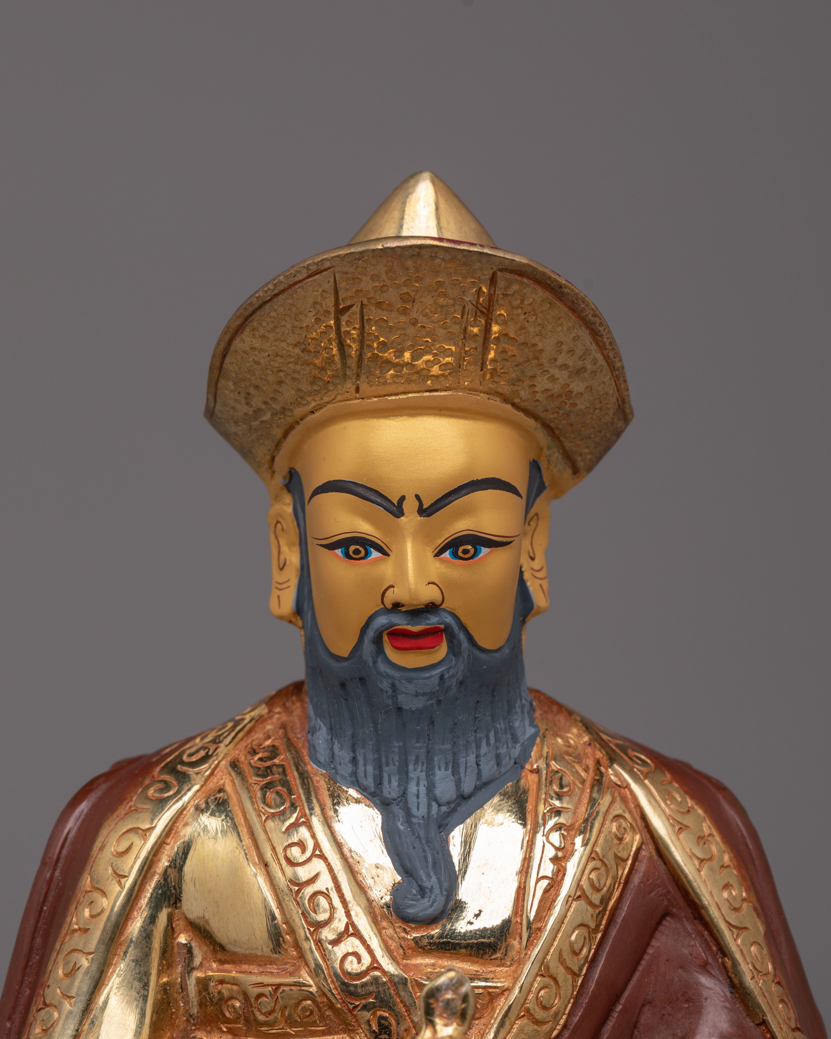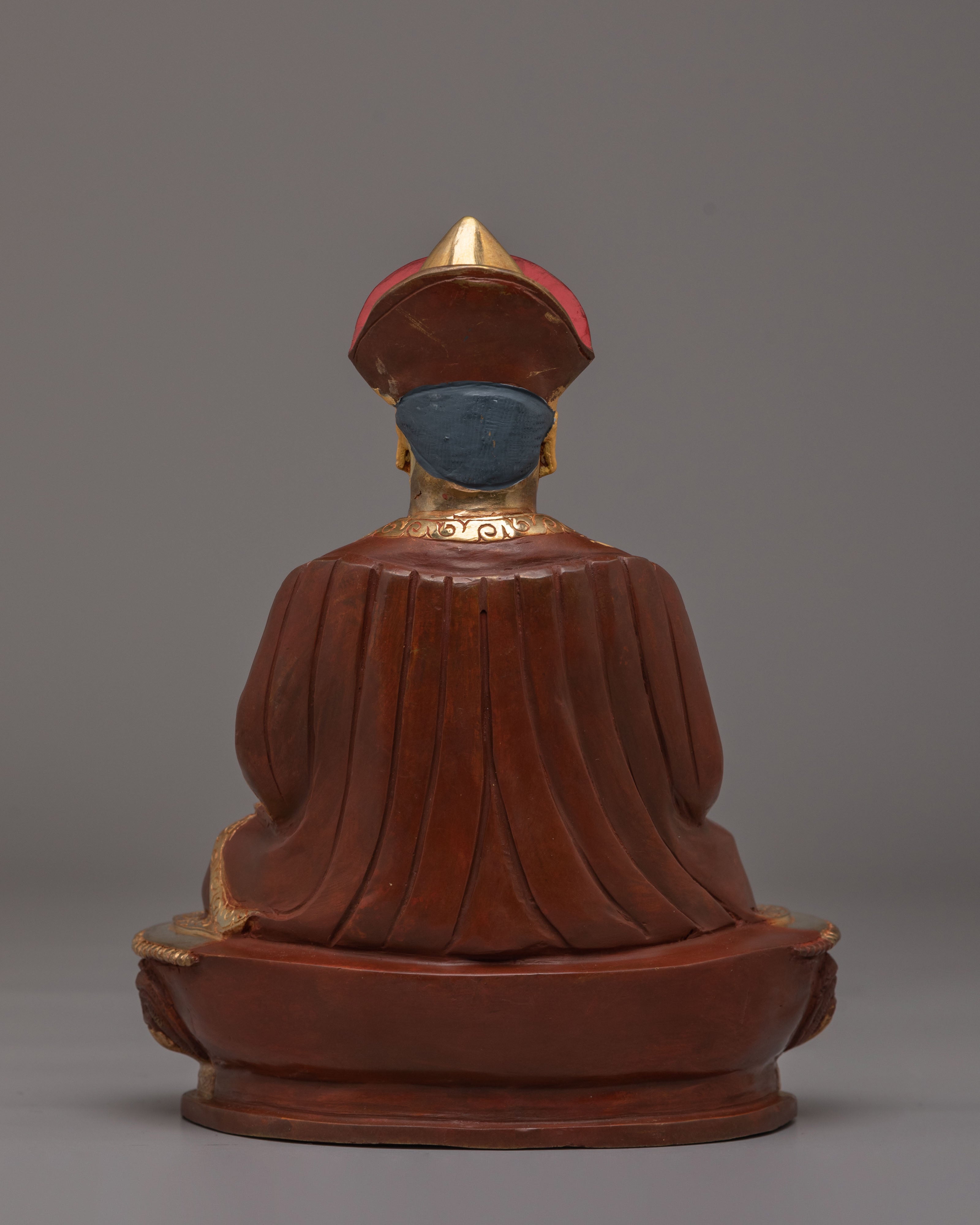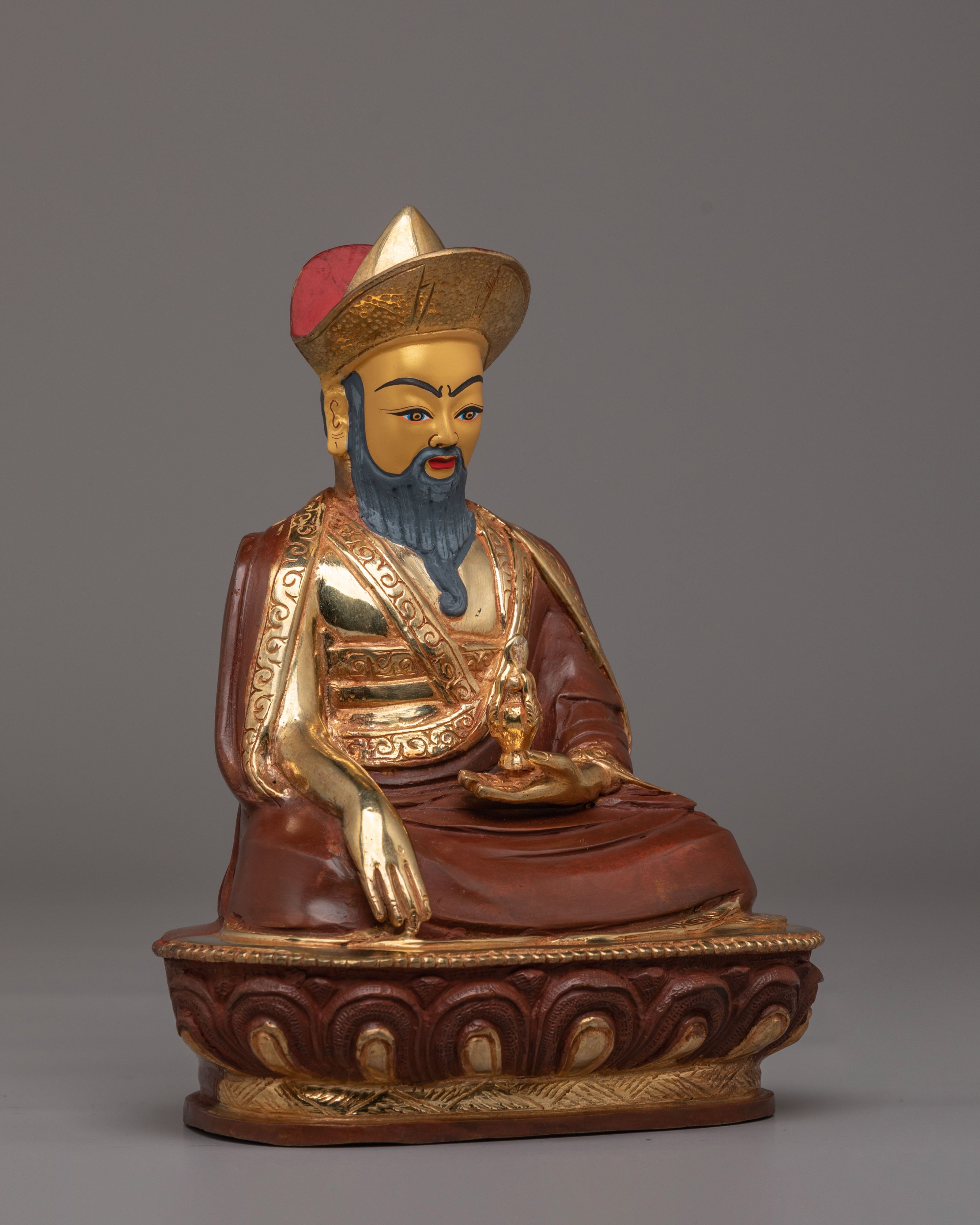 The statue depicts Guru Shapdum, a revered figure in Tibetan Buddhism, known for his role in offering spiritual protection and blessings. His serene expression and intricate robes are highlighted by the gold plating, reflecting the purity and sacredness of his teachings. The acrylic color enhances the statue's details, adding vibrancy and depth to the overall design. The combination of gold plating and a copper body creates a striking appearance that symbolizes the union of wisdom and compassion.