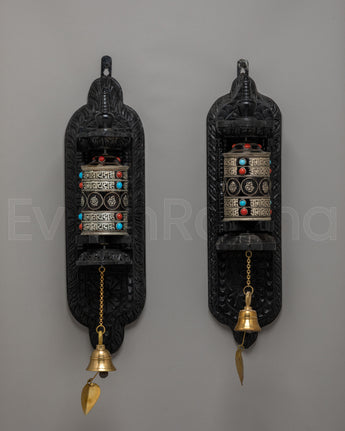 Presenting a beautifully Handcrafted Sacred Prayer Wheel Set, designed to invoke blessings and spiritual harmony. This set includes two intricately crafted prayer wheels, each meticulously made with a copper body, white metal accents, and an elegantly carved wooden frame. The prayer wheels, adorned with brass bells, represent the sacred Tibetan tradition of prayer and mantra recitation, offering a profound way to invite peace, compassion, and positive energy into any space. Ideal for meditation rooms, altars, or as a meaningful gift for spiritual seekers.