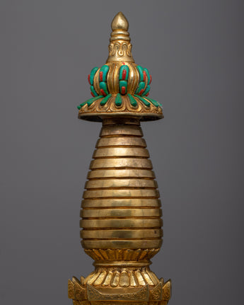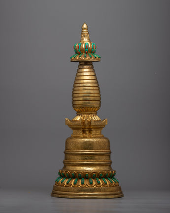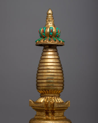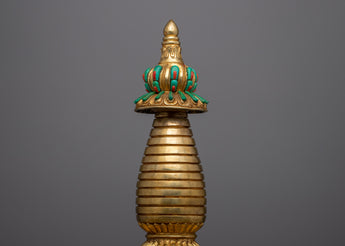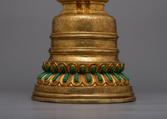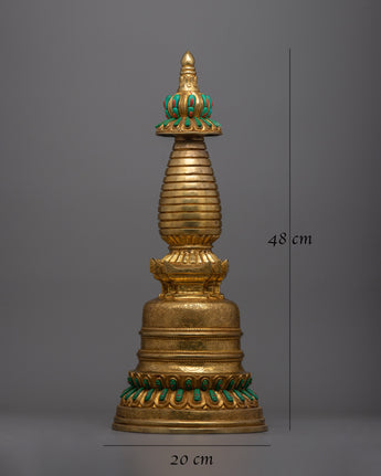 The stupa's superior craftsmanship and aesthetic appeal are demonstrated by the materials chosen. Renowned for its long-lasting qualities, Copper provides the ideal base, and the Gold Plating  elevates it to a level of incomparable beauty and holiness. This combination strengthens the stupa's spiritual resonance and aesthetic appeal, making it an effective meditation and contemplation focal point.