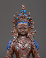 The Handcrafted Tibetan Sacred Amitayus Statue stands 8.5” (21.5cm) tall with a 5.7” (14.5cm) broad base and weighs 1.22 kg. Made from oxidized copper, it features acrylic paintings and gemstones that enhance its serene presence. Expertly handcrafted by skilled artisans in Nepal, this statue embodies traditional Himalayan craftsmanship and serves as a meaningful addition to altars, meditation spaces, or spiritual collections focused on longevity and inner peace.