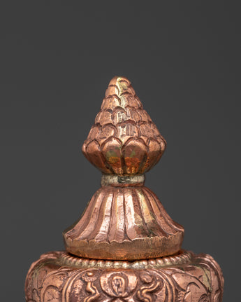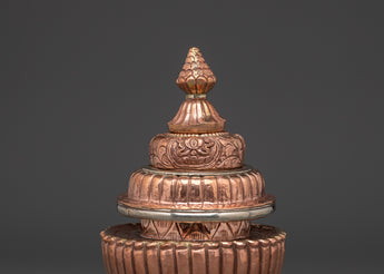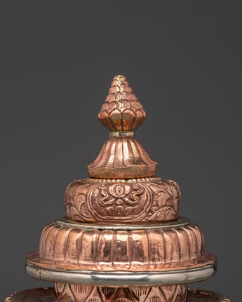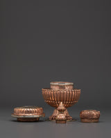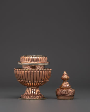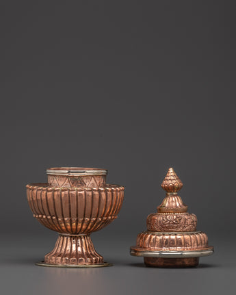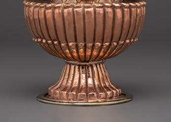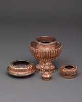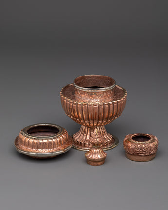 This vessel, skillfully carved from copper with white metal accents, is crafted by artisans who specialize in Himalayan ceremonial rafts. The dual-metal structure emphasizes both beauty and reverence, making it not only practical for ceremonial offerings but also visually appealing as part of an altar or meditation. Whether you pray regularly or hold formal Buddhist ceremonies, this rice vessel adds intention, purity, and unity to your spiritual practice.