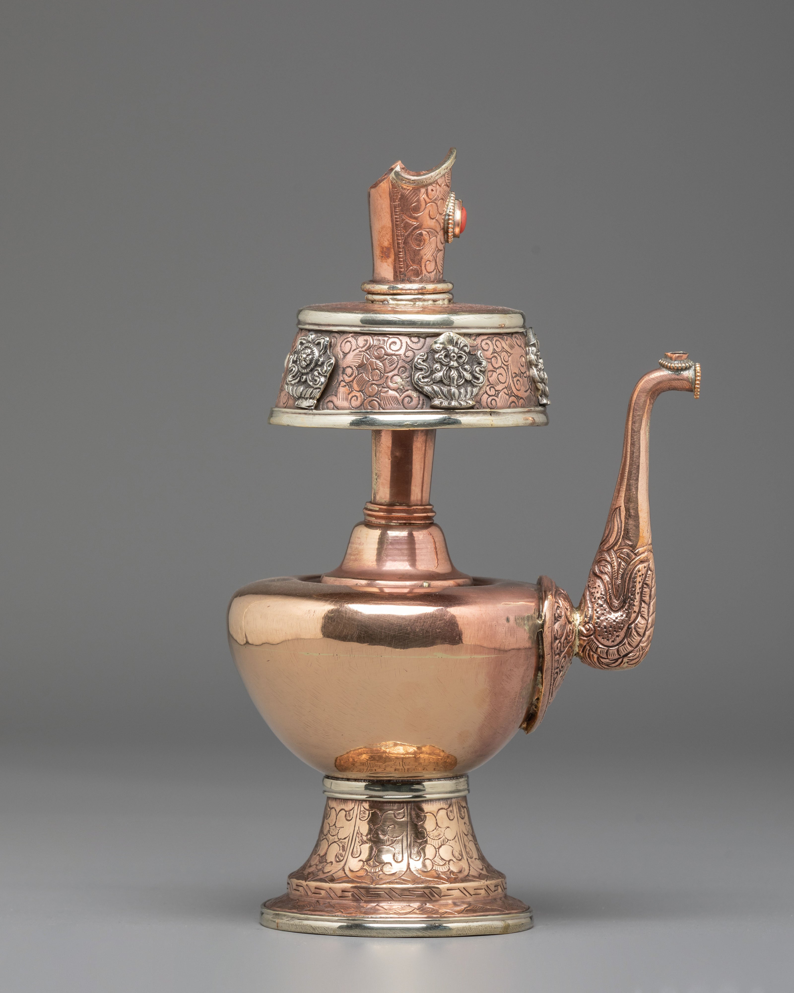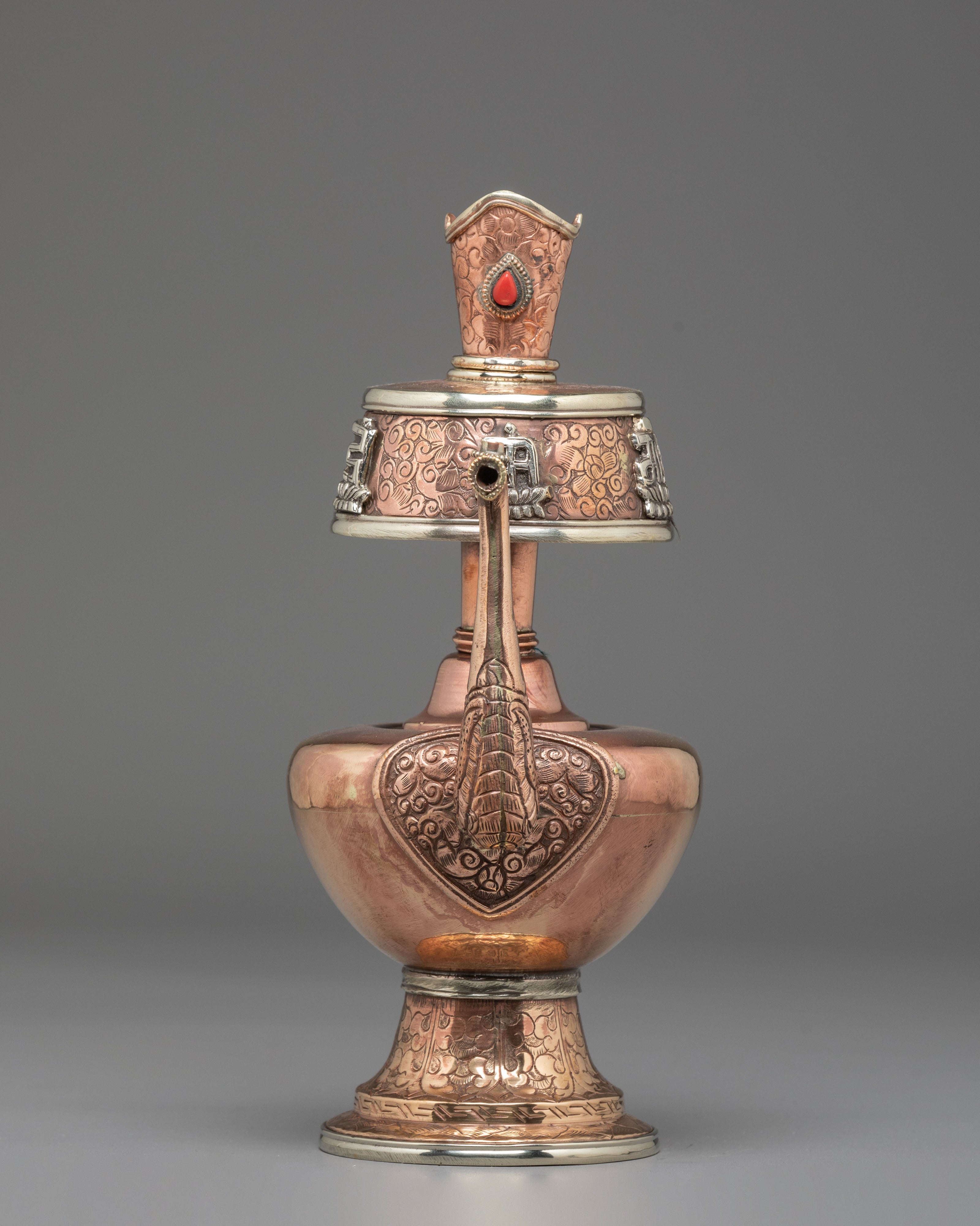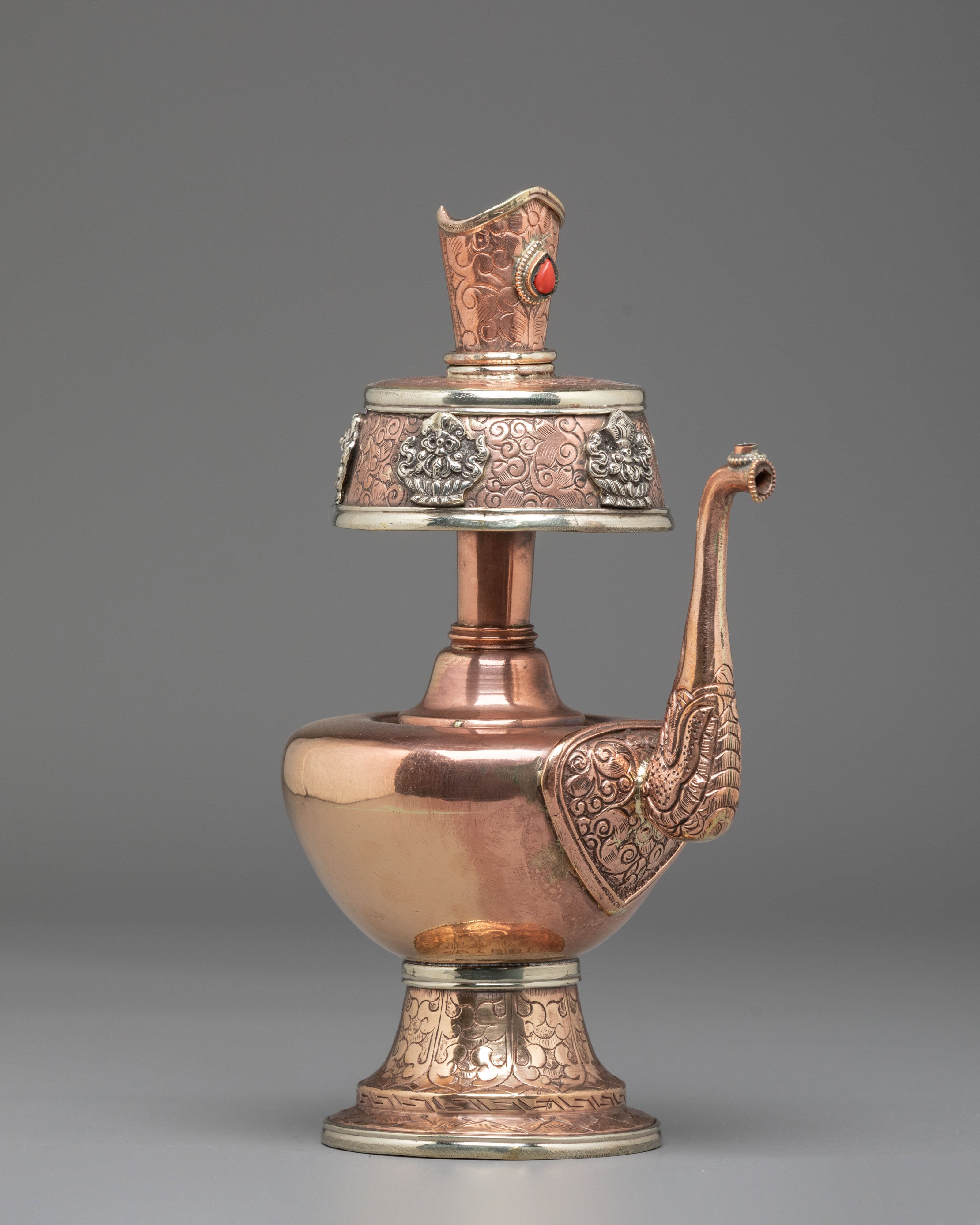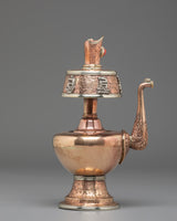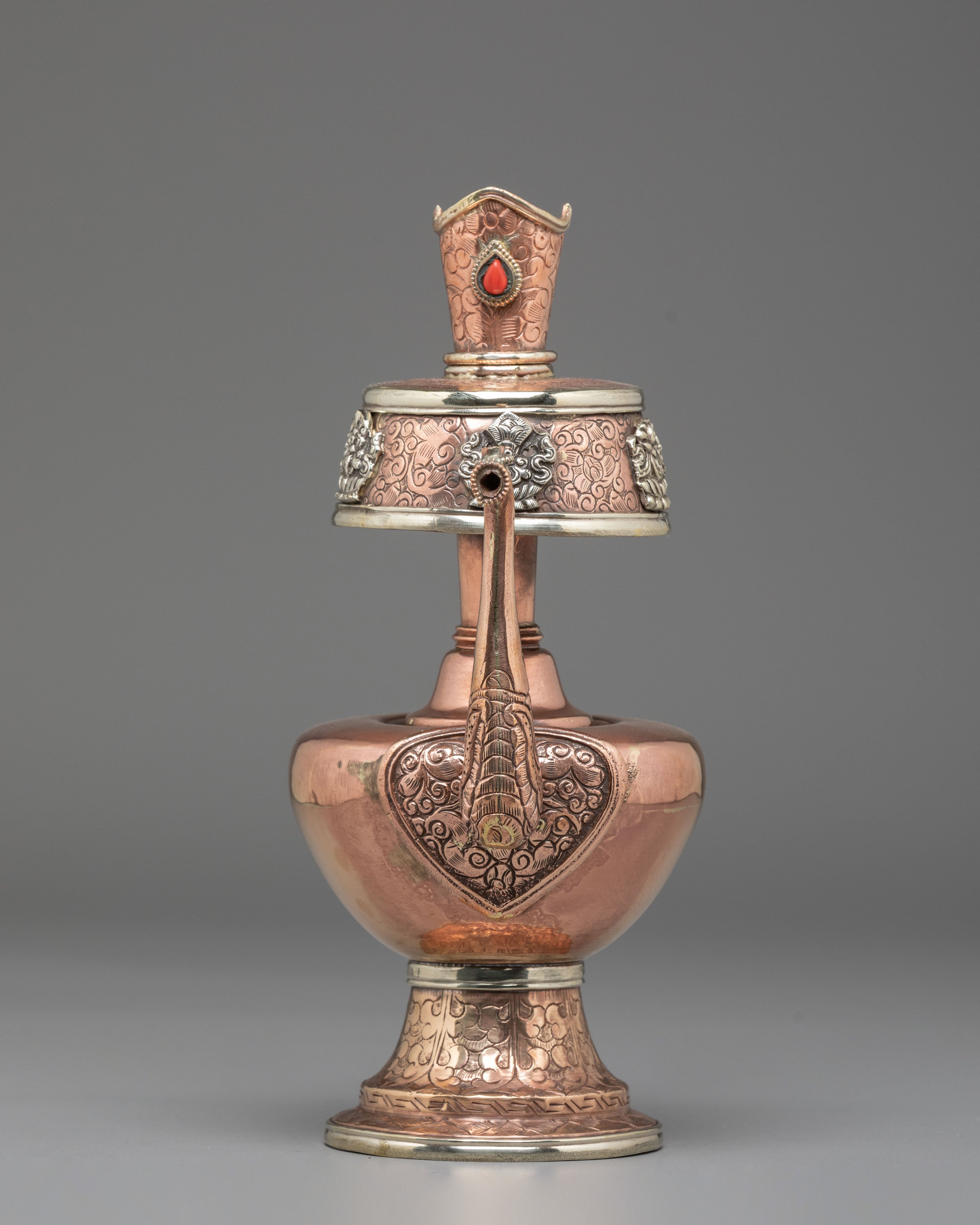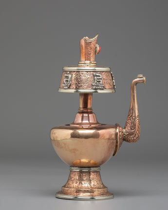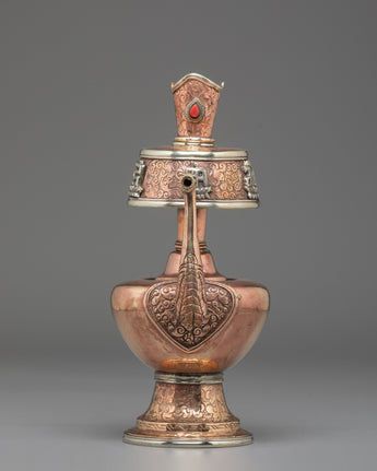 Every element of the design showcases meticulous hand-engraving, including intricate floral and auspicious motifs around the base, neck, and lid. The white metal upper section features embossed patterns that reflect timeless Himalayan symbolism, while the coral stones embedded at the crown add a vibrant touch of color and meaning. The long handle and spout design follows traditional style, often associated with purity and the flow of blessings. This bhumba set is used during rituals involving consecration water, purification ceremonies, and the invocation of blessings—making it a meaningful spiritual tool for practitioners, monks, and devoted followers.