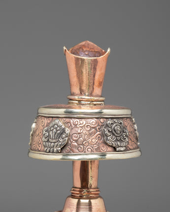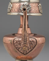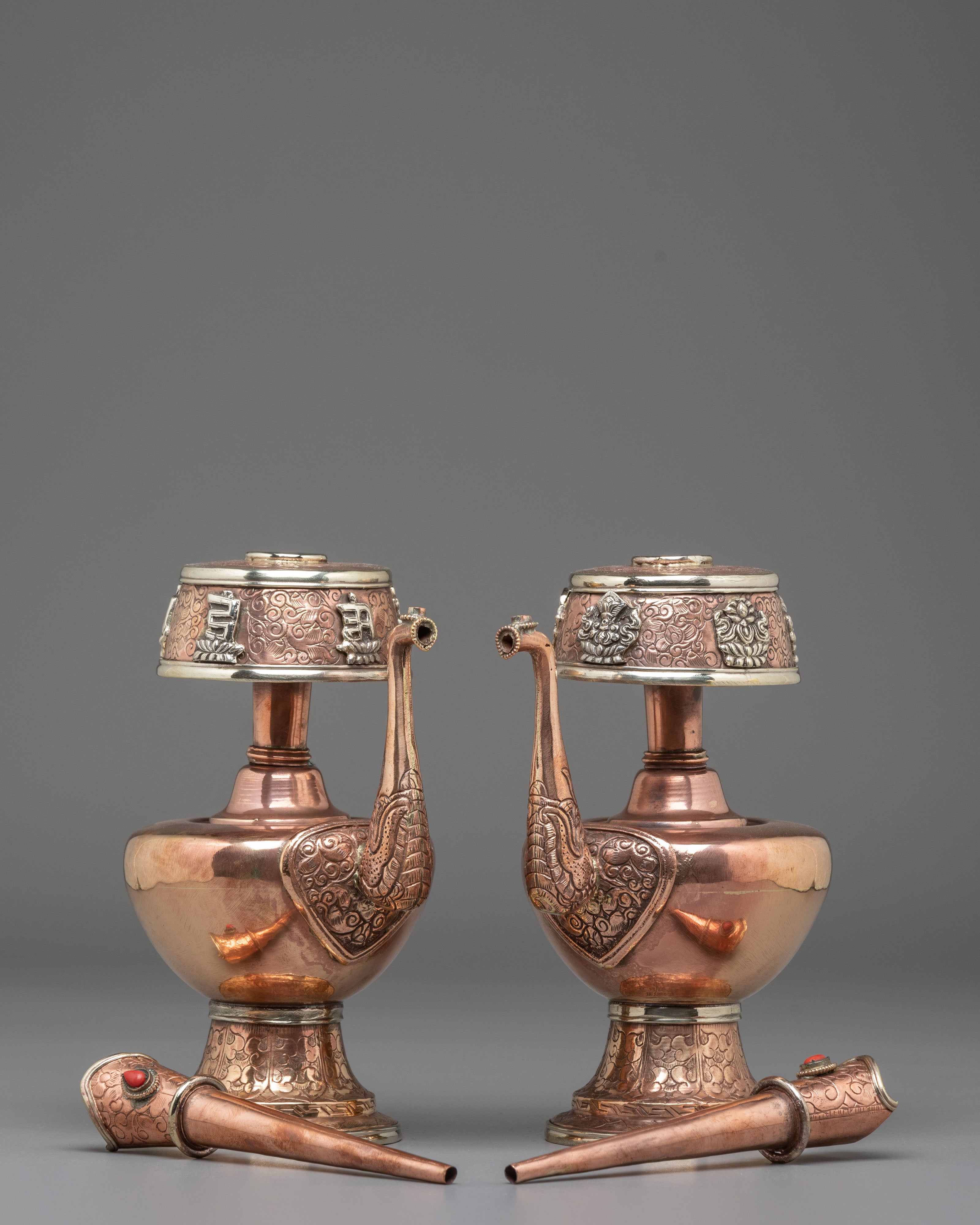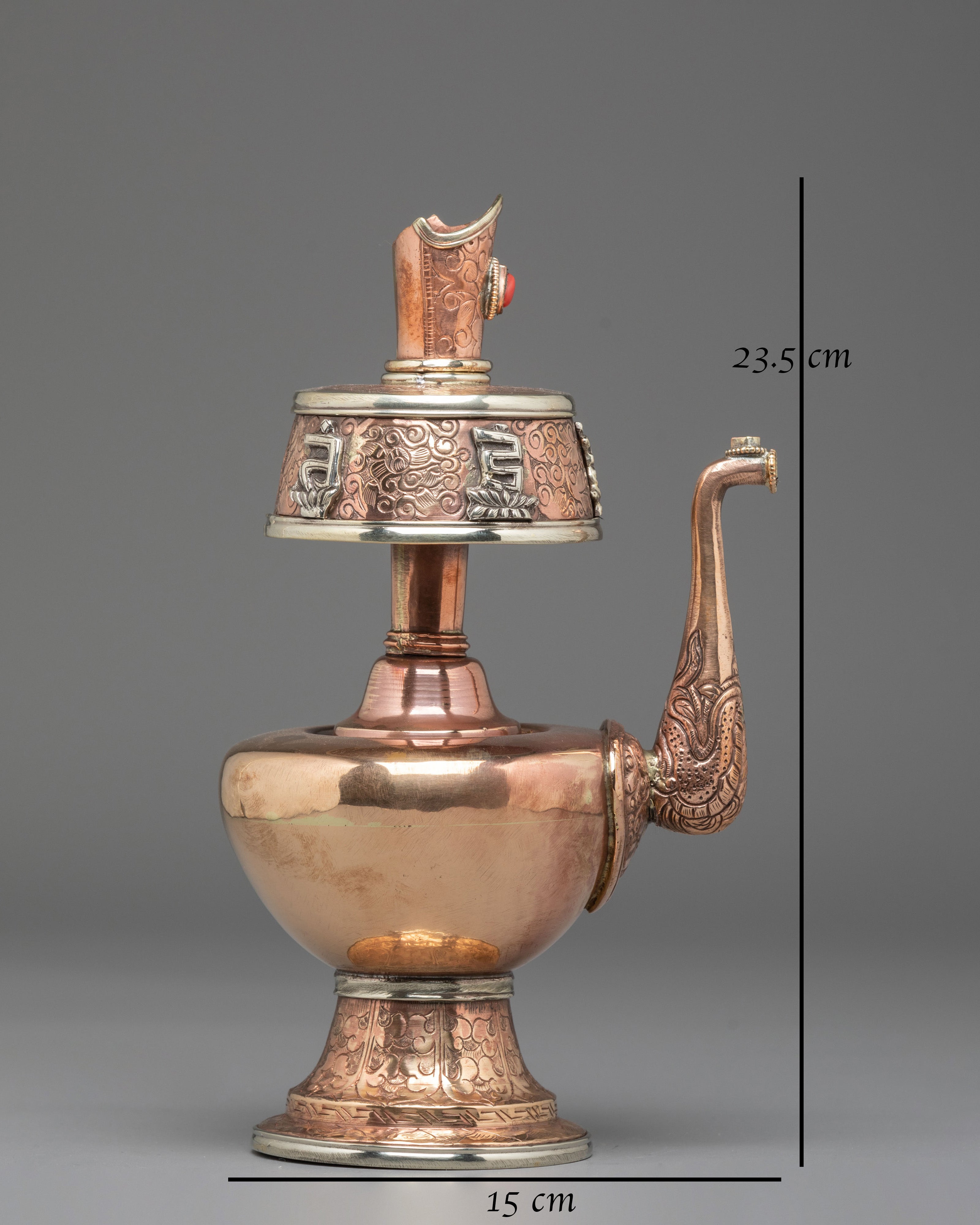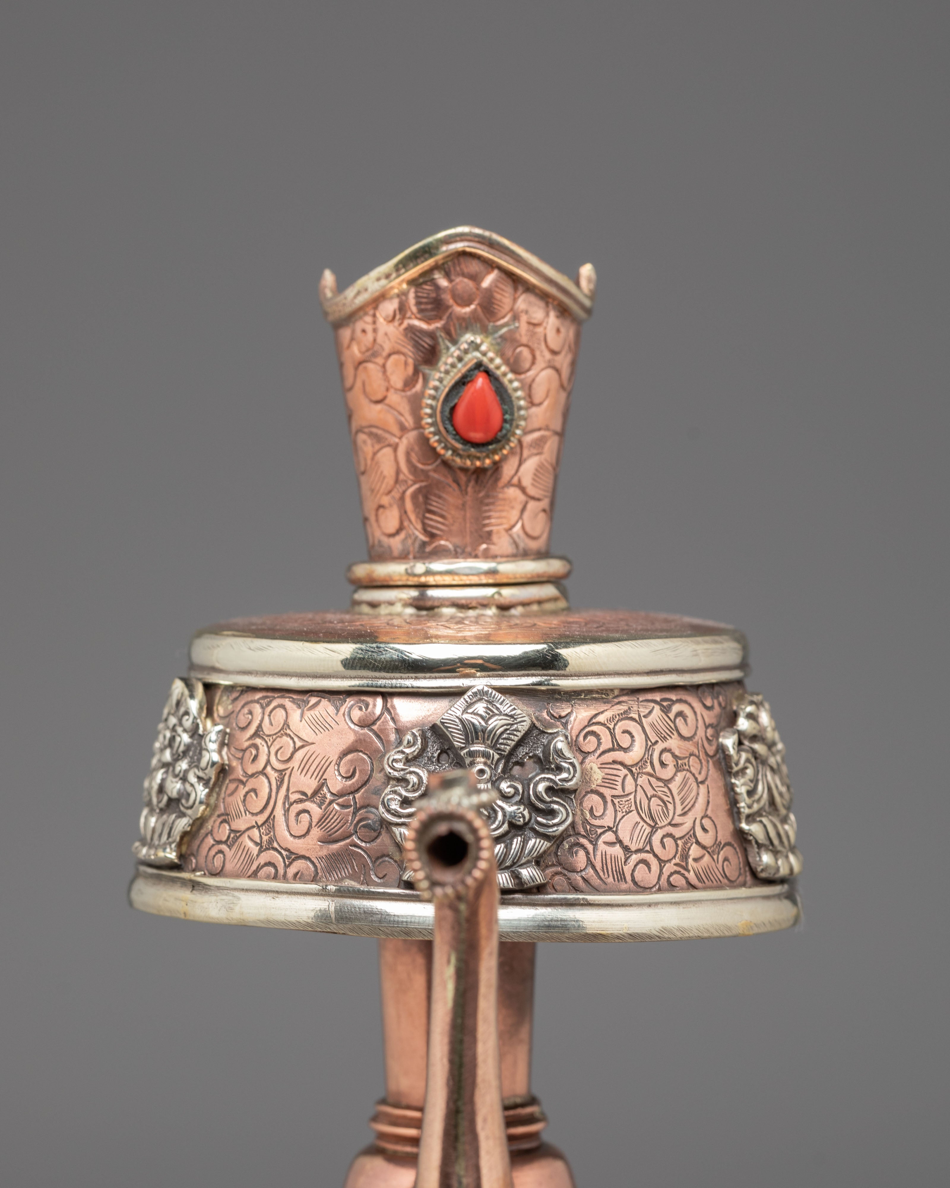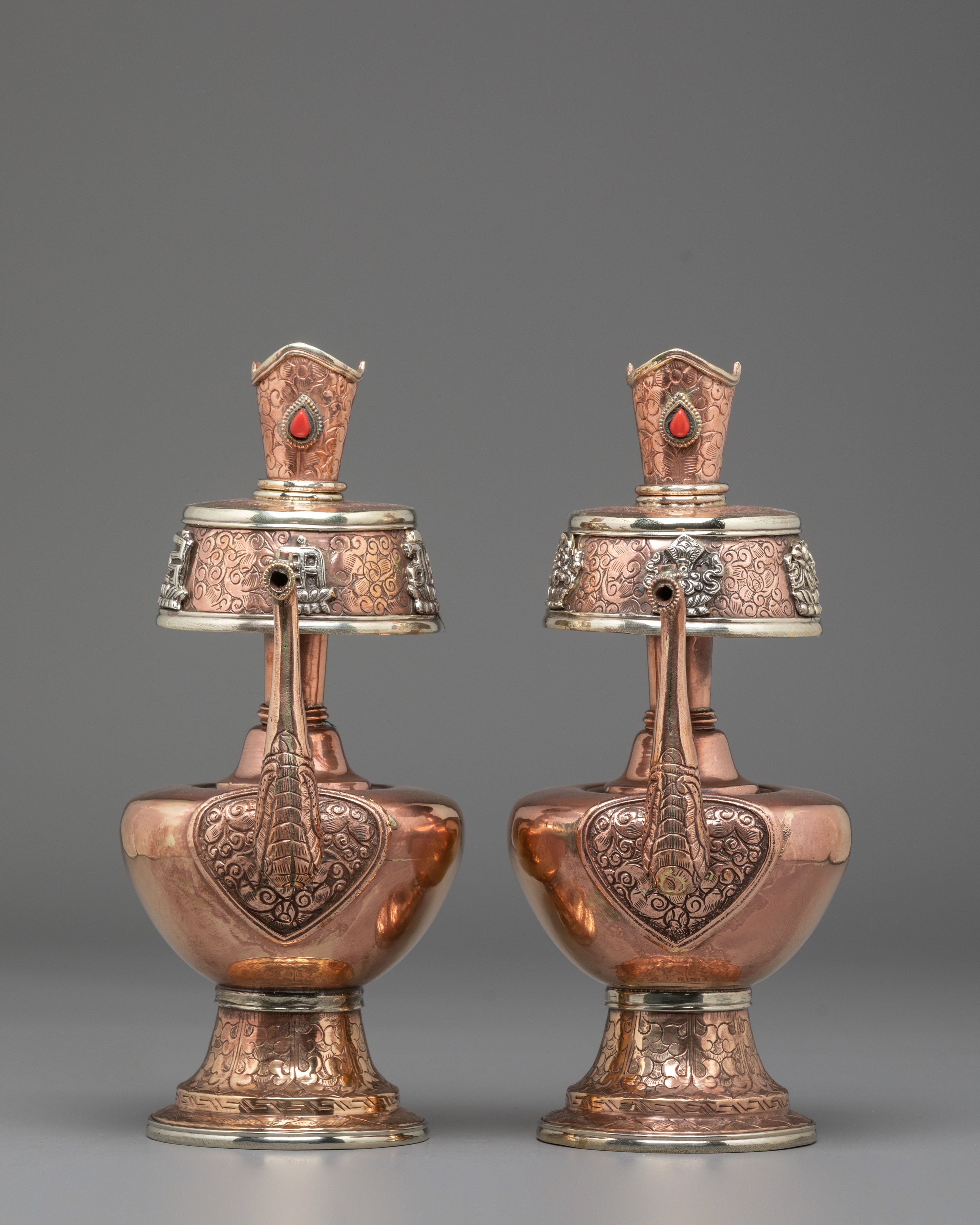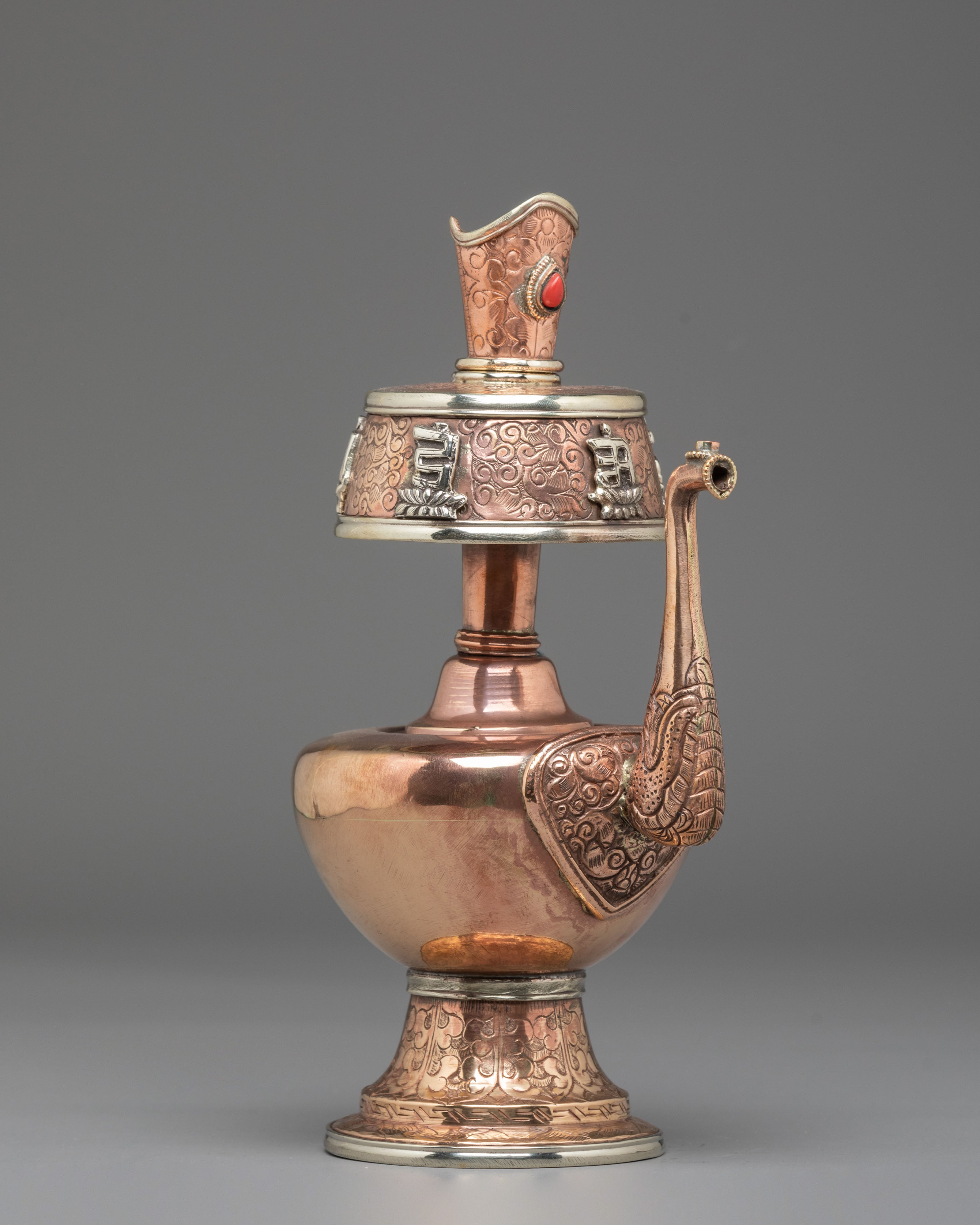 Every element of the design showcases meticulous hand-engraving, including intricate floral and auspicious motifs around the base, neck, and lid. The white metal upper section features embossed patterns that reflect timeless Himalayan symbolism, while the coral stones embedded at the crown add a vibrant touch of color and meaning. The long handle and spout design follows traditional style, often associated with purity and the flow of blessings. This bhumba set is used during rituals involving consecration water, purification ceremonies, and the invocation of blessings—making it a meaningful spiritual tool for practitioners, monks, and devoted followers.