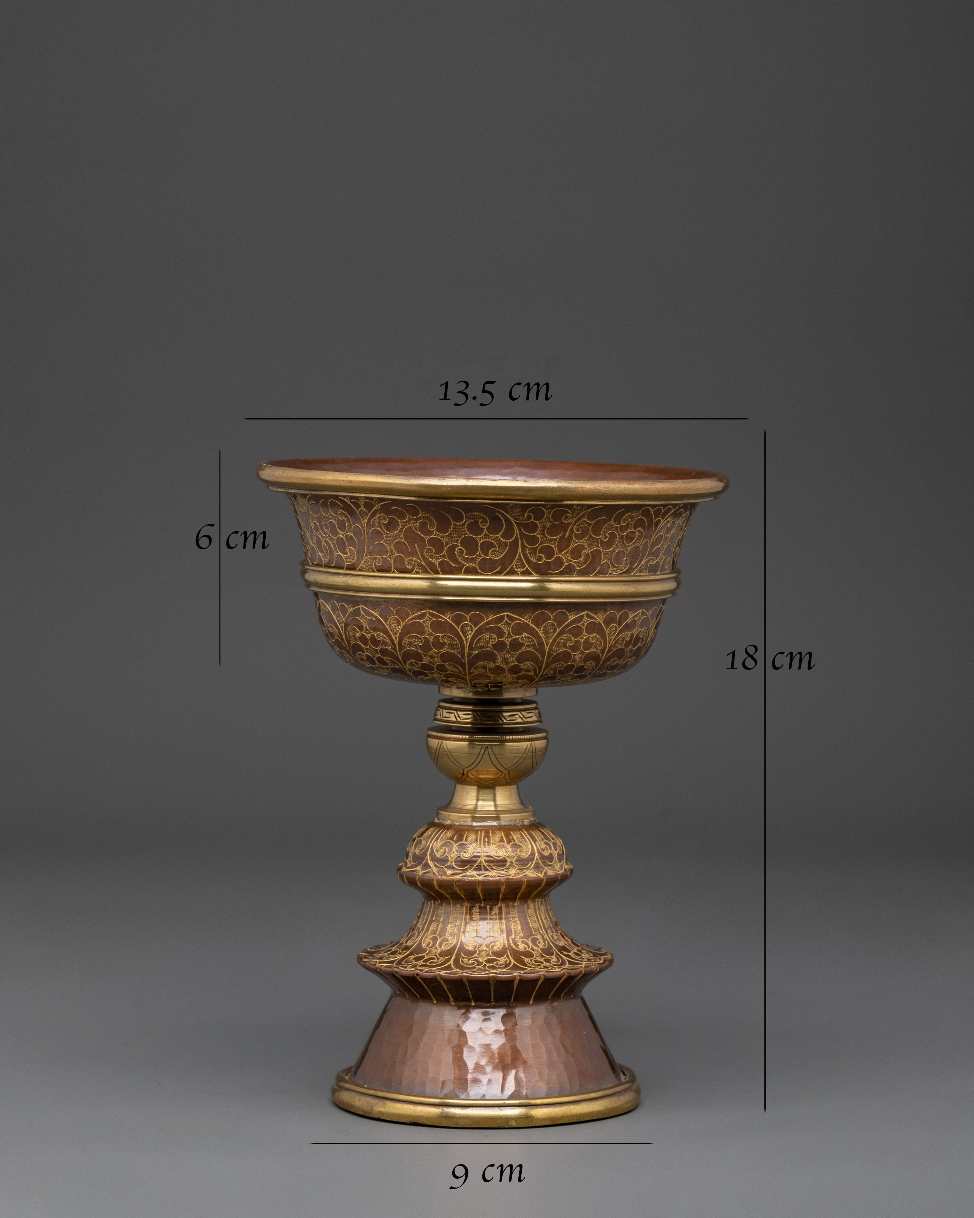 Elevate your meditation or spiritual altar with this exquisite Handmade Buddhist Ritual Butter Lamp Set. Crafted from copper and finished with a gold coating, these lamps are designed to hold traditional butter lamps used in Buddhist rituals. Measuring 18 cm in height and 13.5 cm in diameter, they combine beauty and functionality to enhance your spiritual space. This set creates a serene and devoted atmosphere, bringing a peaceful ambiance to your prayers and practices.
