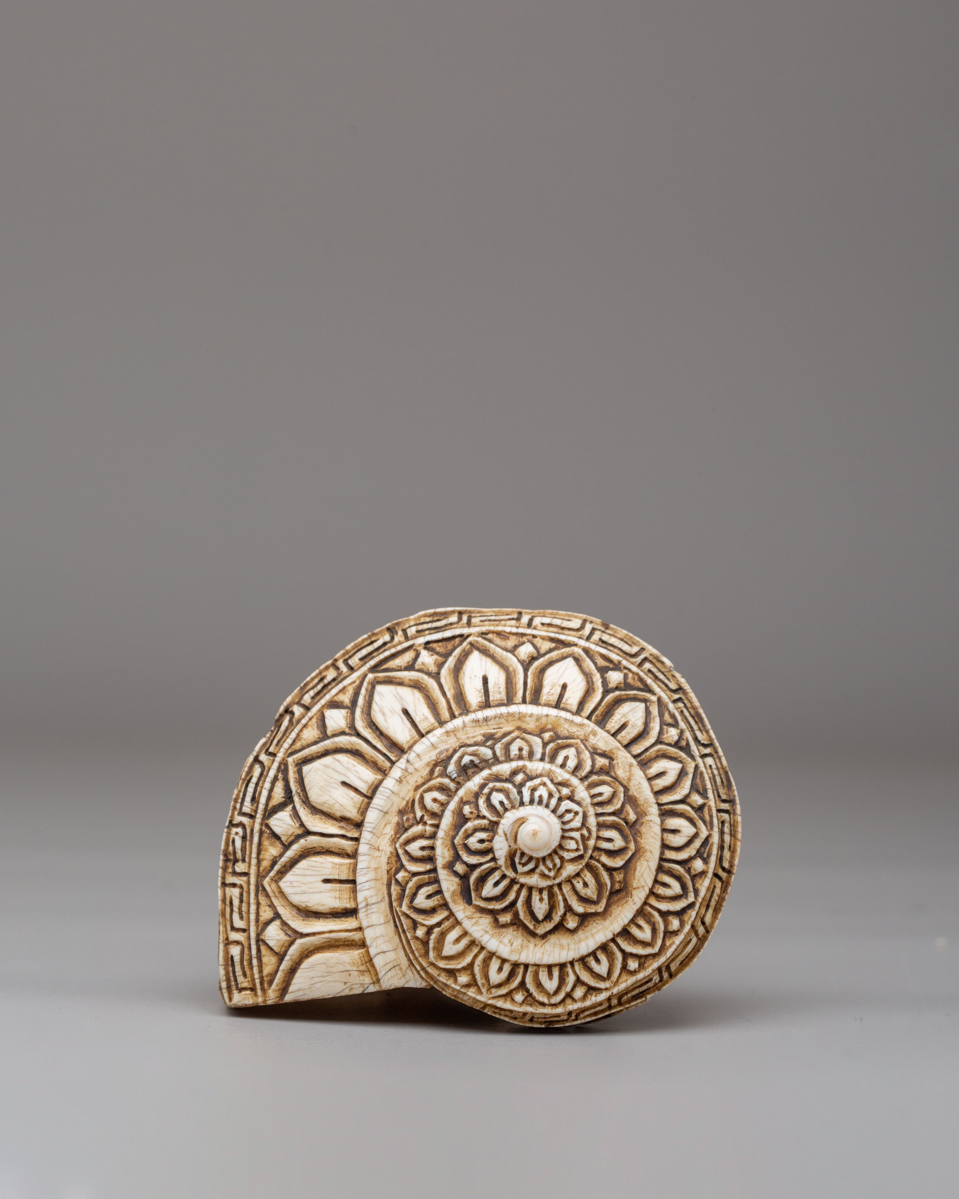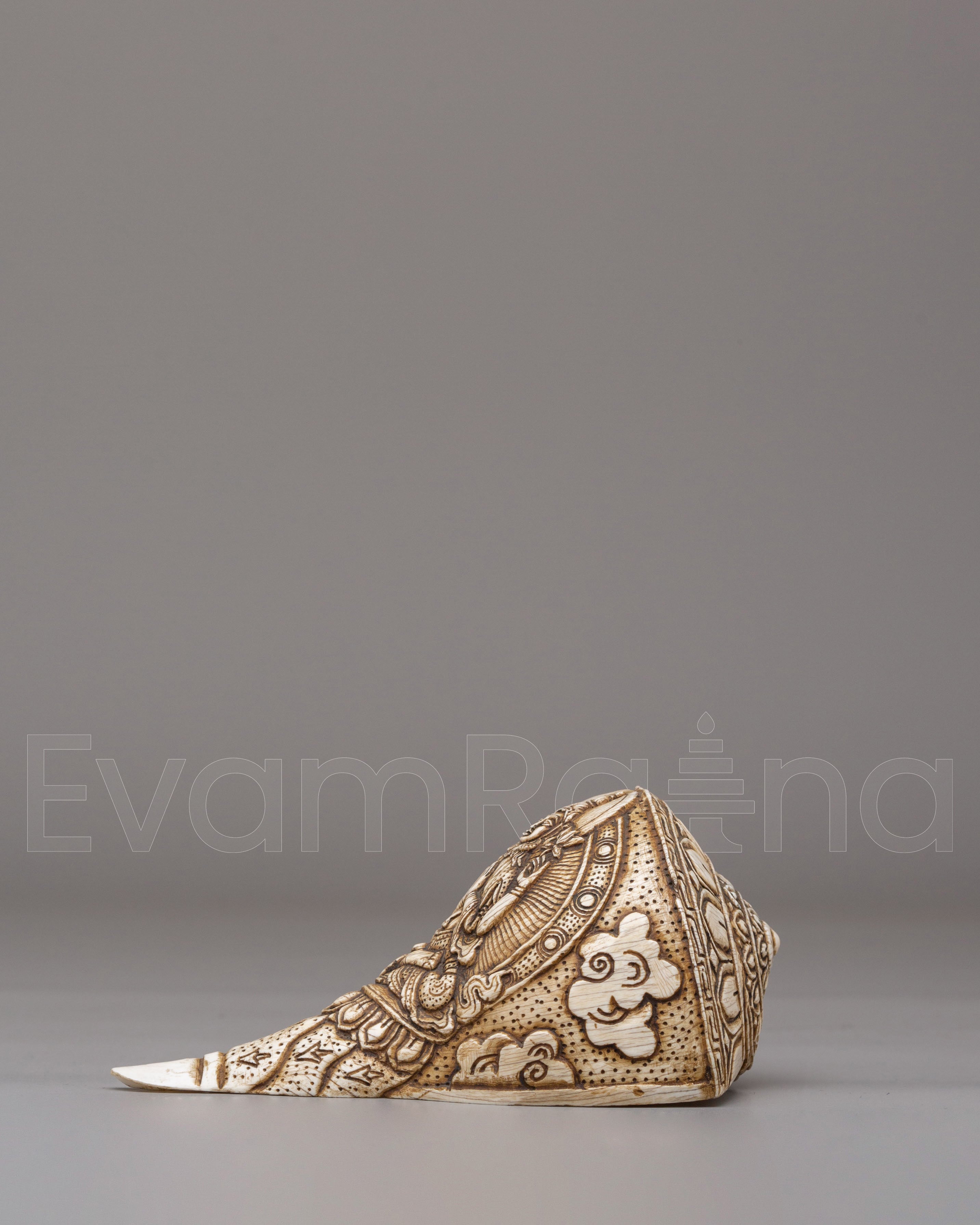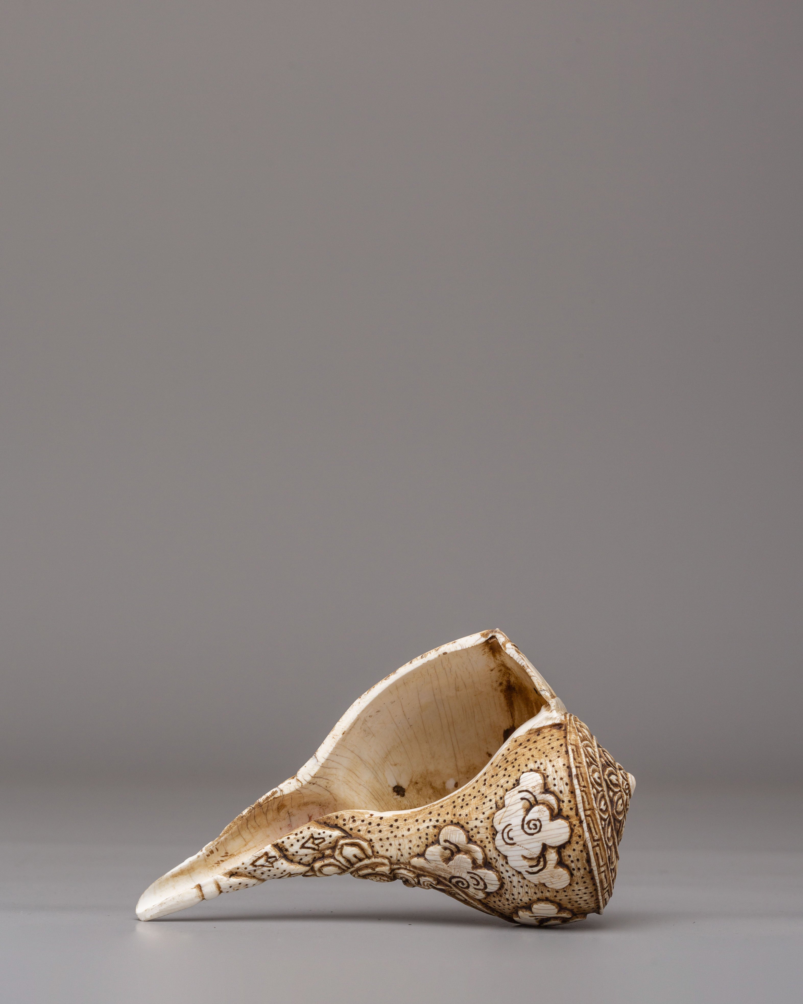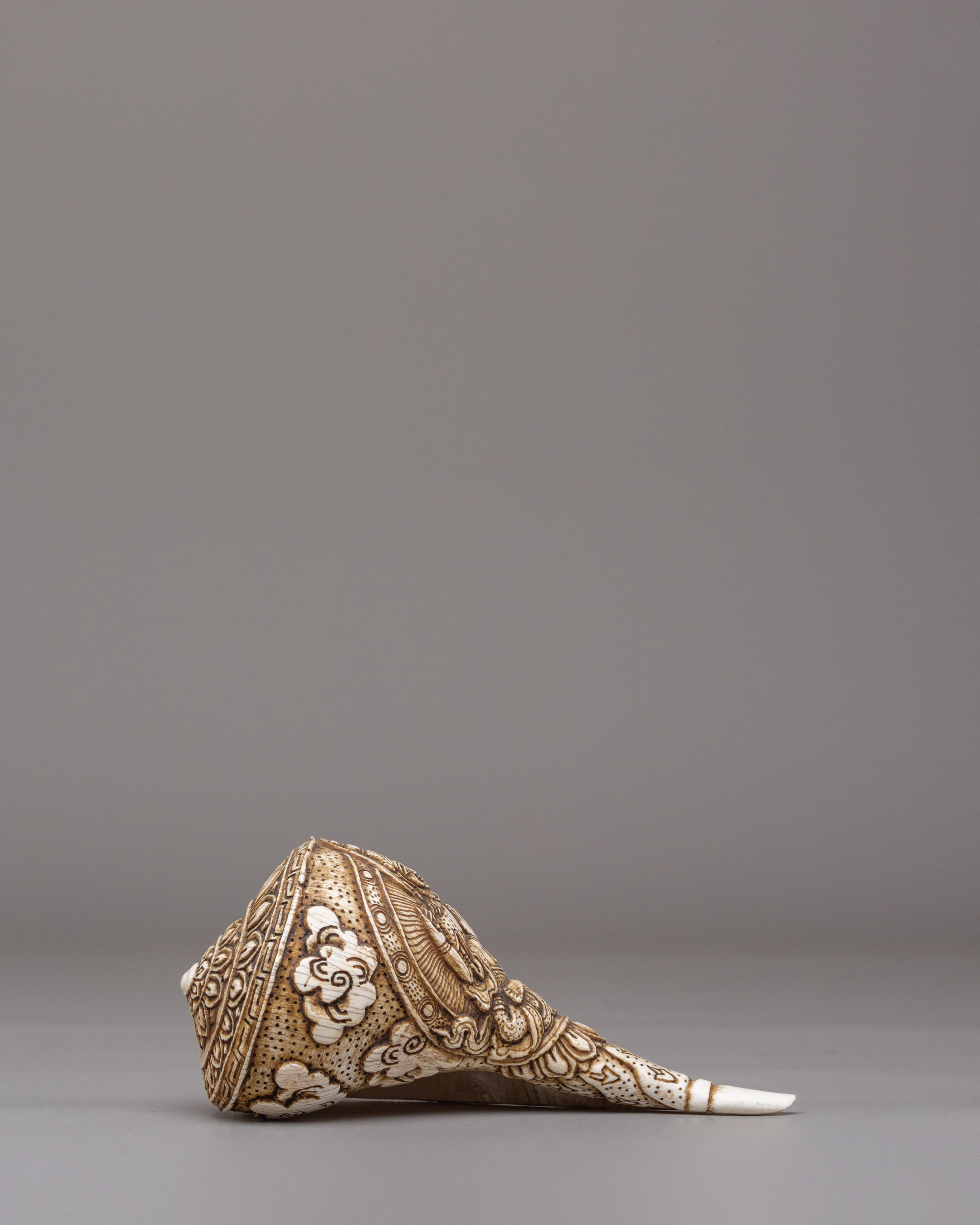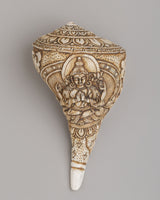 The surface of the conch is intricately carved with a deity figure surrounded by flowing ornamental patterns, highlighting refined hand-engraving techniques. The detailed facial expression, balanced posture, and surrounding motifs reflect classical Tibetan iconography, in which every curve and line carries symbolic meaning. The natural texture of the conch shell blends harmoniously with the carved imagery, creating a visually striking and spiritually meaningful form.