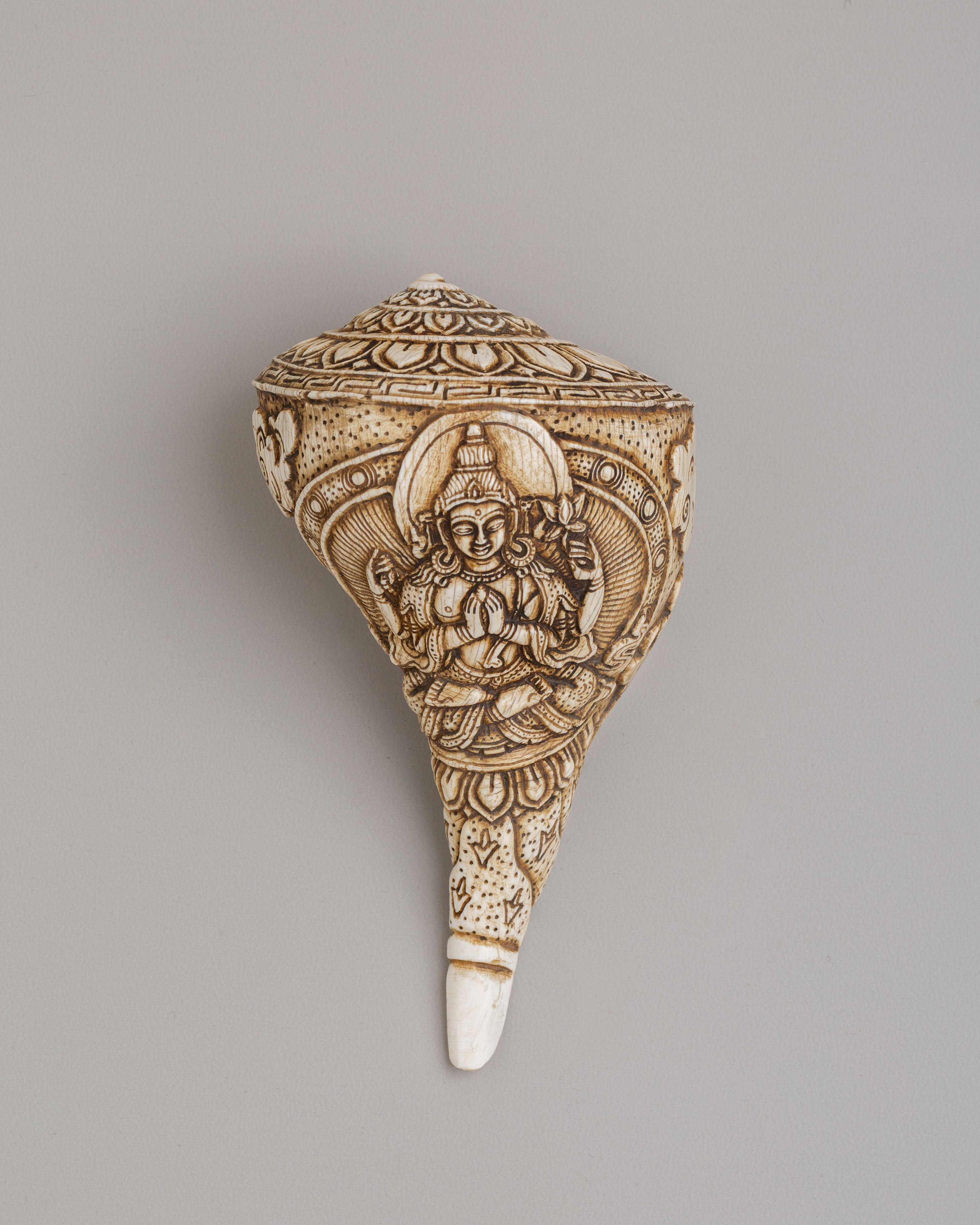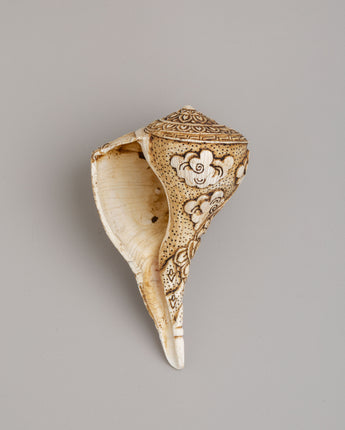 A conch shell is a natural object often used in religious ceremonies. It serves as a trumpet or an offertory receptacle, and is frequently depicted in the hands of divinities in Buddhist and Hindu iconography. It symbolizes the spoken word 'Om,' representing the sound of the cosmos according to Buddhist and Hindu traditions.