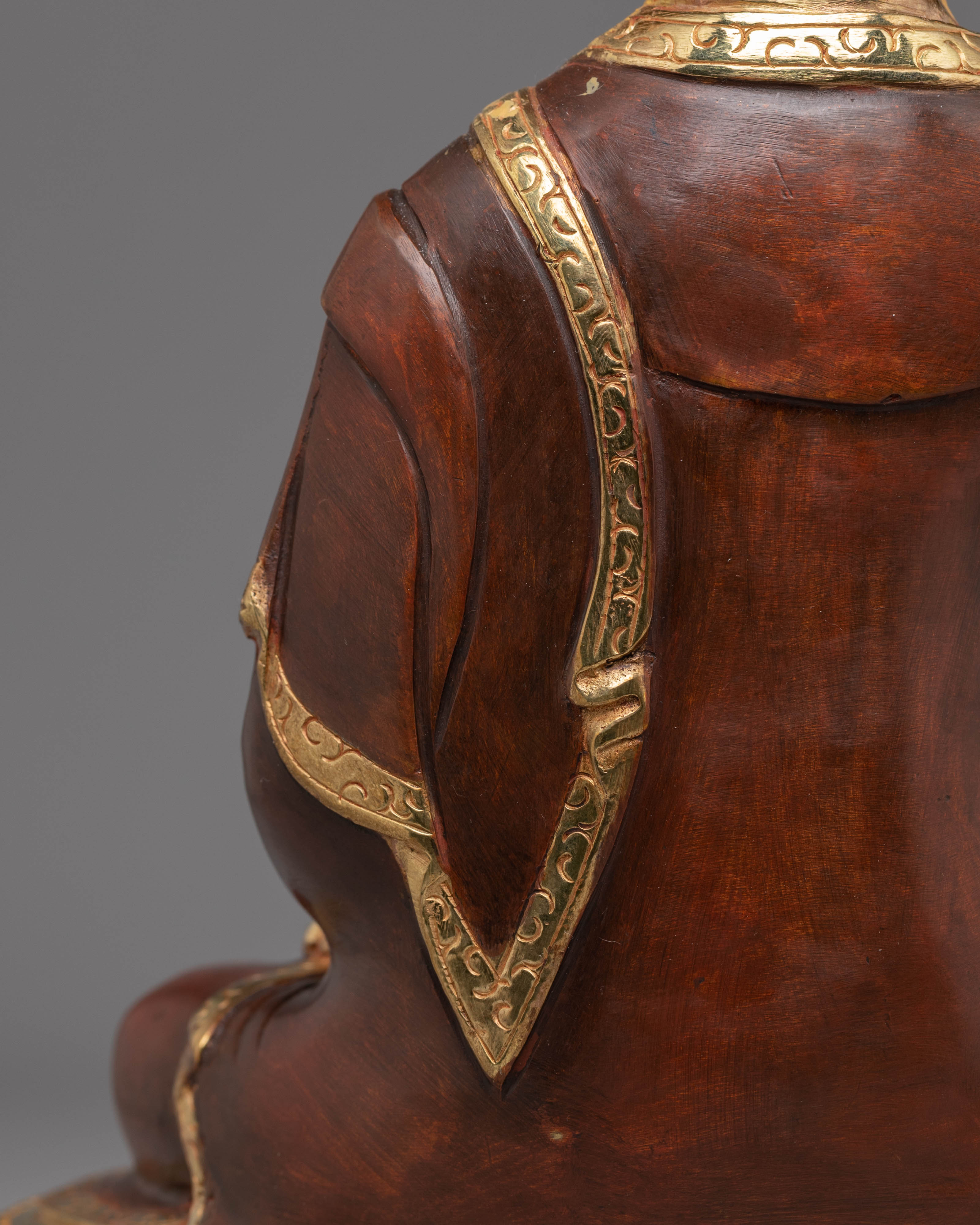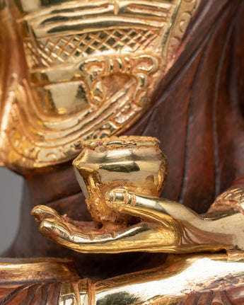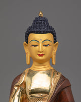 This Oxidized Copper Statue of Shakyamuni Buddha stands 32.5cm tall and 21cm wide, weighing 2.85kg, making it a substantial presence in any sacred space. Crafted from copper, with gold plating and acrylic color accents, this statue exudes a serene, enlightened presence. The use of oxidized copper ensures the statue has a timeless, antique finish, while the gold plating adds a radiant shine, symbolizing the Buddha’s enlightened nature. The primary keyword “Oxidized Copper Statue of Shakyamuni Buddha” strengthens SEO and attracts buyers seeking authentic spiritual artifacts.