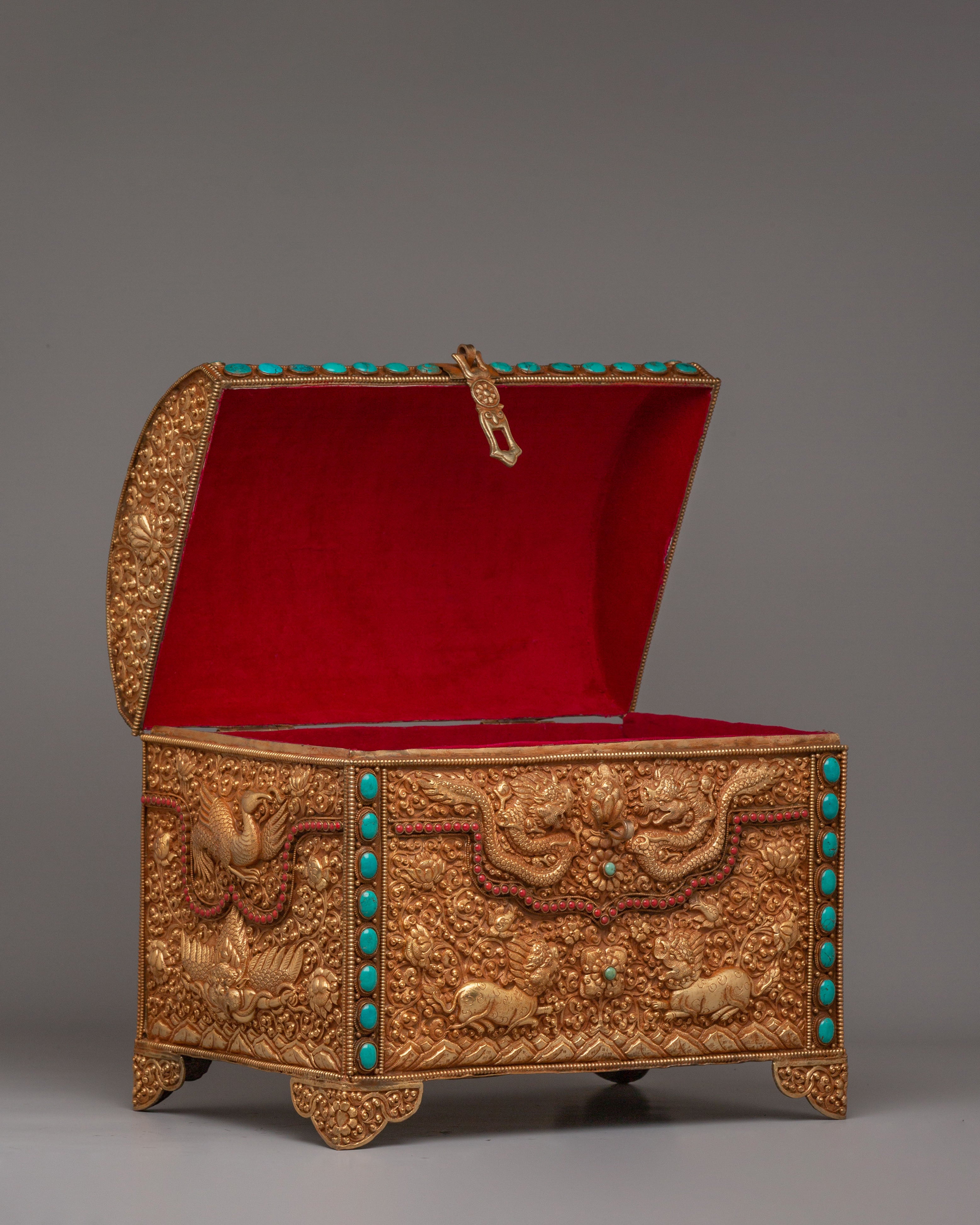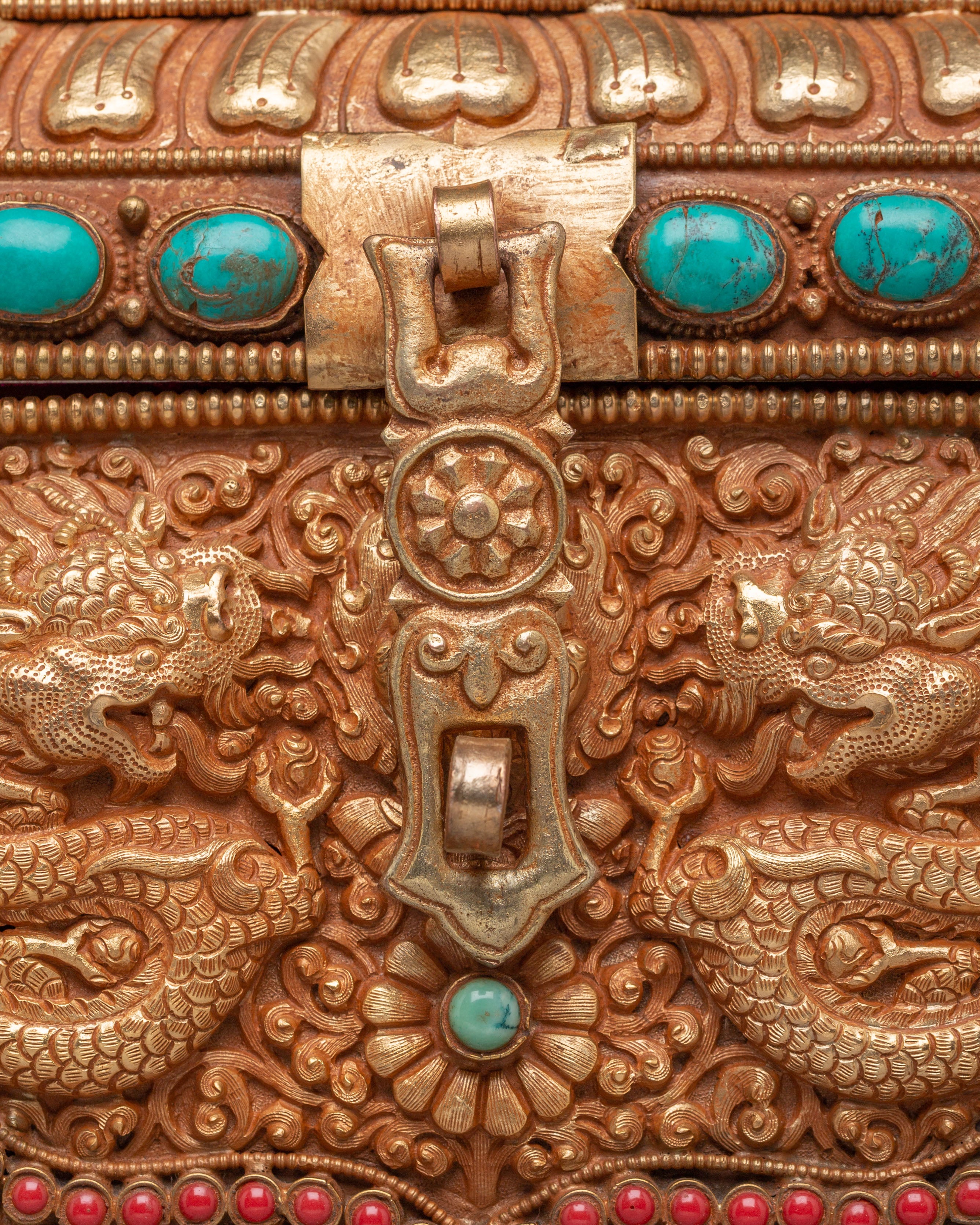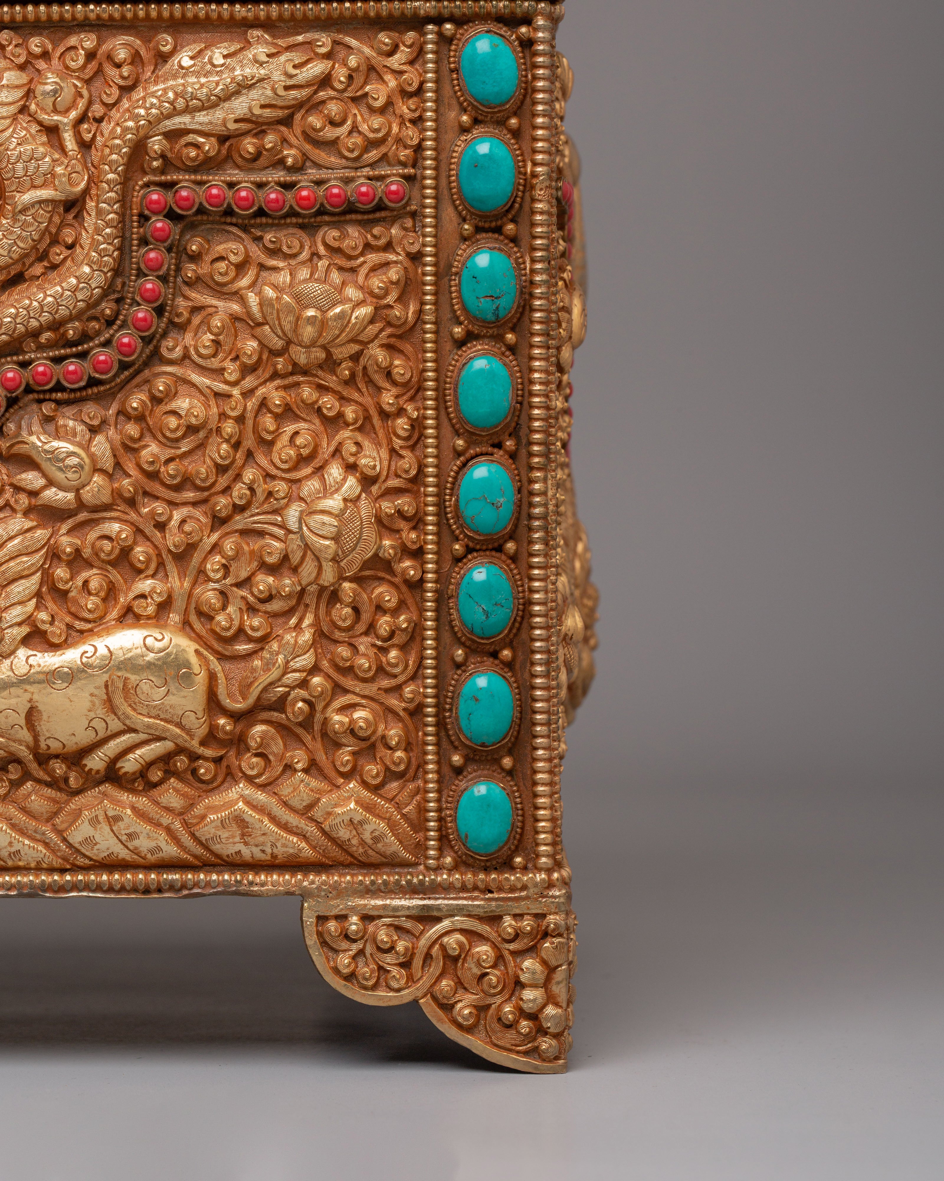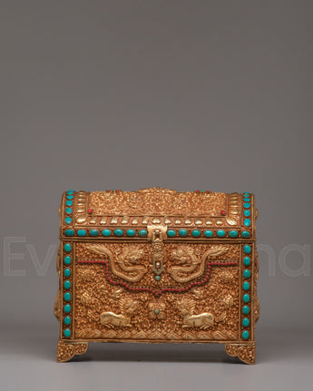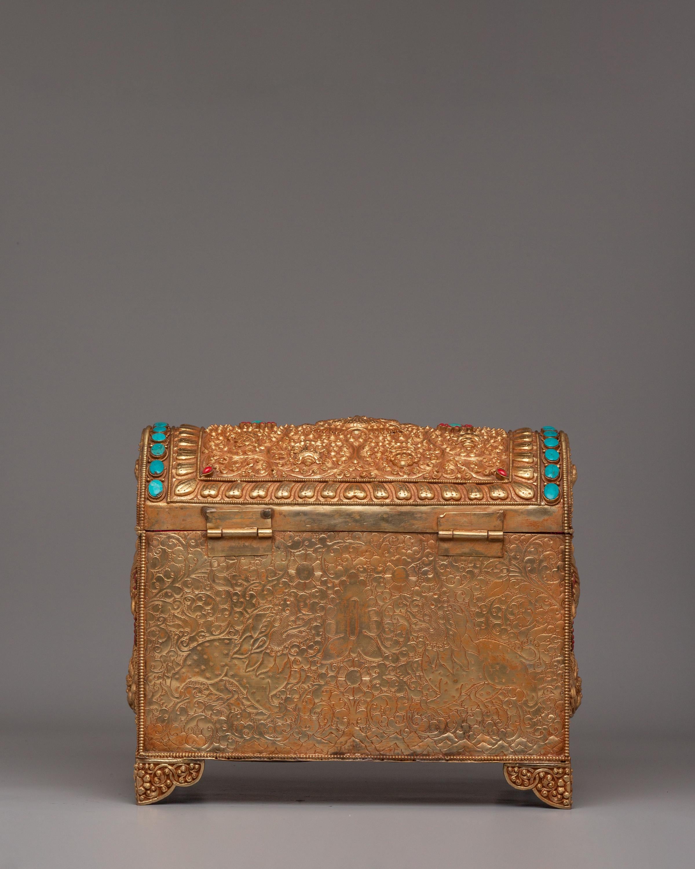 This treasure box is ideal for storing jewelry, precious items, or sacred objects, while also serving as a beautiful decorative piece. Its luxurious gold-plated copper body and gemstone embellishments make it a standout addition to any room, adding elegance and a touch of Tibetan heritage. Whether placed in the living room, bedroom, or office, it enhances the décor and becomes a treasured item for years to come.