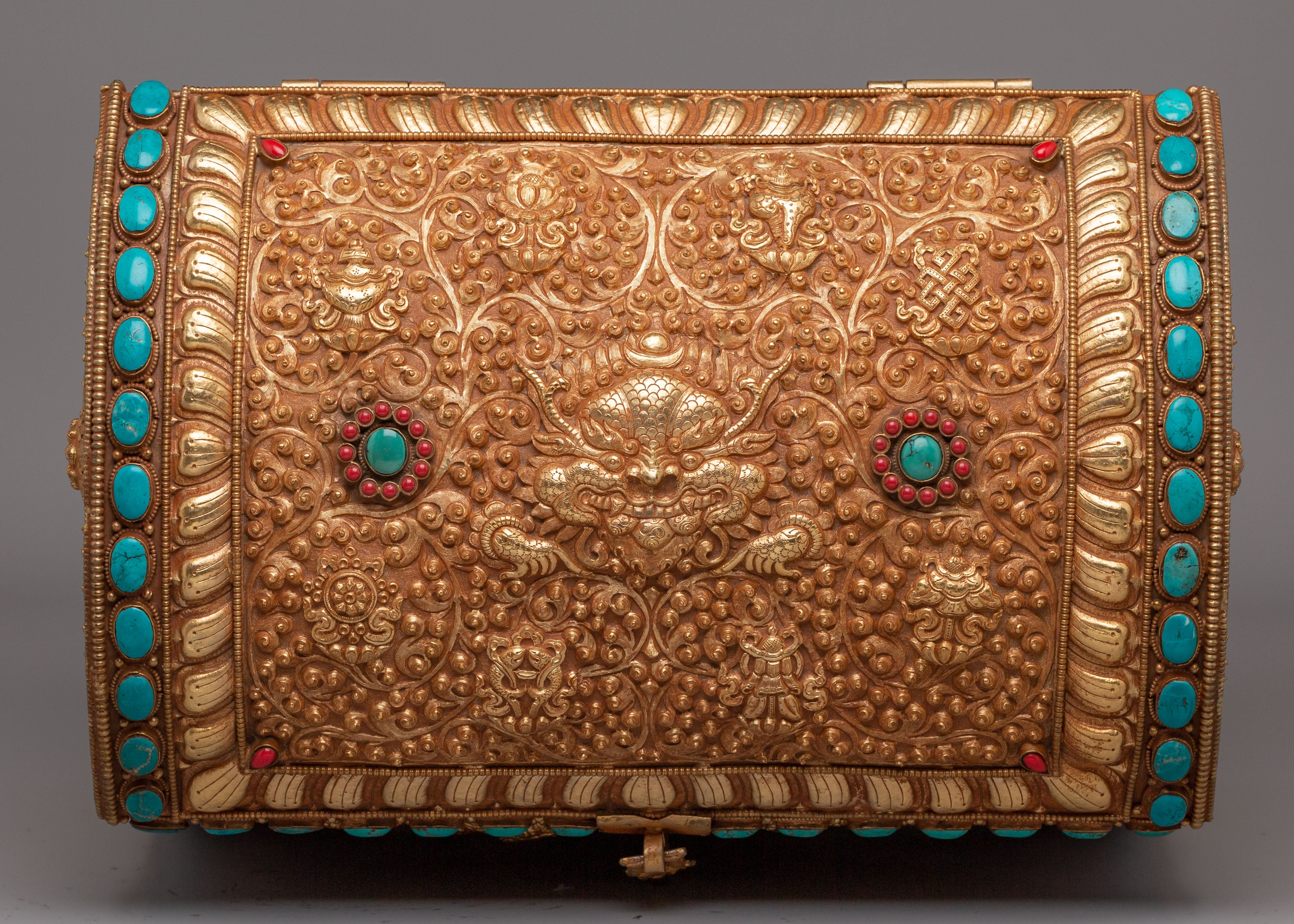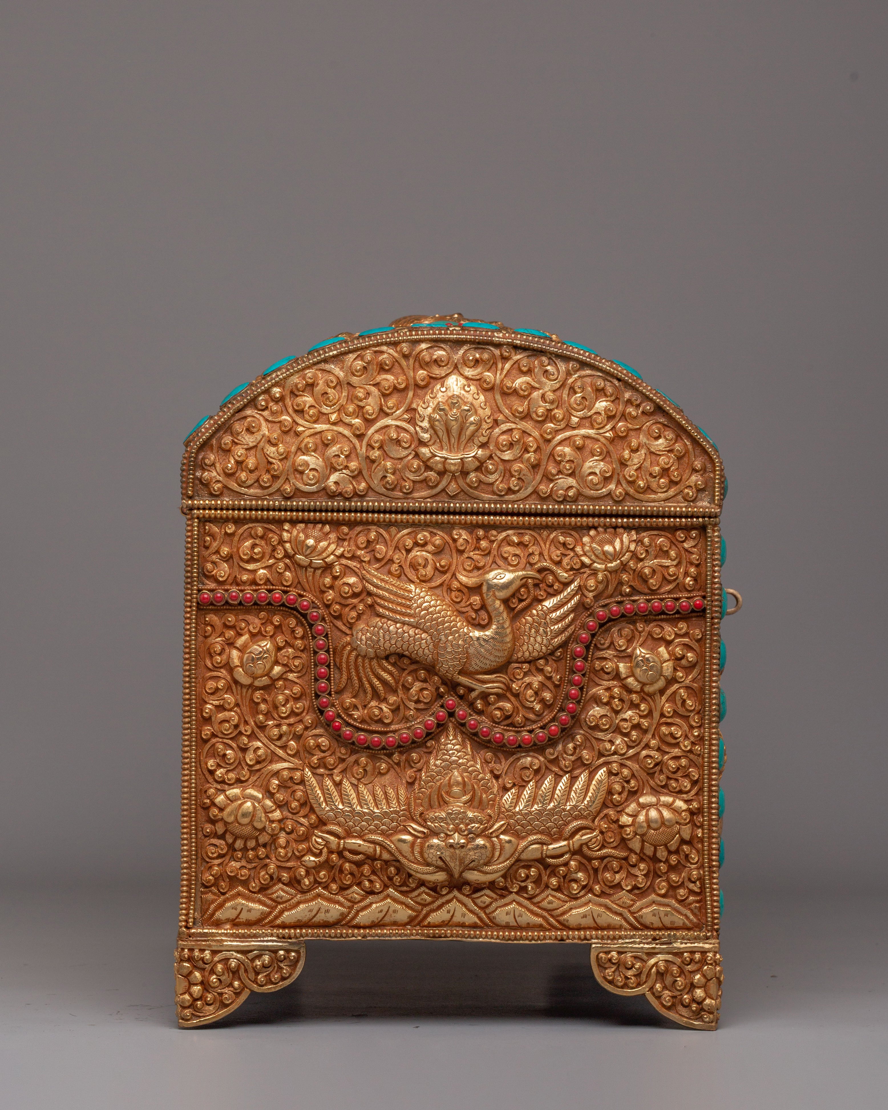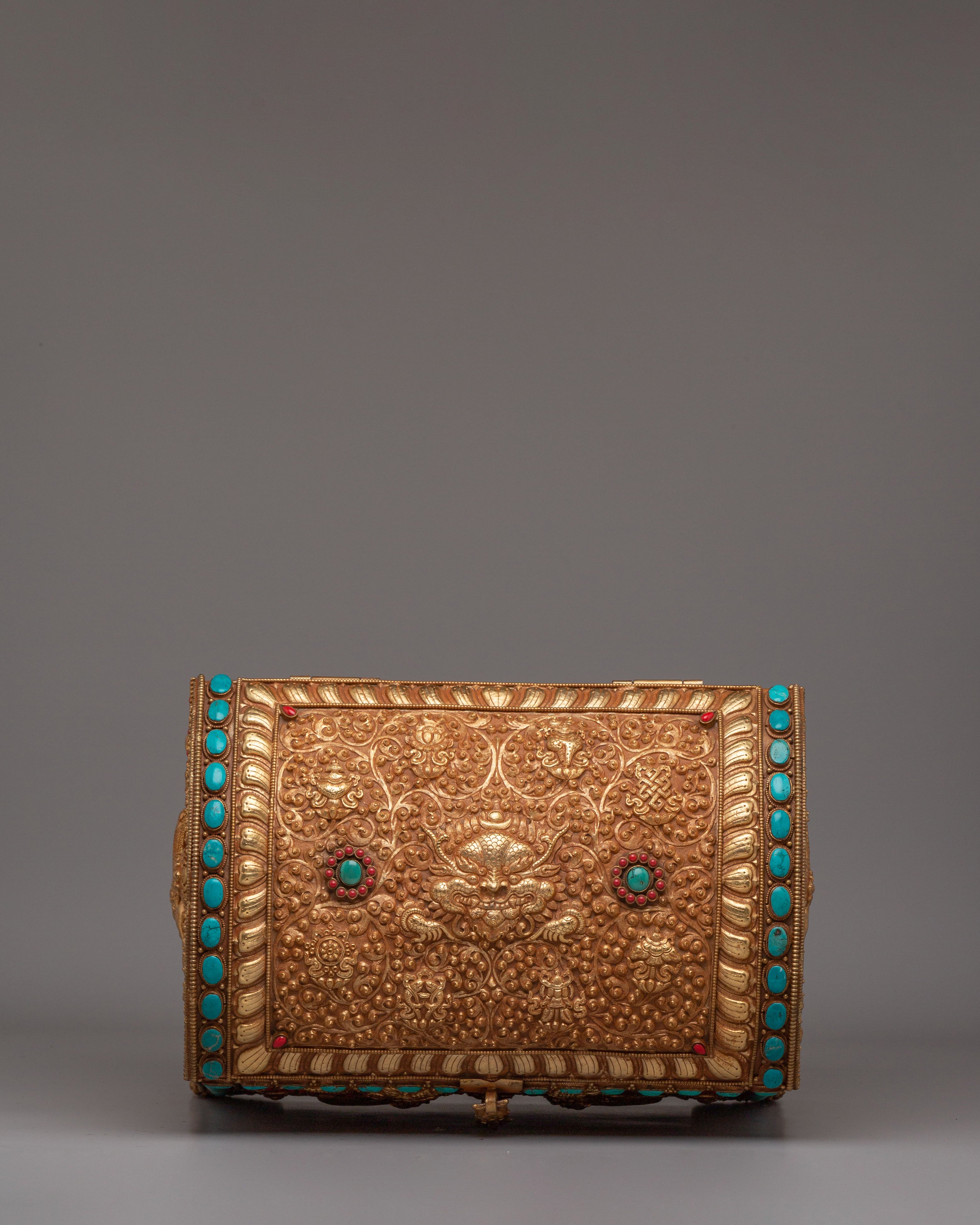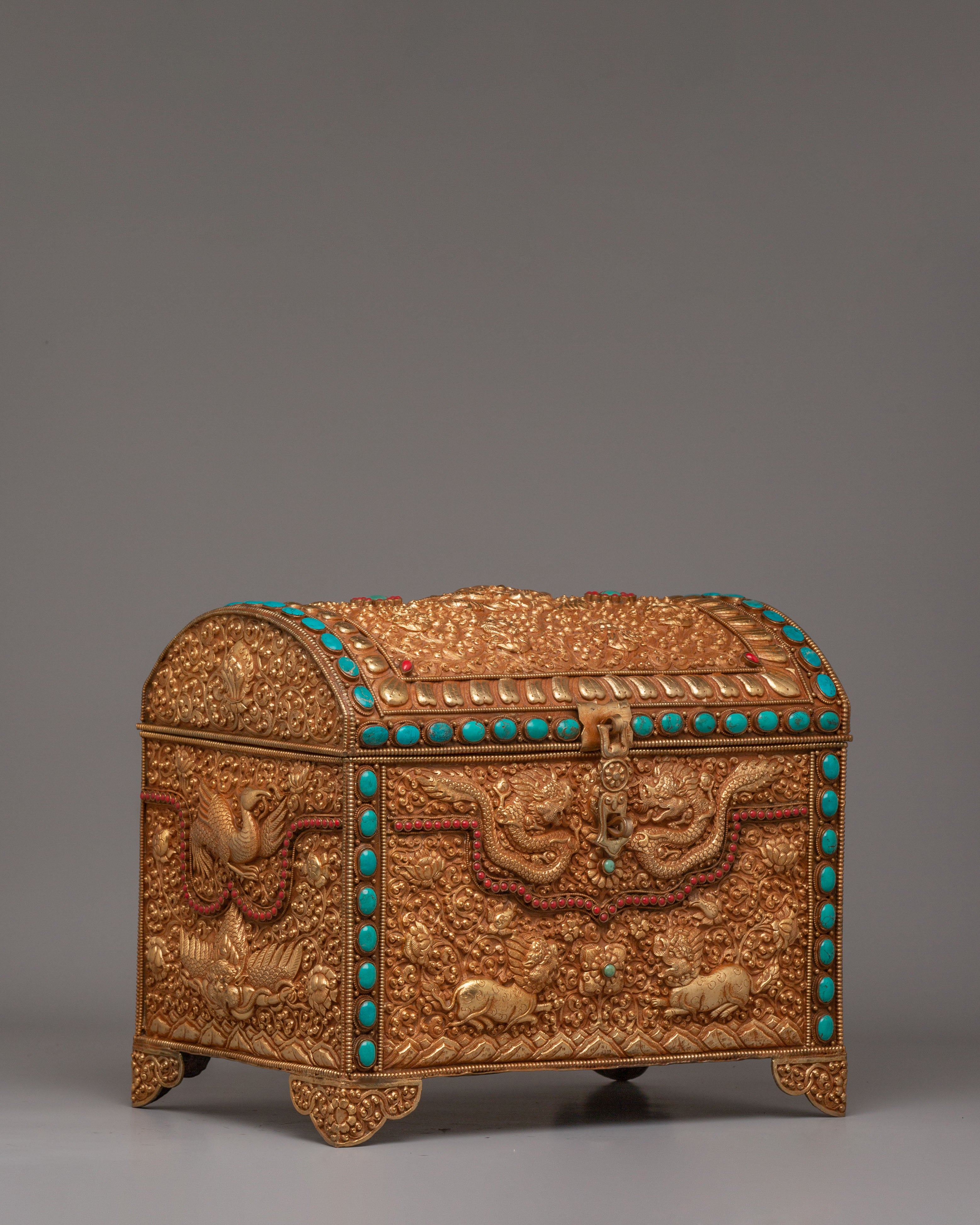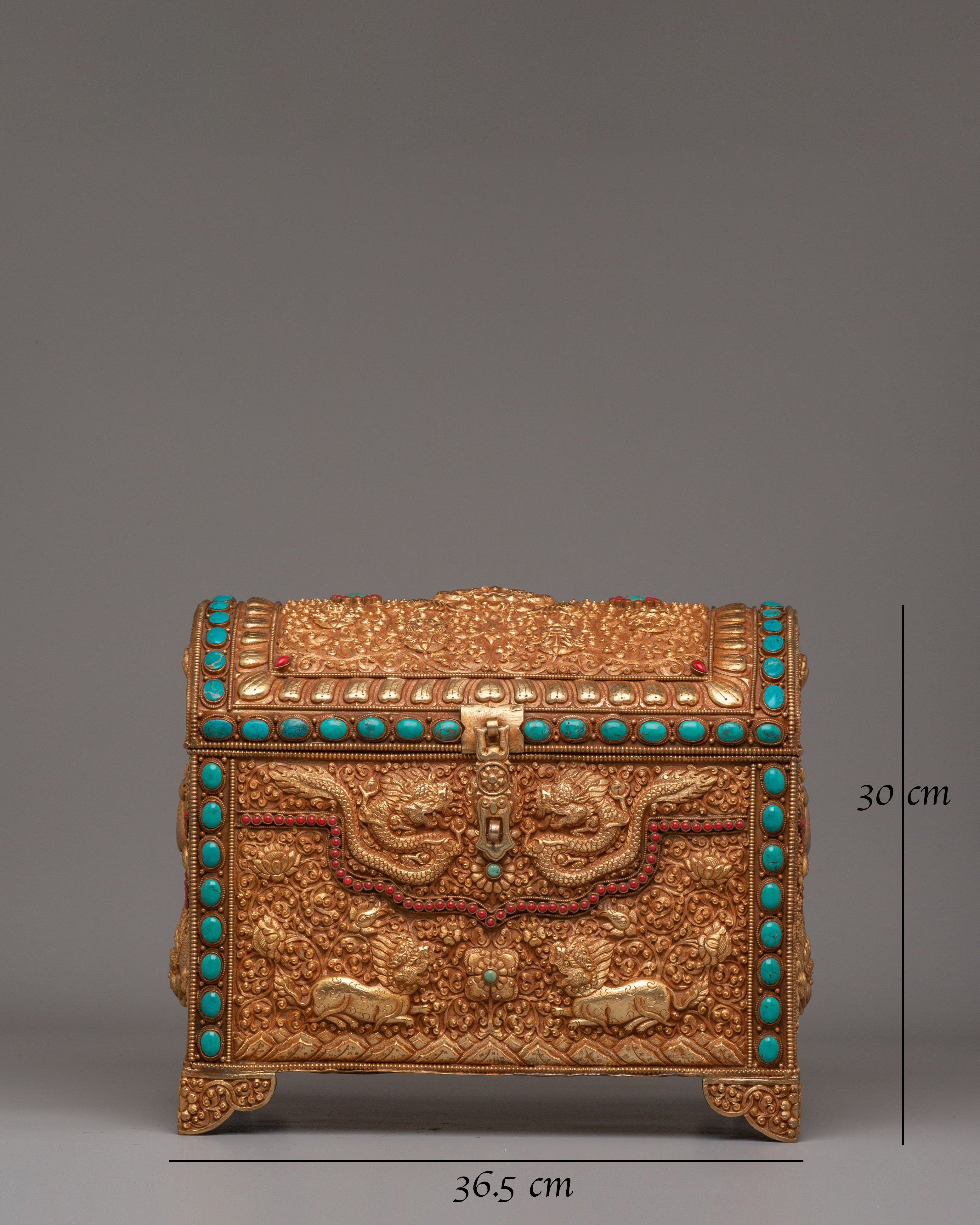 This treasure box is ideal for storing jewelry, precious items, or sacred objects, while also serving as a beautiful decorative piece. Its luxurious gold-plated copper body and gemstone embellishments make it a standout addition to any room, adding elegance and a touch of Tibetan heritage. Whether placed in the living room, bedroom, or office, it enhances the décor and becomes a treasured item for years to come.