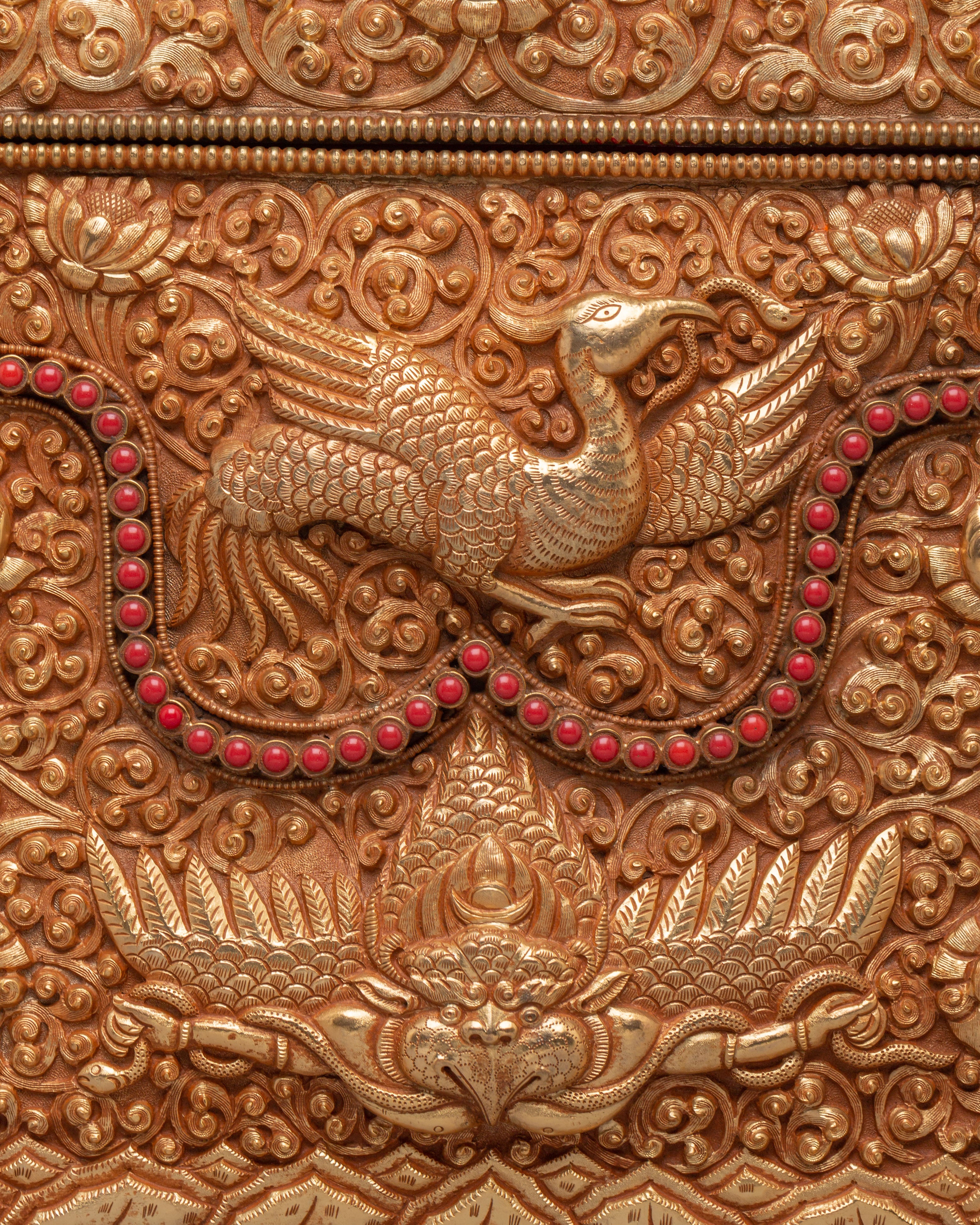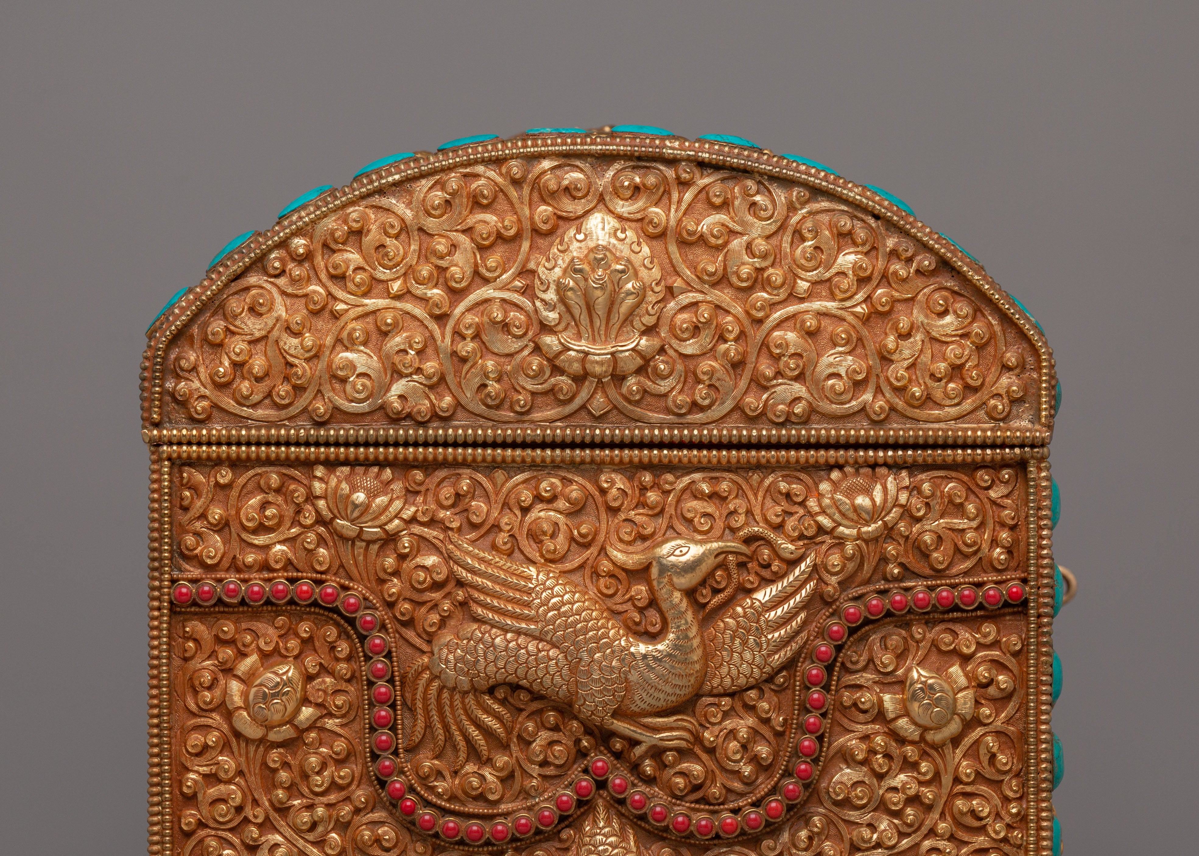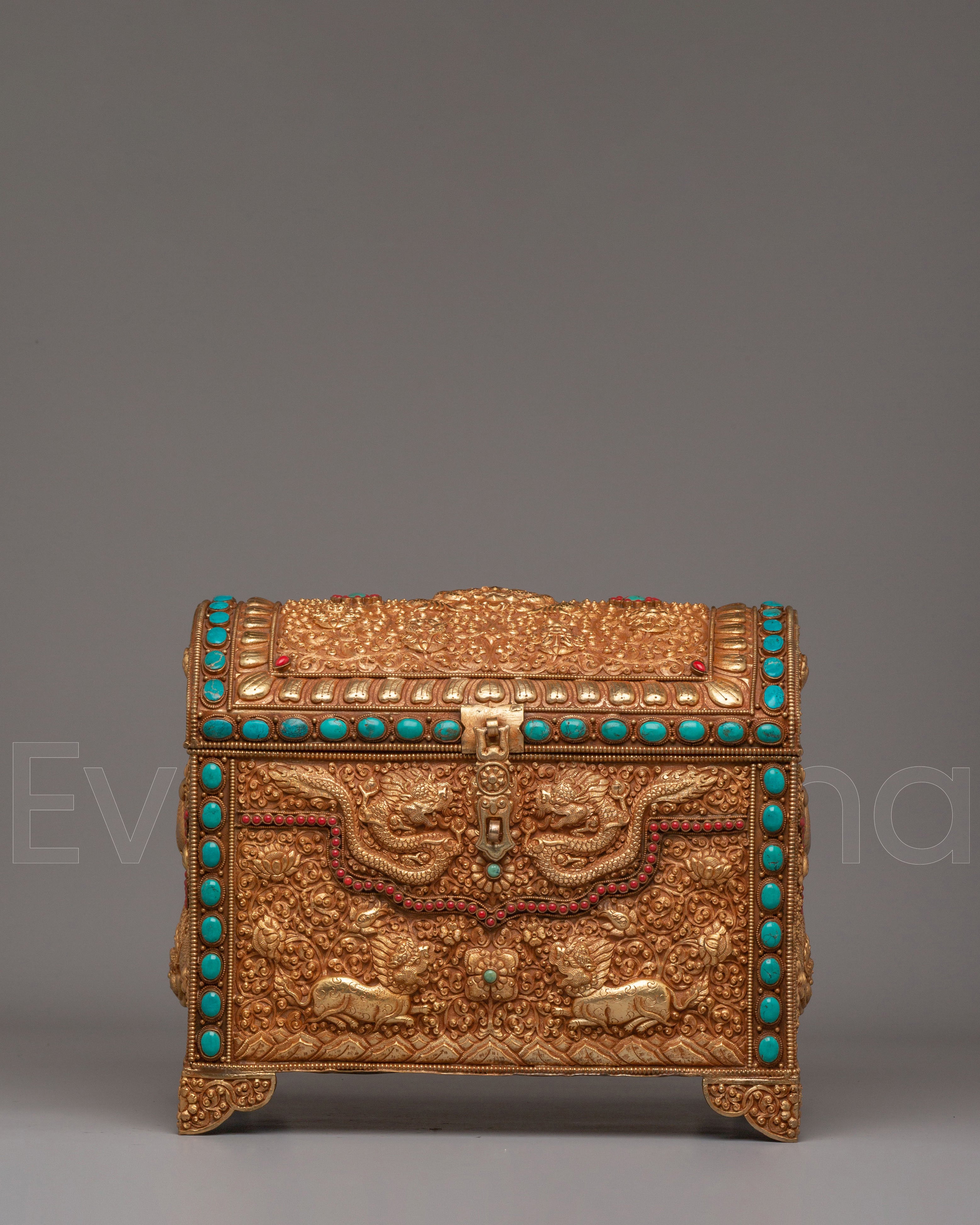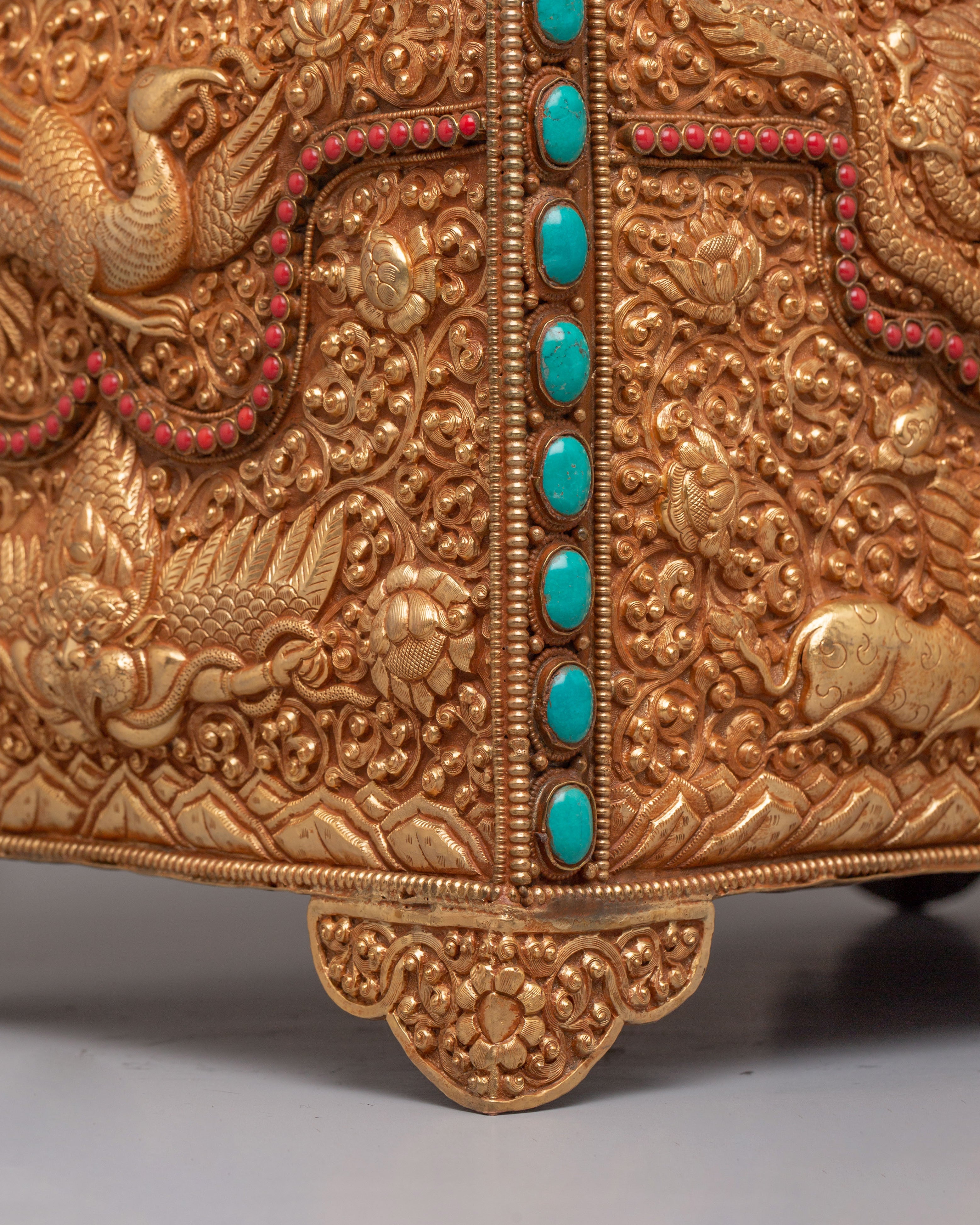 This treasure box is ideal for storing jewelry, precious items, or sacred objects, while also serving as a beautiful decorative piece. Its luxurious gold-plated copper body and gemstone embellishments make it a standout addition to any room, adding elegance and a touch of Tibetan heritage. Whether placed in the living room, bedroom, or office, it enhances the décor and becomes a treasured item for years to come.