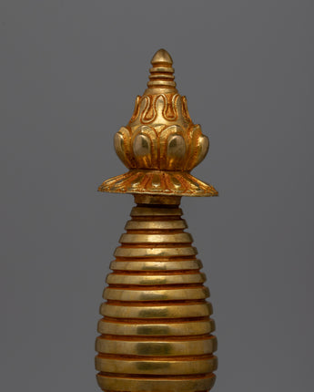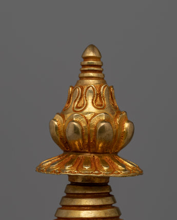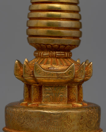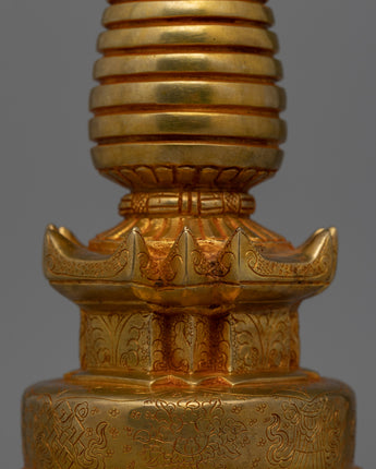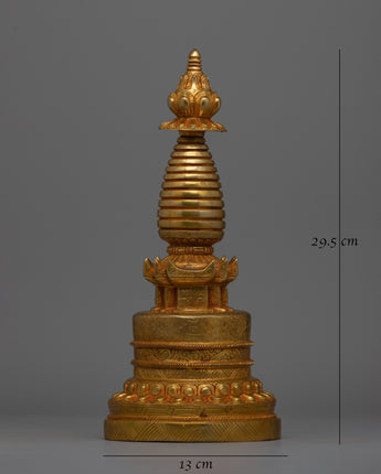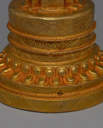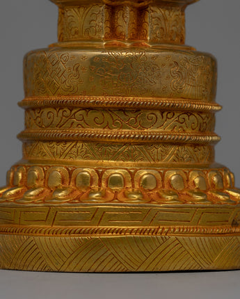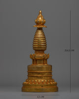 This Stupa Kadampa , made of copper and stupa is plated with a smooth layer of gold, which symbolizes purity and the sacred energy associated with enlightenment. Gold is often used in religious objects in Tibetan Buddhism to represent divine energy and blessings, it is an outstanding depiction of deep cultural and spiritual value. As a Kadampa-style Buddhist stupa, it is a powerful symbol of enlightenment and serenity, reflecting calm and wisdom. The gold plating creates a sense of sacredness, while the detailed Buddhist artwork incorporates Dharma teachings, making it an effective addition to any spiritual or beautiful setting. With its exquisite design and cultural significance, this stupa is more than just a work of beauty; it is also a beacon of spiritual direction.