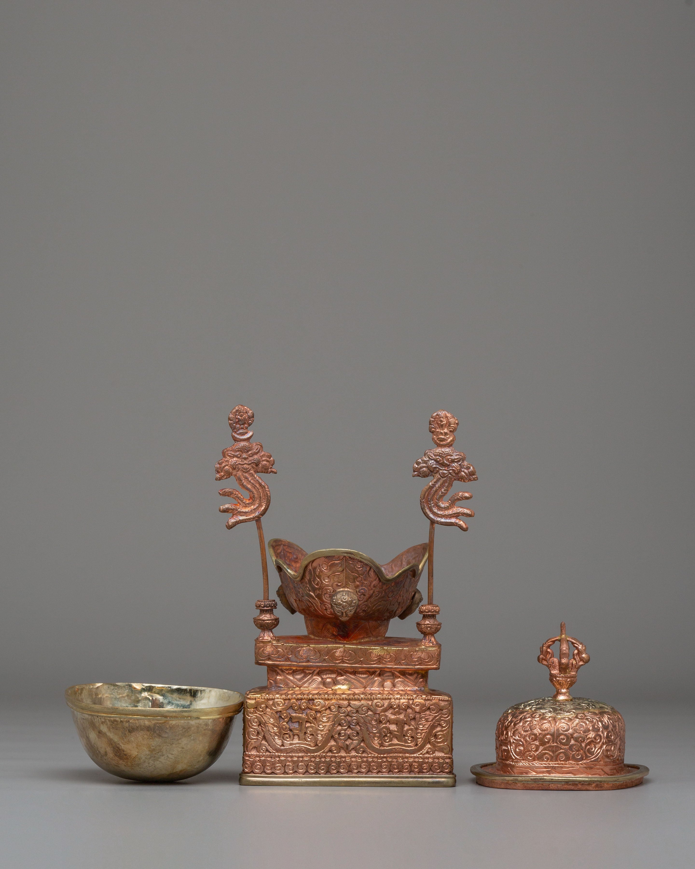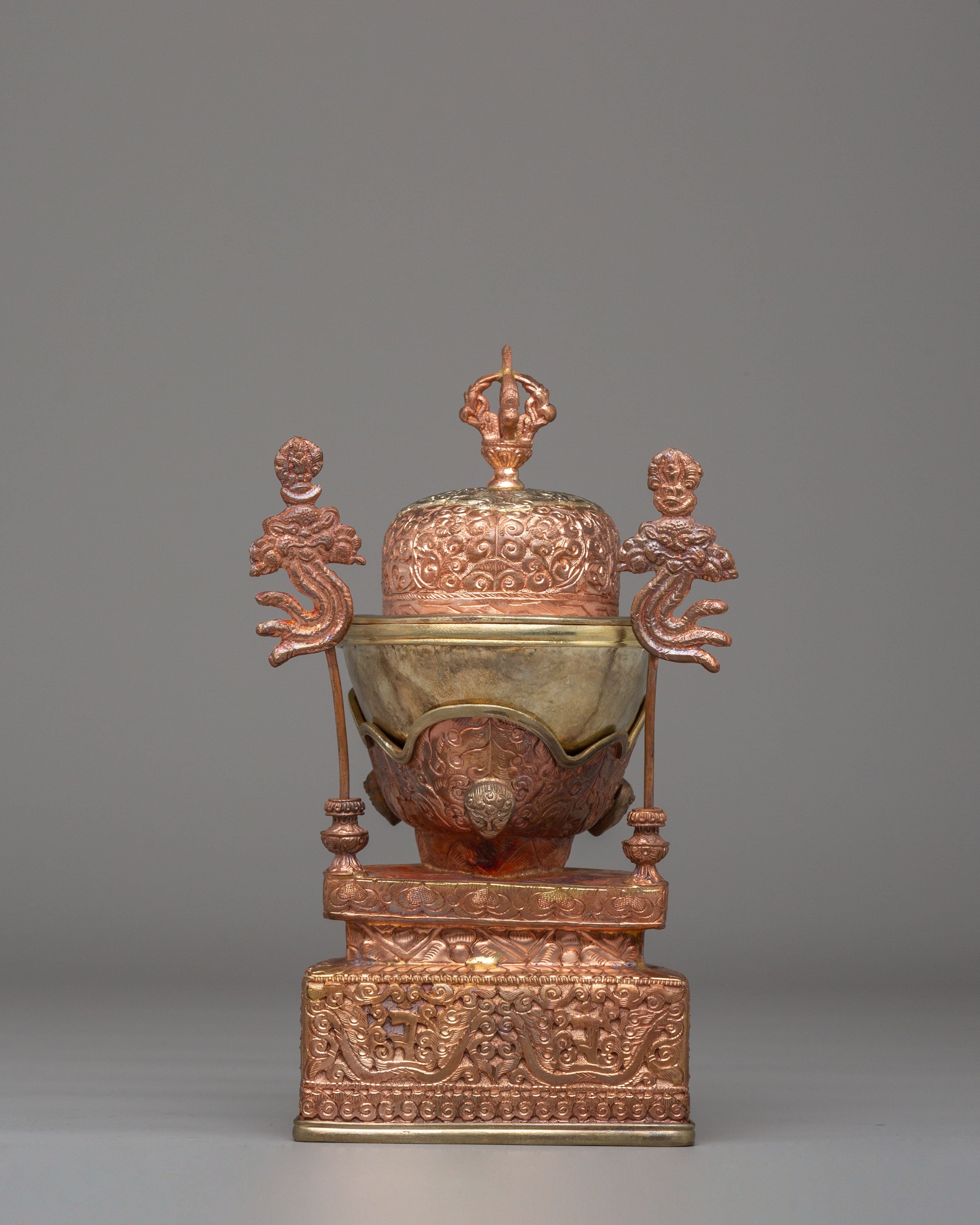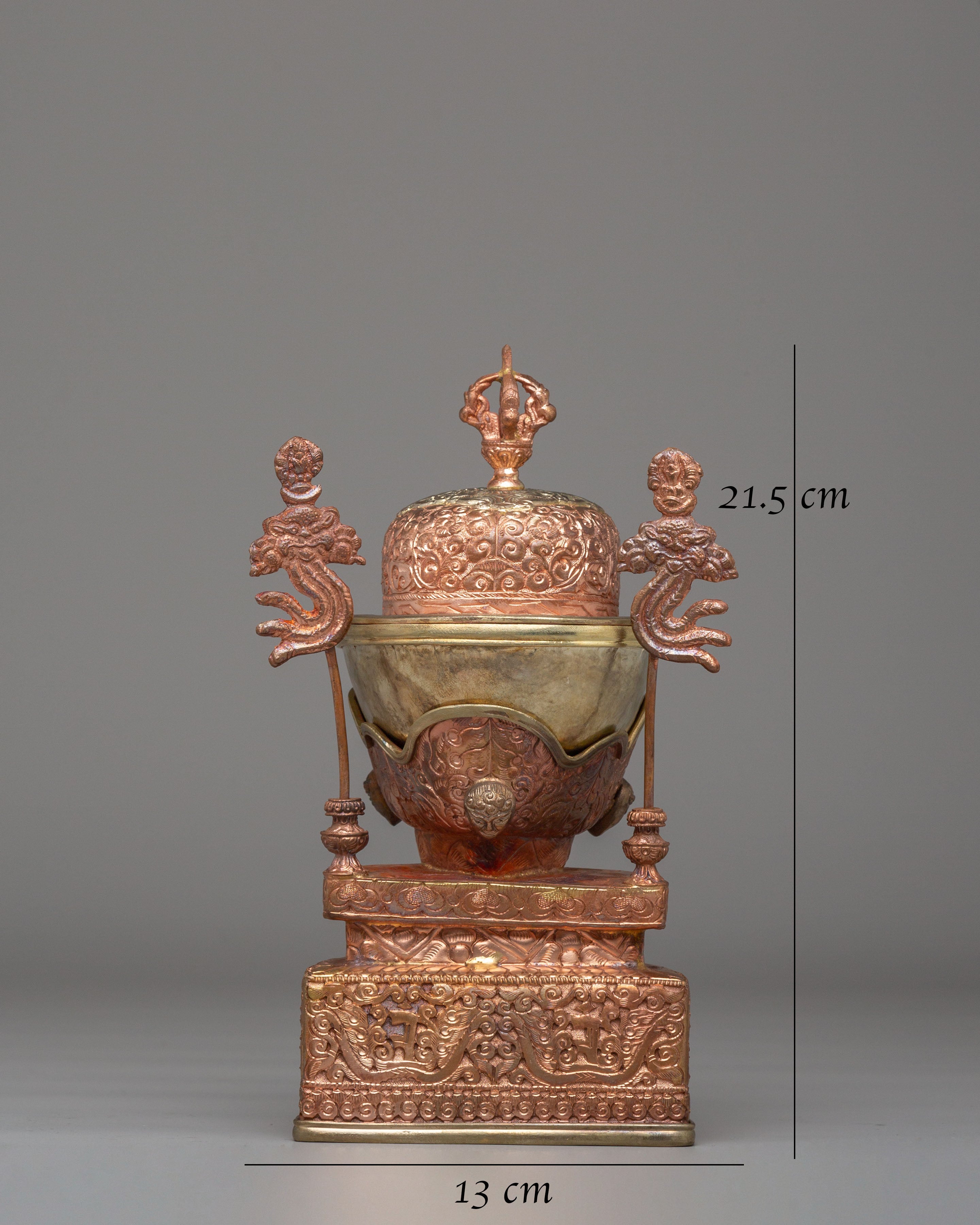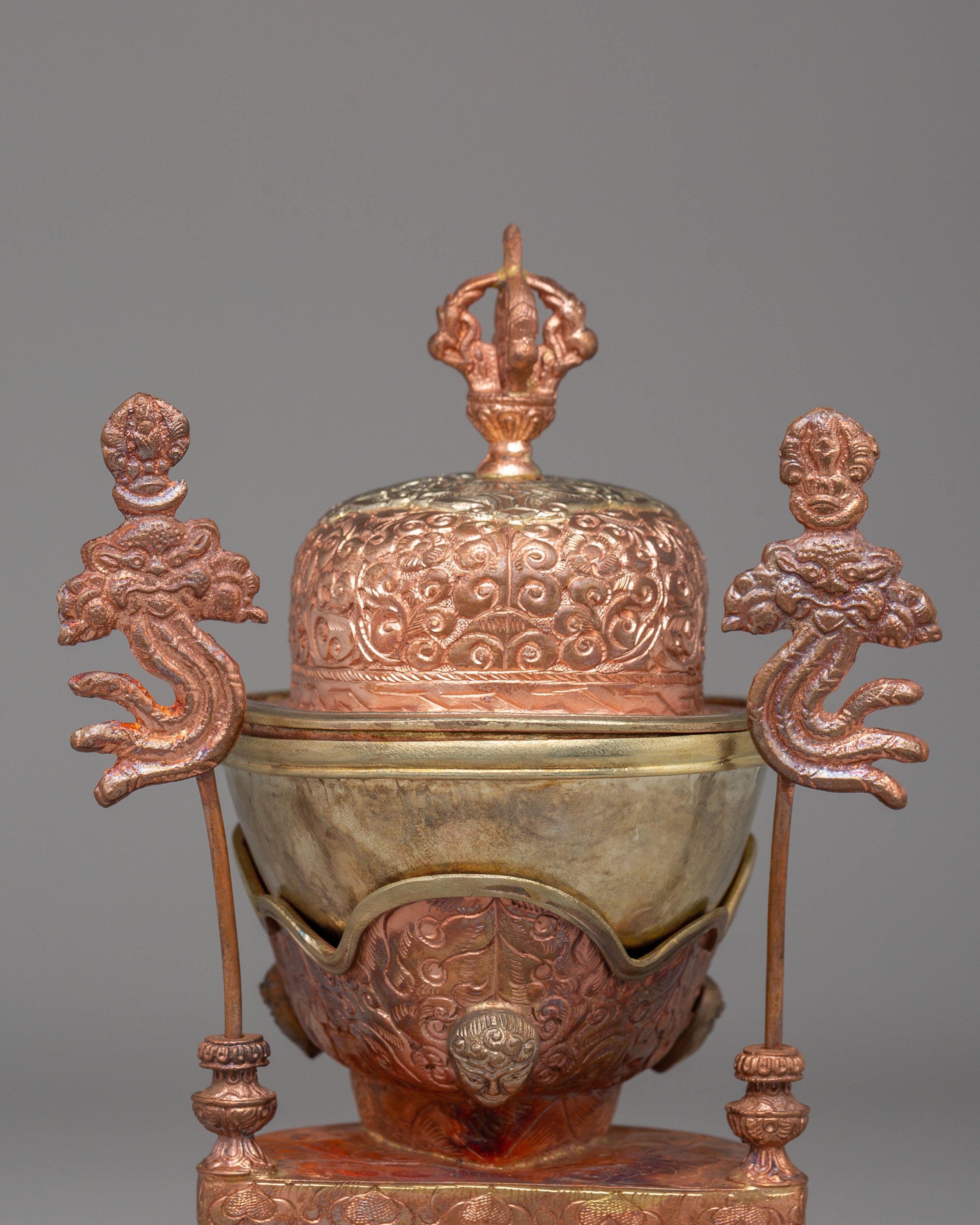This Kapala Set serves as a spiritual tool in tantric practices, allowing practitioners to offer symbolic gestures of devotion to the divine. The copper body, combined with the spiritual symbols, infuses each ritual with the energy of transformation, peace, and enlightenment. Placing the Tibetan Kapala set on your altar or using it in ritual ceremonies encourages a deeper connection with Buddhist teachings, while fostering a profound sense of inner peace and spiritual awakening. It is an ideal tool for anyone seeking to enhance their meditation or spiritual practice.