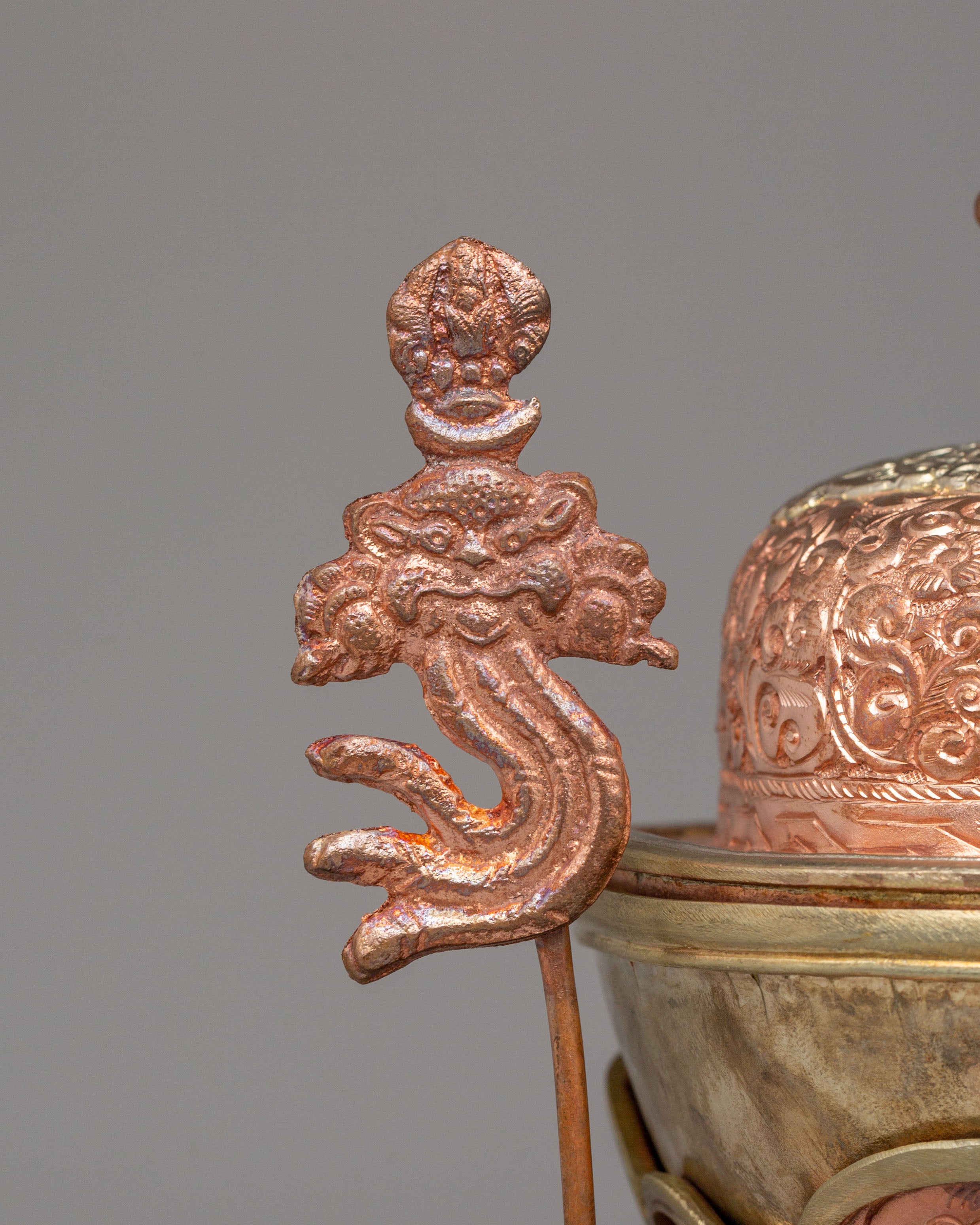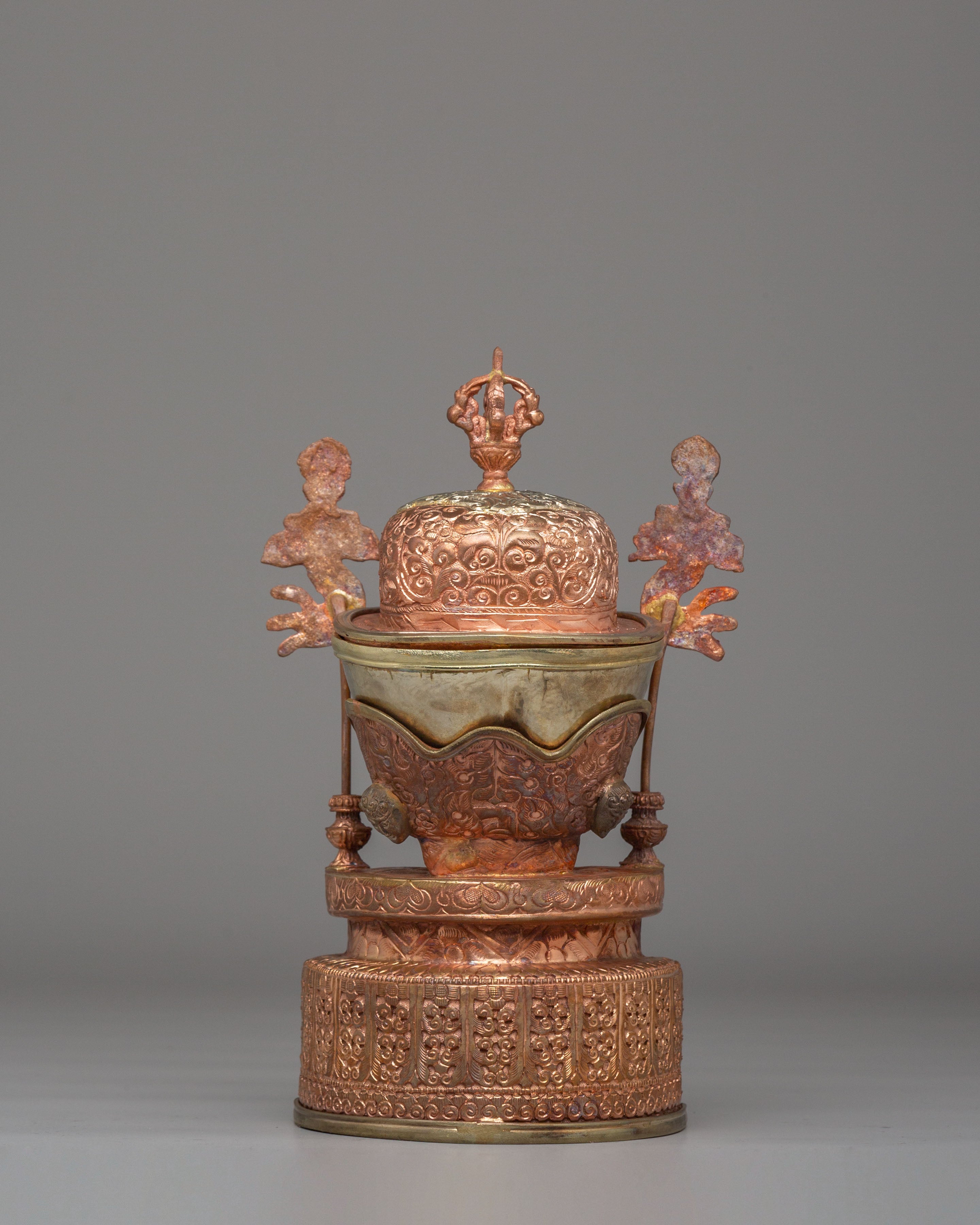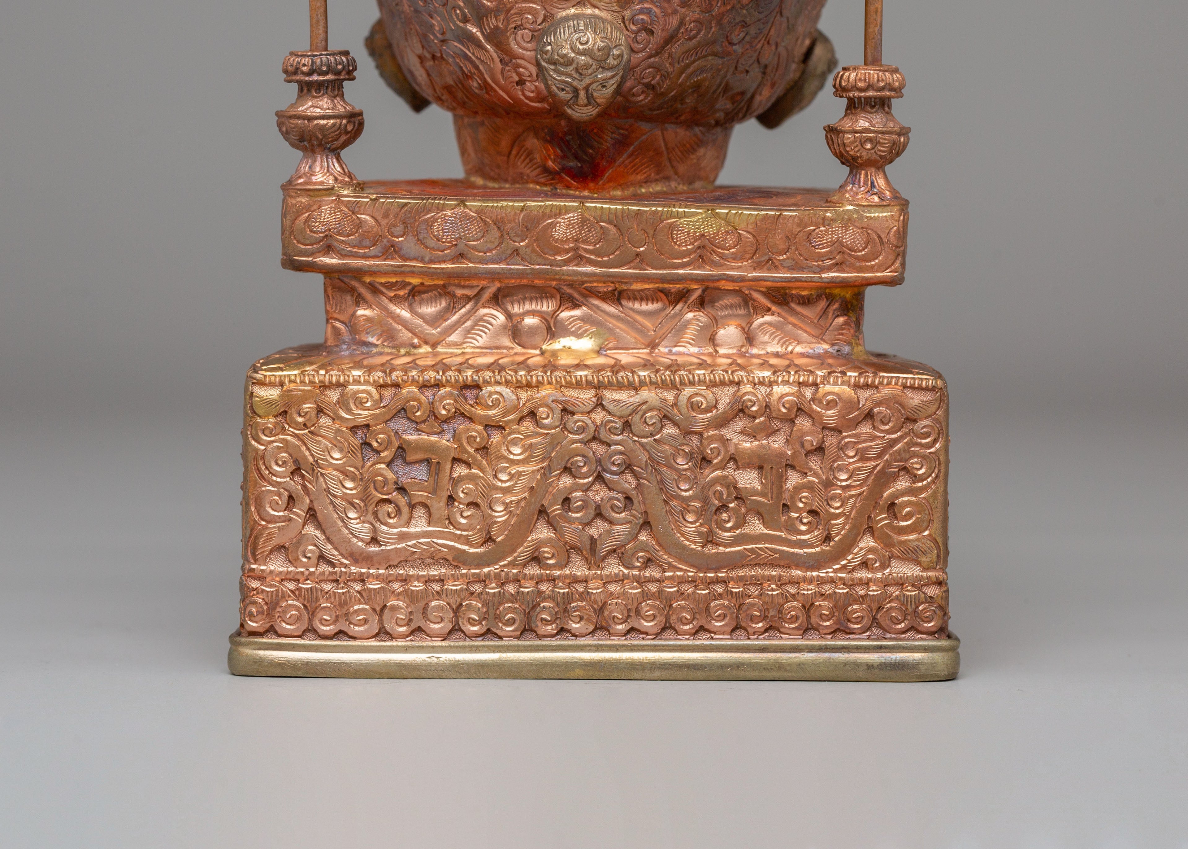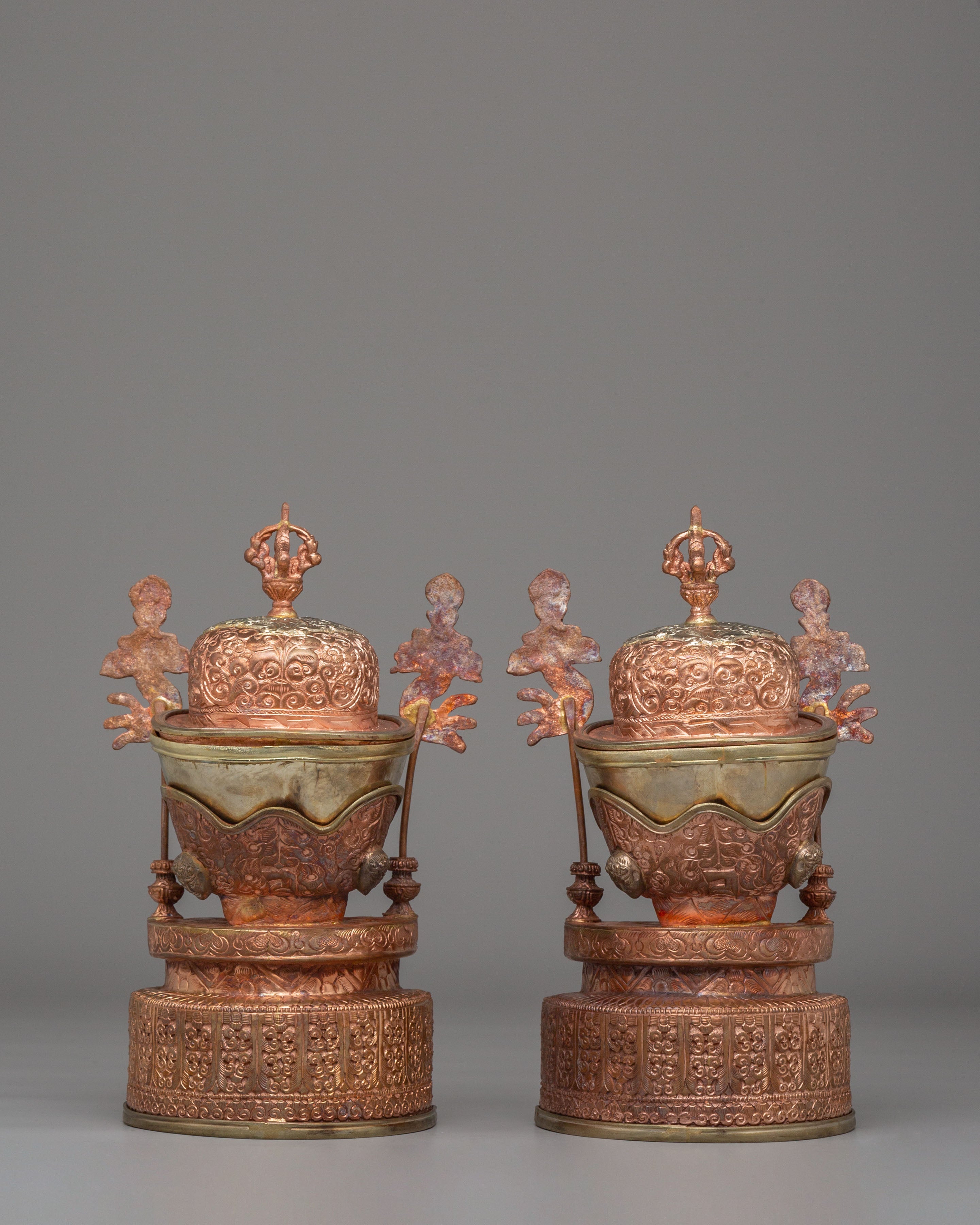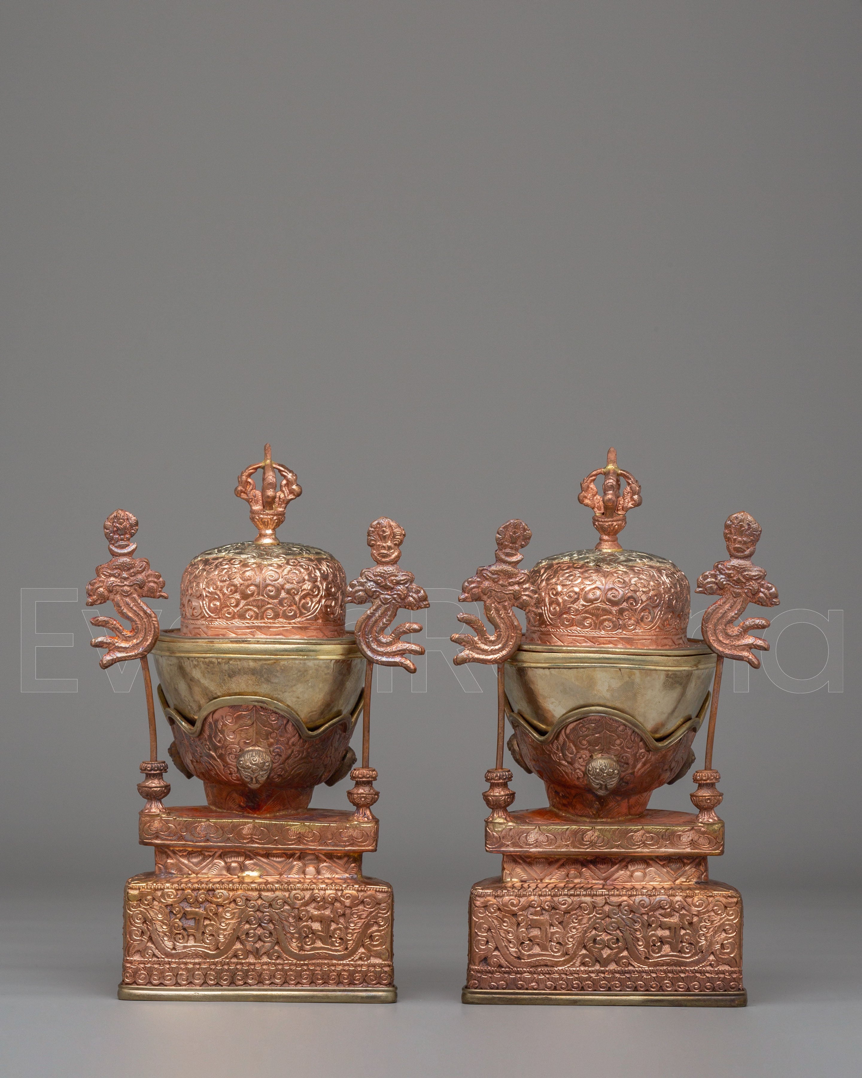 This Kapala Set serves as a spiritual tool in tantric practices, allowing practitioners to offer symbolic gestures of devotion to the divine. The copper body, combined with the spiritual symbols, infuses each ritual with the energy of transformation, peace, and enlightenment. Placing the Tibetan Kapala set on your altar or using it in ritual ceremonies encourages a deeper connection with Buddhist teachings, while fostering a profound sense of inner peace and spiritual awakening. It is an ideal tool for anyone seeking to enhance their meditation or spiritual practice.