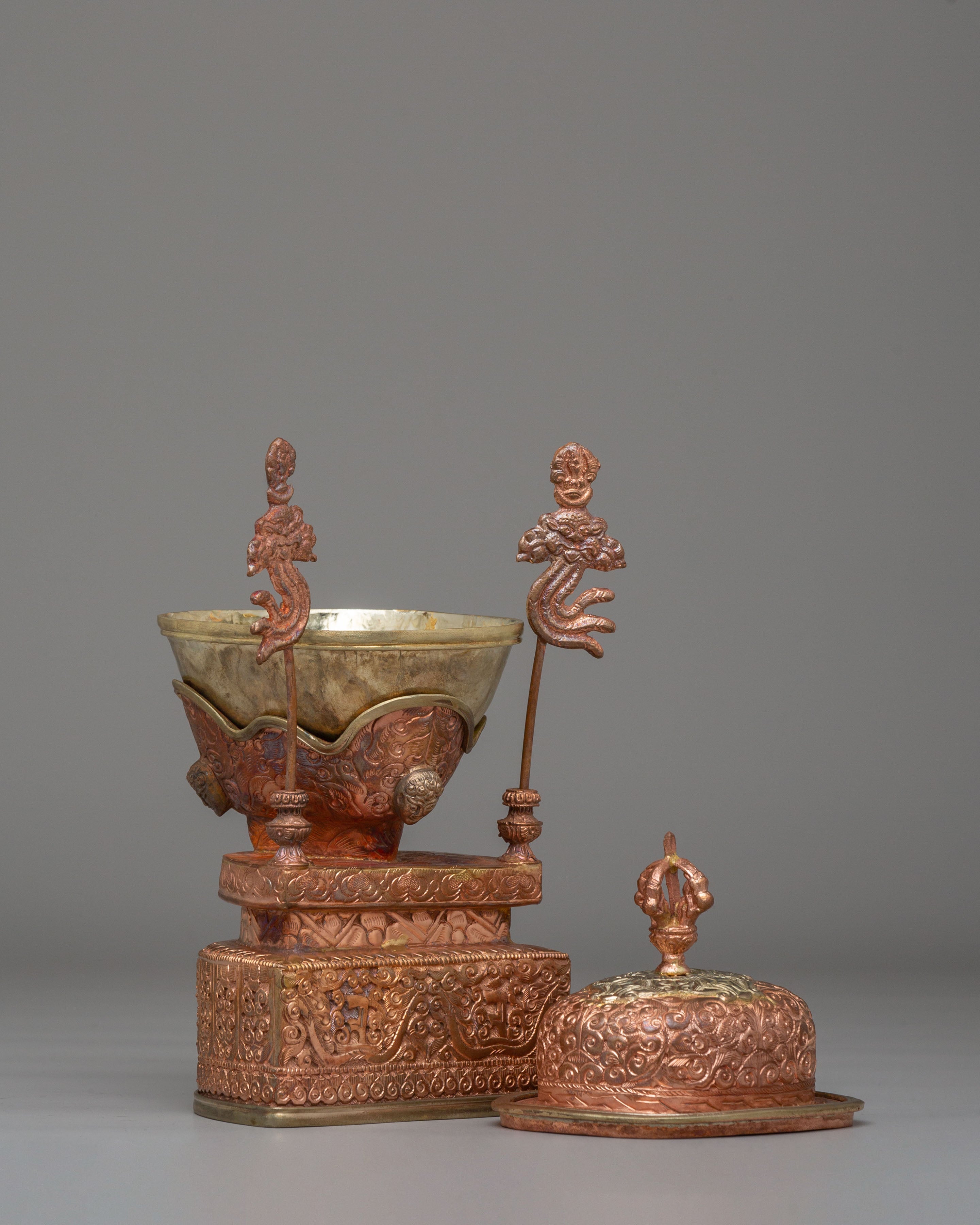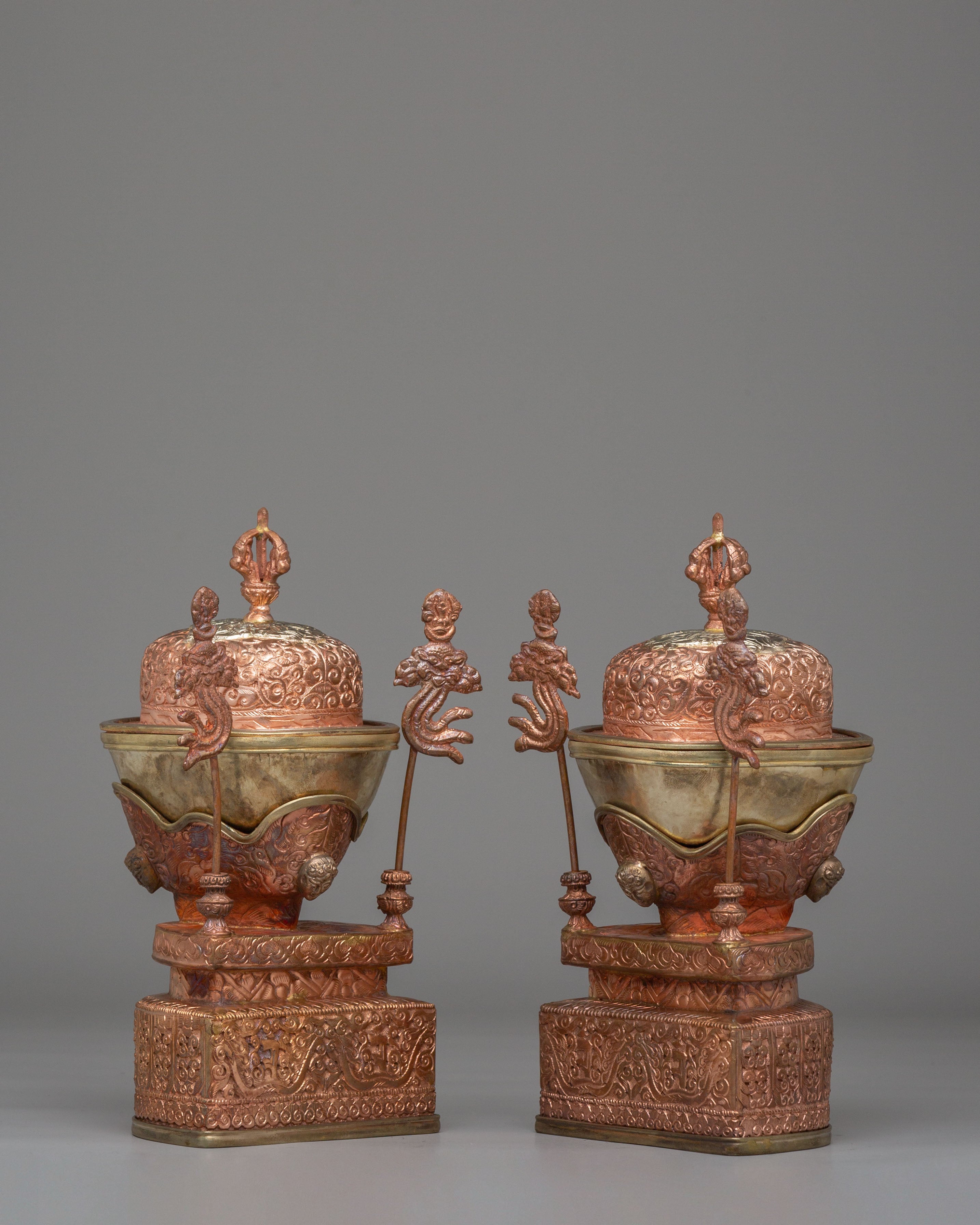 The Kapala set holds the nectar used in higher esoteric rituals. It offers liberation to gods and deities, ensuring their devotion. The offerings are said to be transformed into the Wisdom Nectar, a liquid form of the deity's Enlightened Mind.