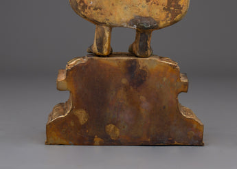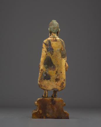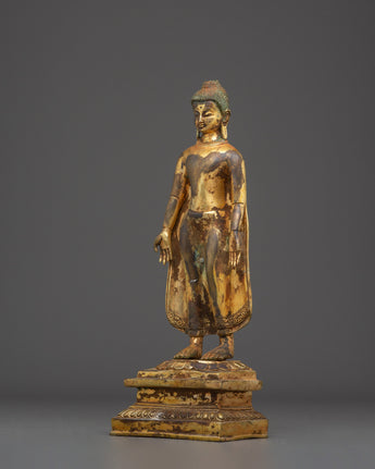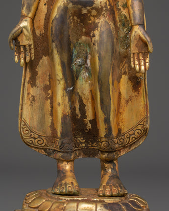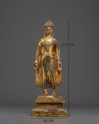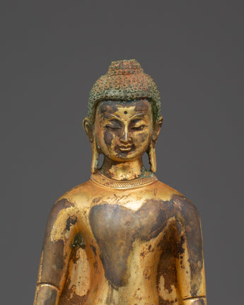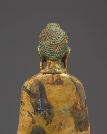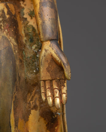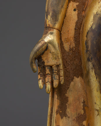 This figure, made of copper and plated in gold, exemplifies traditional Himalayan workmanship and spiritual dedication. The antique finish adds to its sacred beauty, evoking a sense of spiritual authenticity and depth. The Maitreya Buddha is honored as a symbol of prosperity, goodwill, and enlightenment. This masterfully carved sculpture is not only a stunning ornamental piece, but it also provides a source of positive energy and spiritual growth.