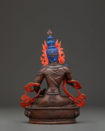This Handmade Oxidized Copper Statue of Vajrasattva, also known as Dorje Sempa, stands at 8.9” (22.5cm) in height and 6.3” (16cm) at the base, weighing 1.58 kg. Made from oxidized copper, it features acrylic paintings that enhance its detailed features. Expertly crafted by skilled Nepali artisans, this statue reflects traditional craftsmanship and makes a refined addition to compact altars, meditation spaces, or personal spiritual collections.