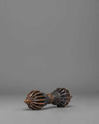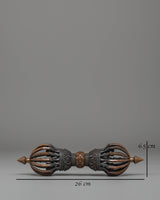 This Handmade Sacred Dorje Vajra is a highly revered ritual object in Tibetan Buddhism, crafted from an oxidized copper body that highlights its traditional character and spiritual significance. Its balanced form reflects the vajra's deep symbolism, representing unshakable clarity, awakened presence, and the power to overcome inner obstacles. The oxidized finish enhances its antique appearance, giving it the depth and presence sought after in authentic Himalayan ritual pieces.
